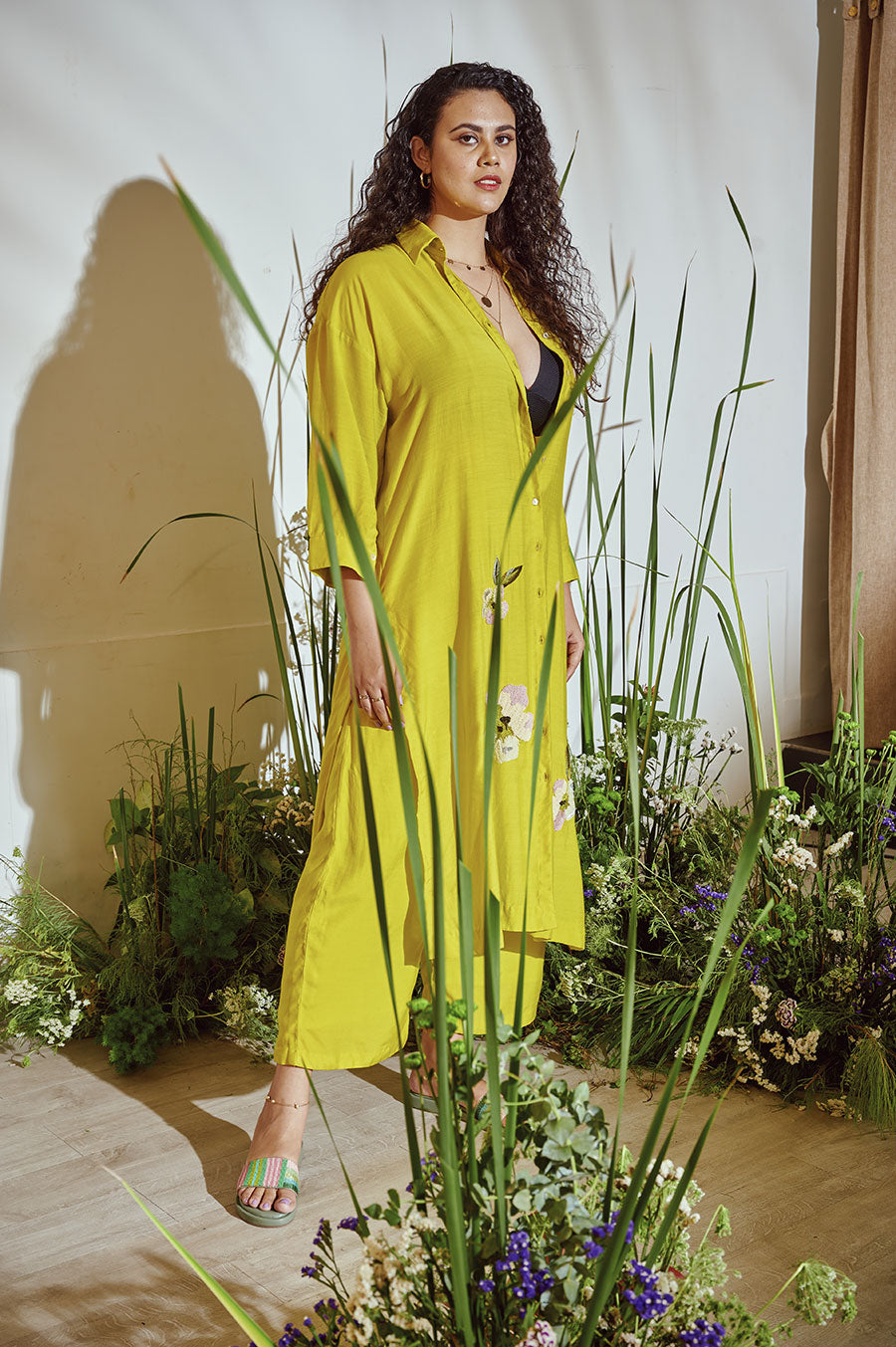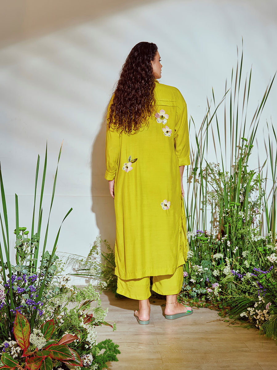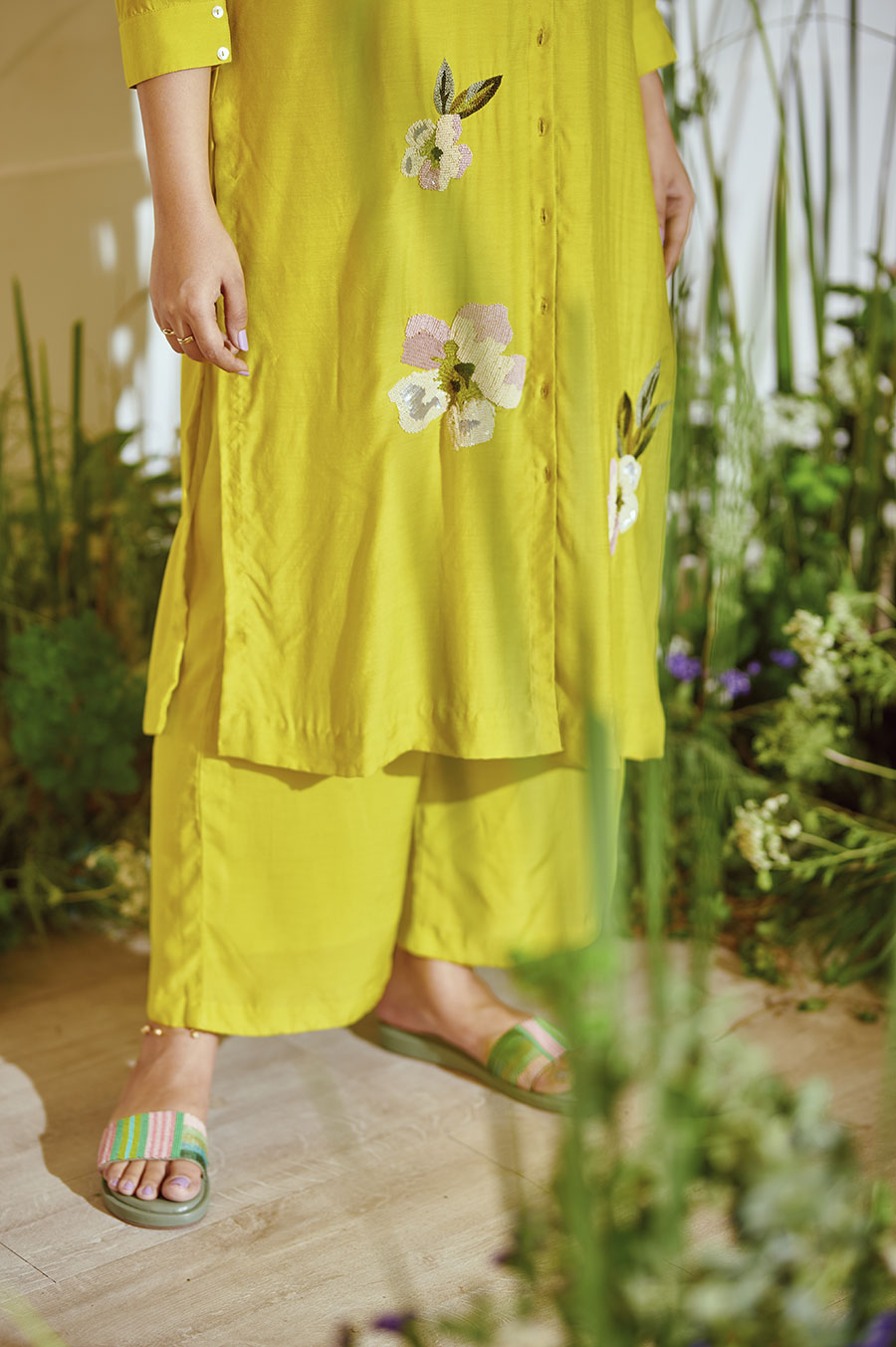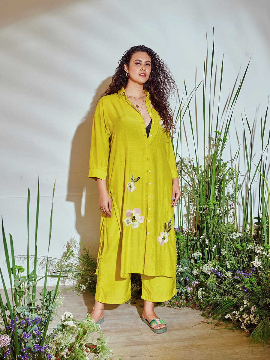 Flowers from the tropical garden, embroidered with intricate details, juxtaposed with the sorbet hue, spring summer is here. The classic kurta and pants in a modern avatar. Relaxed, comfort chic, styled with jewelled flats, layered chains, it’s a must have in your holiday wardrobe.