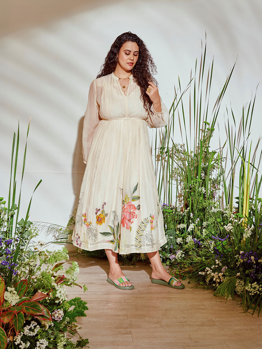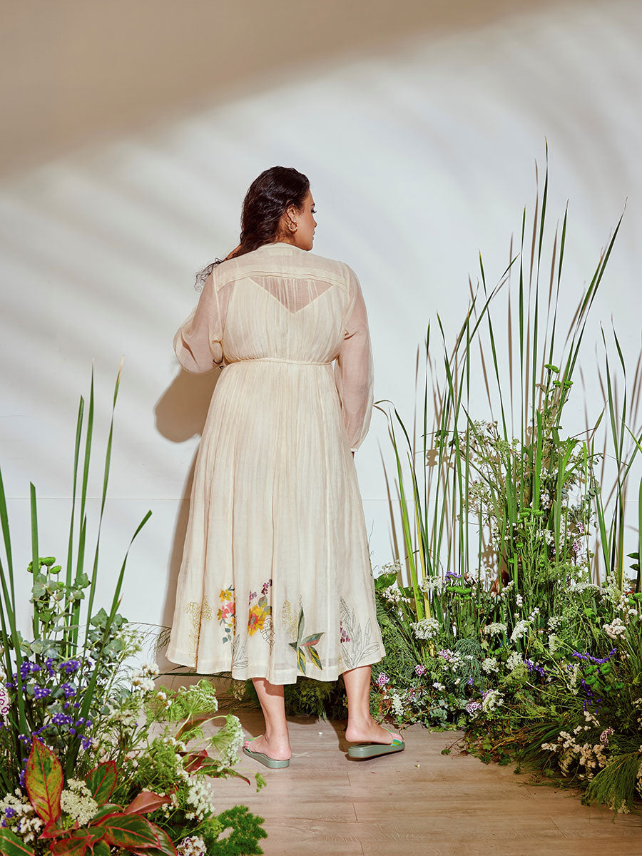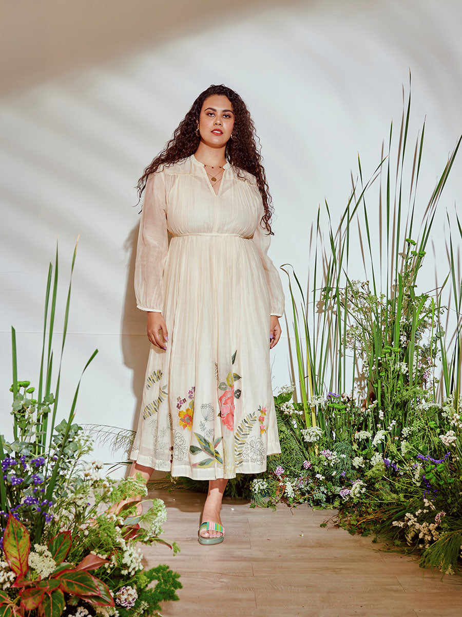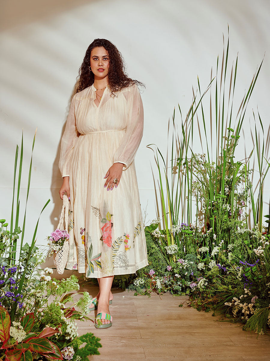 Inspired by a tropical garden, the intricate embroidery in pop hues evokes a spring summer feel. This elegant silhouette, style with gold studs, jewelled flats, sunglasses, and you have your perfect brunch look.