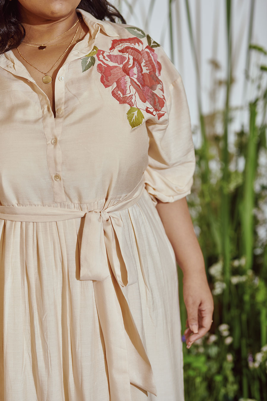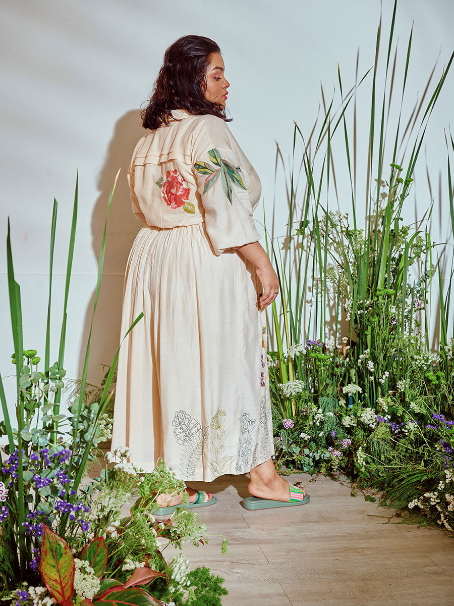 Inspired by a tropical garden, the intricate embroidery in pop hues evokes a spring summer feel. This elegant silhouette, style with gold studs, jewelled flats, sunglasses, and you have your perfect holiday travel look.