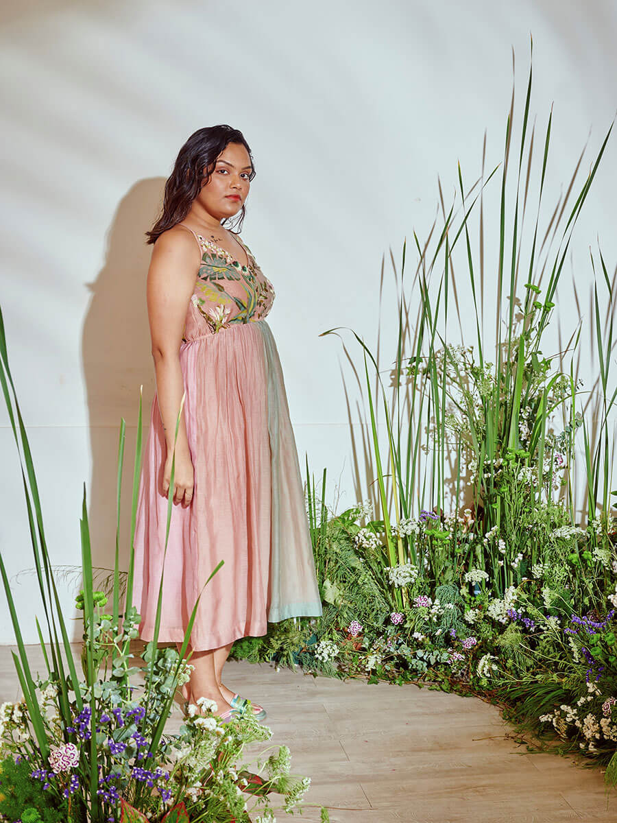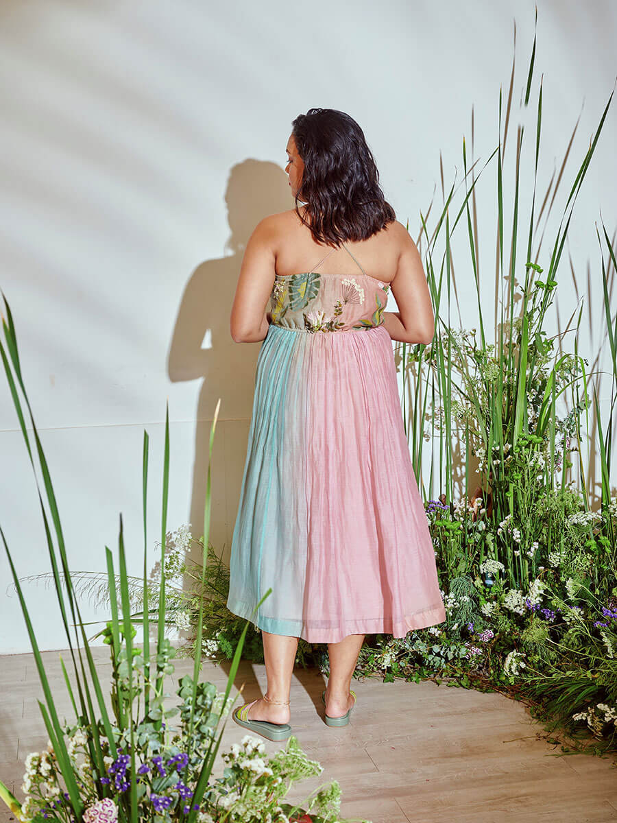 Colours of nature ombré dyed to give that spring summer feel, highlighted with intricate floral embroidery. A fun, relaxed dress, style with jewelled flats, gold hoops, sunglasses, it's the perfect brunch look.