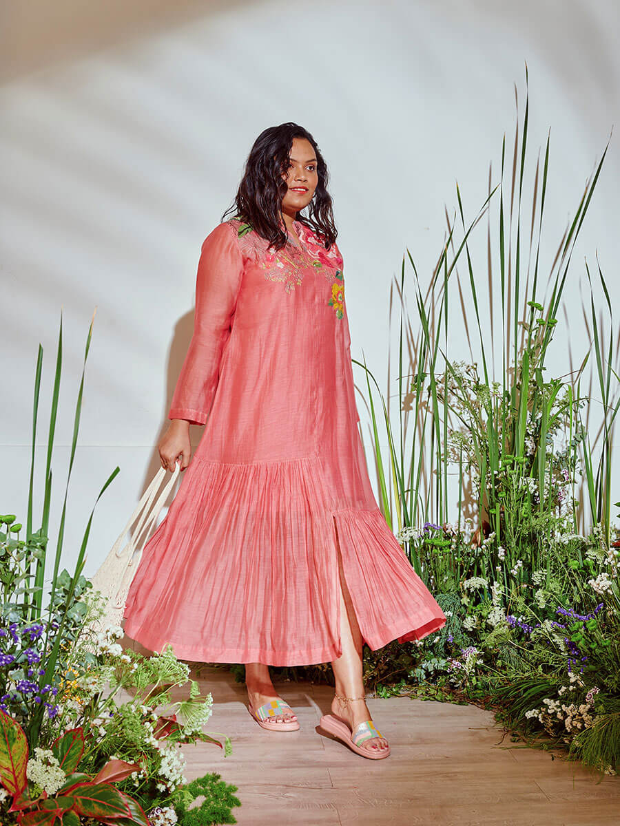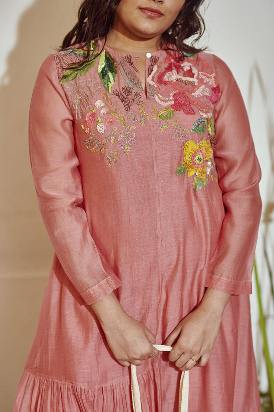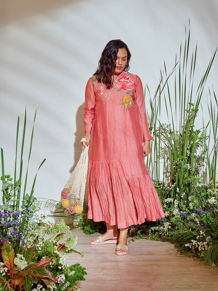 A relaxed, breezy silhouette, which can be styled western or in an Indian look. Inspired by a tropical garden, the intricate embroidery in pop hues evokes a spring summer feel. Style with jewelled flats, gold hoops, a hint of coral on the lips.