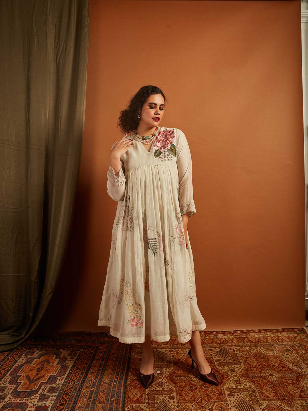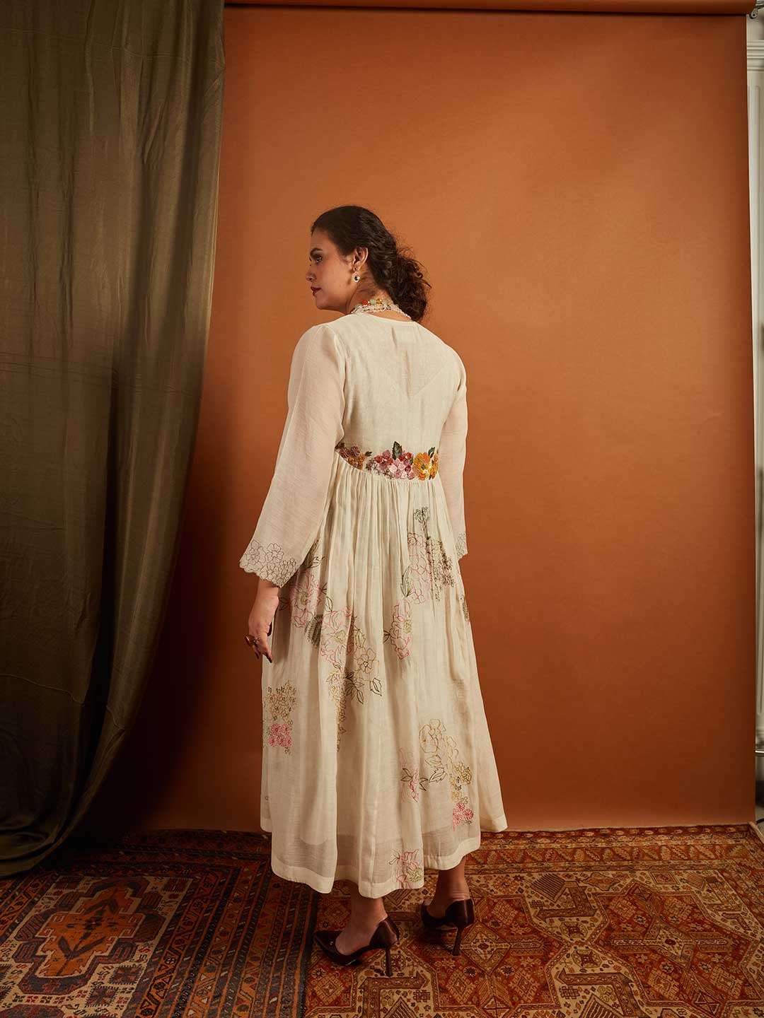 Hydrangea & Floral Line Emb. Flare Dress (White)