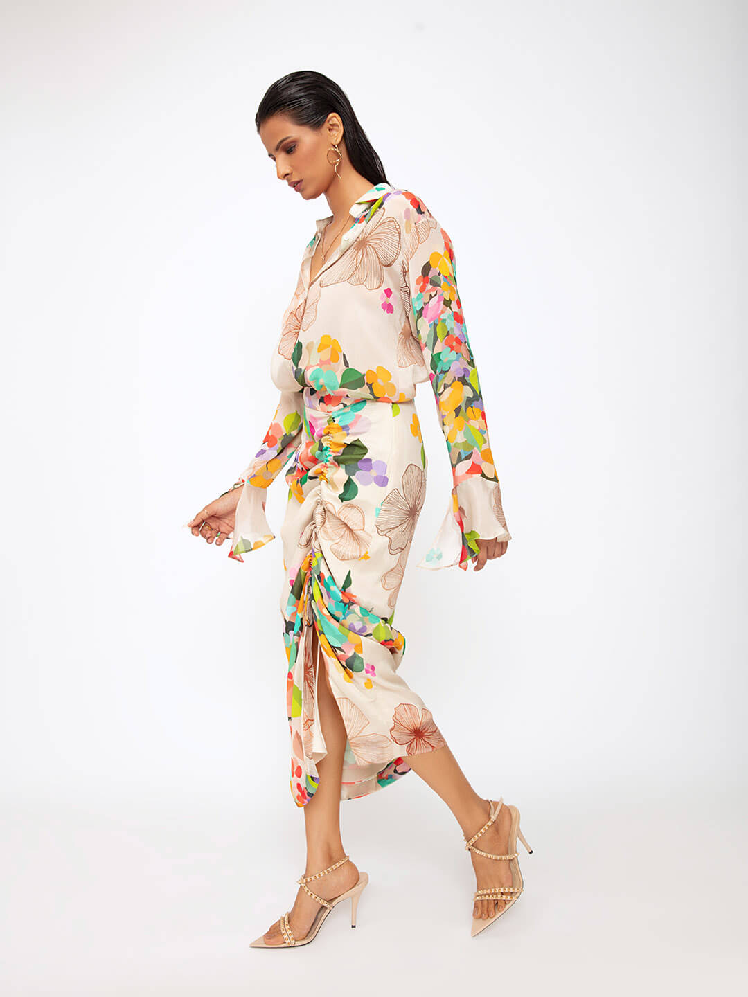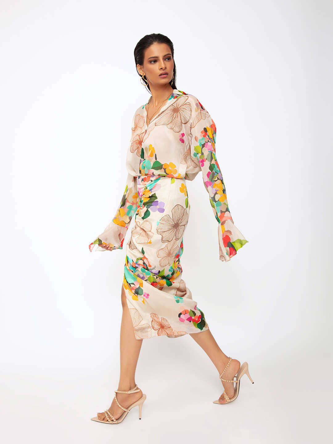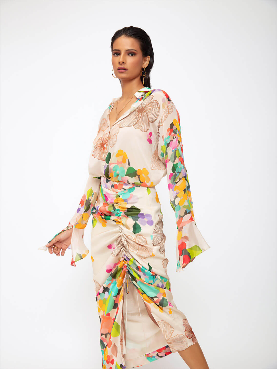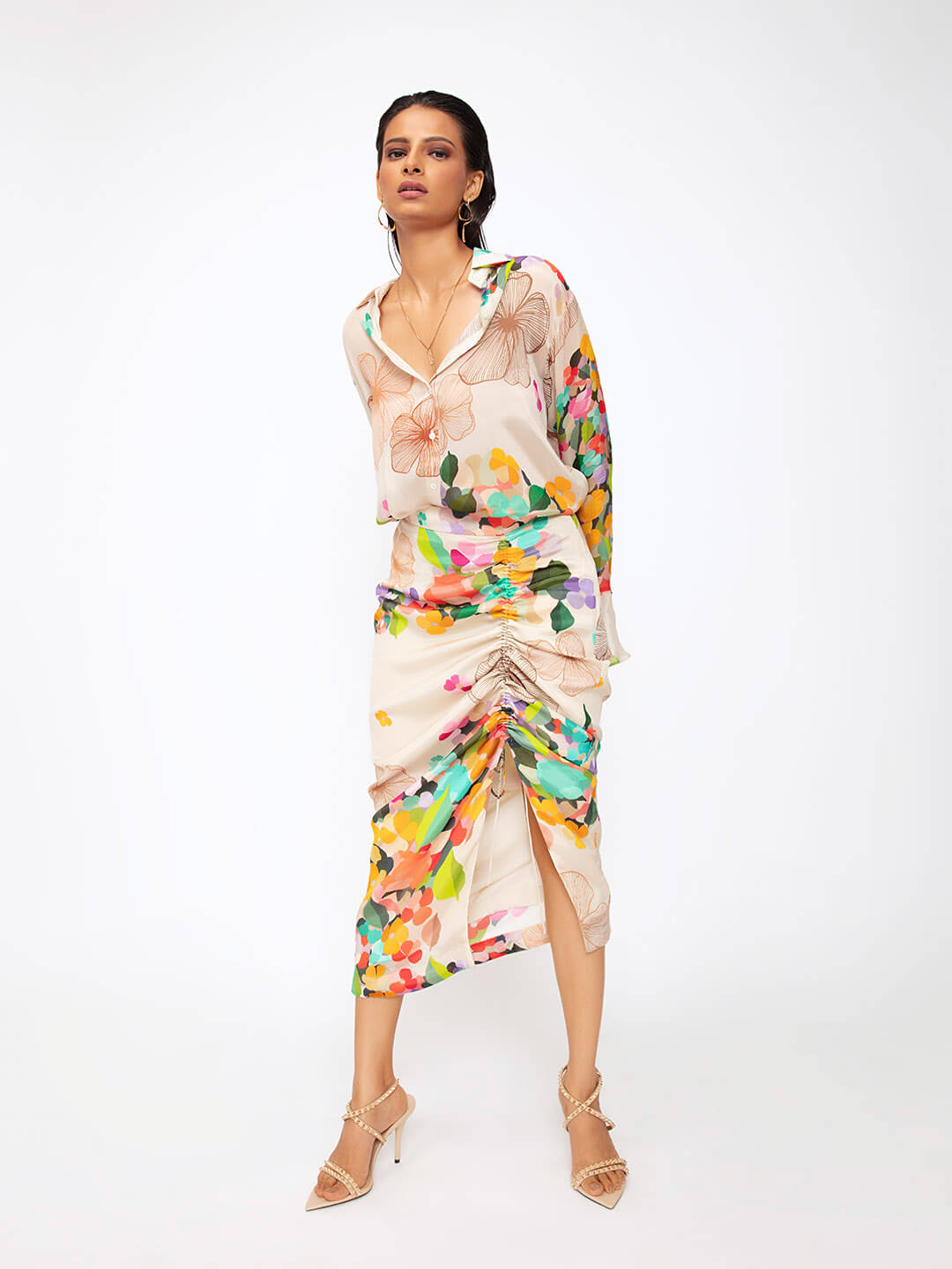 A classic pencil skirt in a pretty floral print with a gather detail. The high slit, and delicate gathers give it a feminine yet sexy appeal.