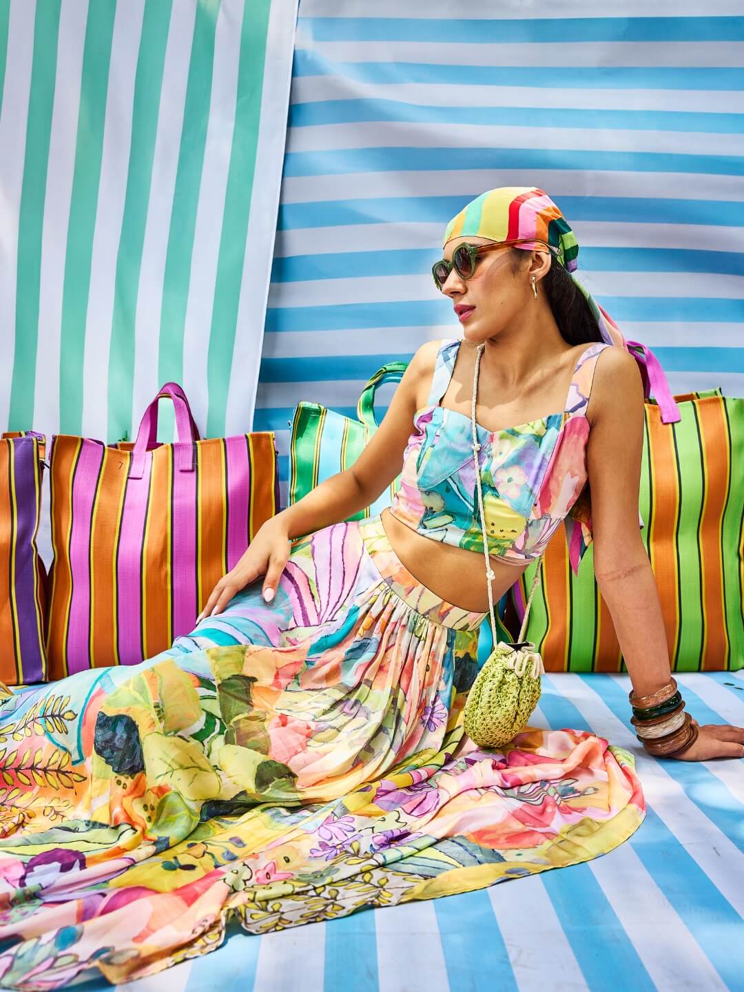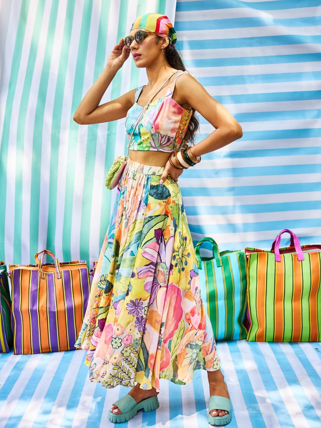 Art meets sunkissed florals. Expressive brushstrokes and blurred shapes in pop hues, creates an impressionist artwork of a spring garden. The high waist bias skirt is a versatile silhouette, perfect for brunch, dinner date, or your resort travels. Style it with a crop top, a white shirt, or a vest, add tan heels, metallic jewellery and dewy make up.