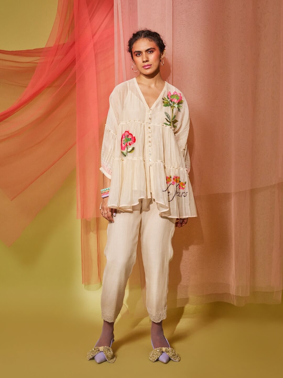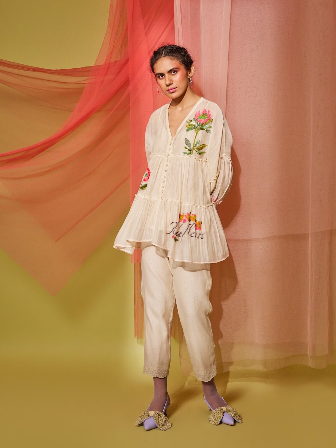 Floral Poster Tier Top + Pants (White)