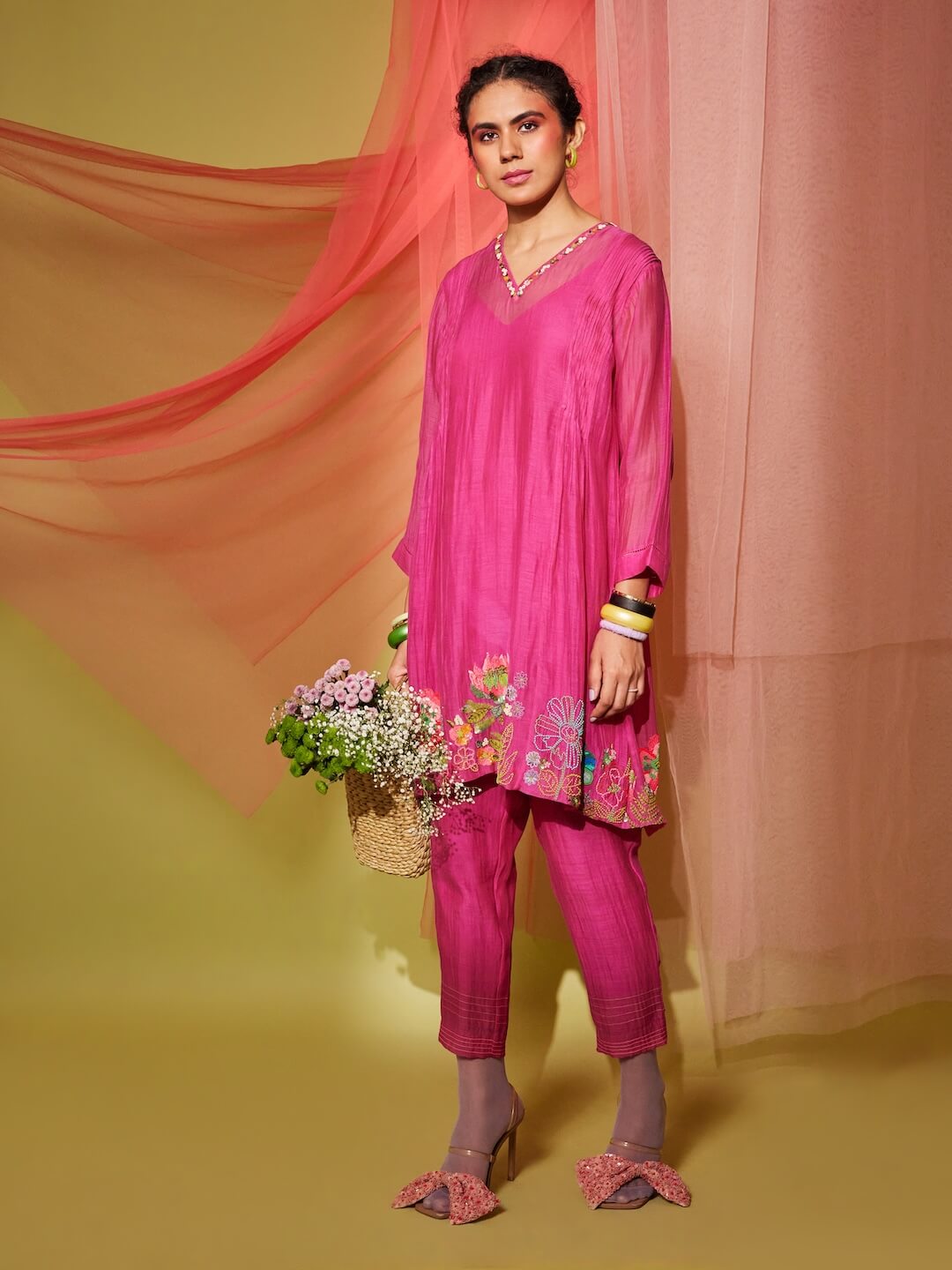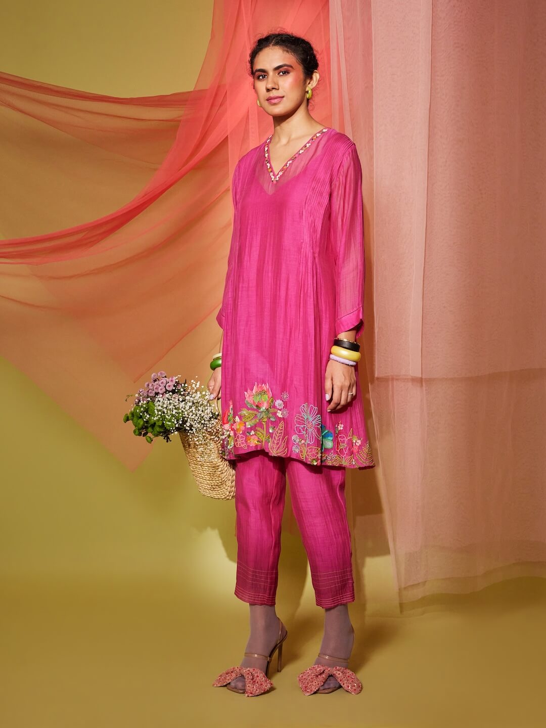 Floral Poster V Neck Kurta + Pants (Pink)
