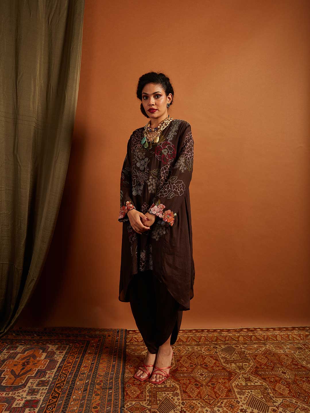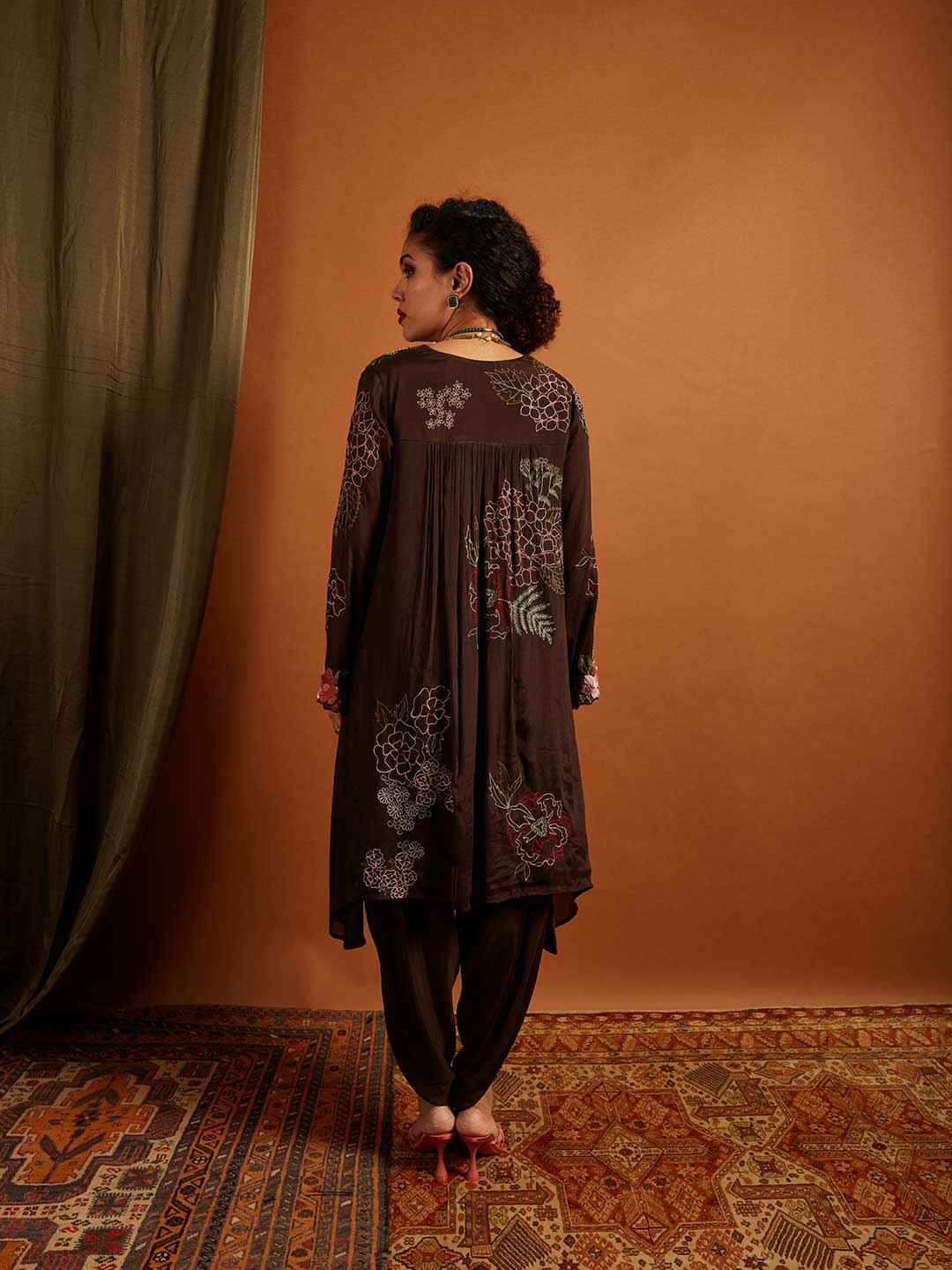 Hydrangea & Floral Line Emb. Gather Back Kurta + Pants