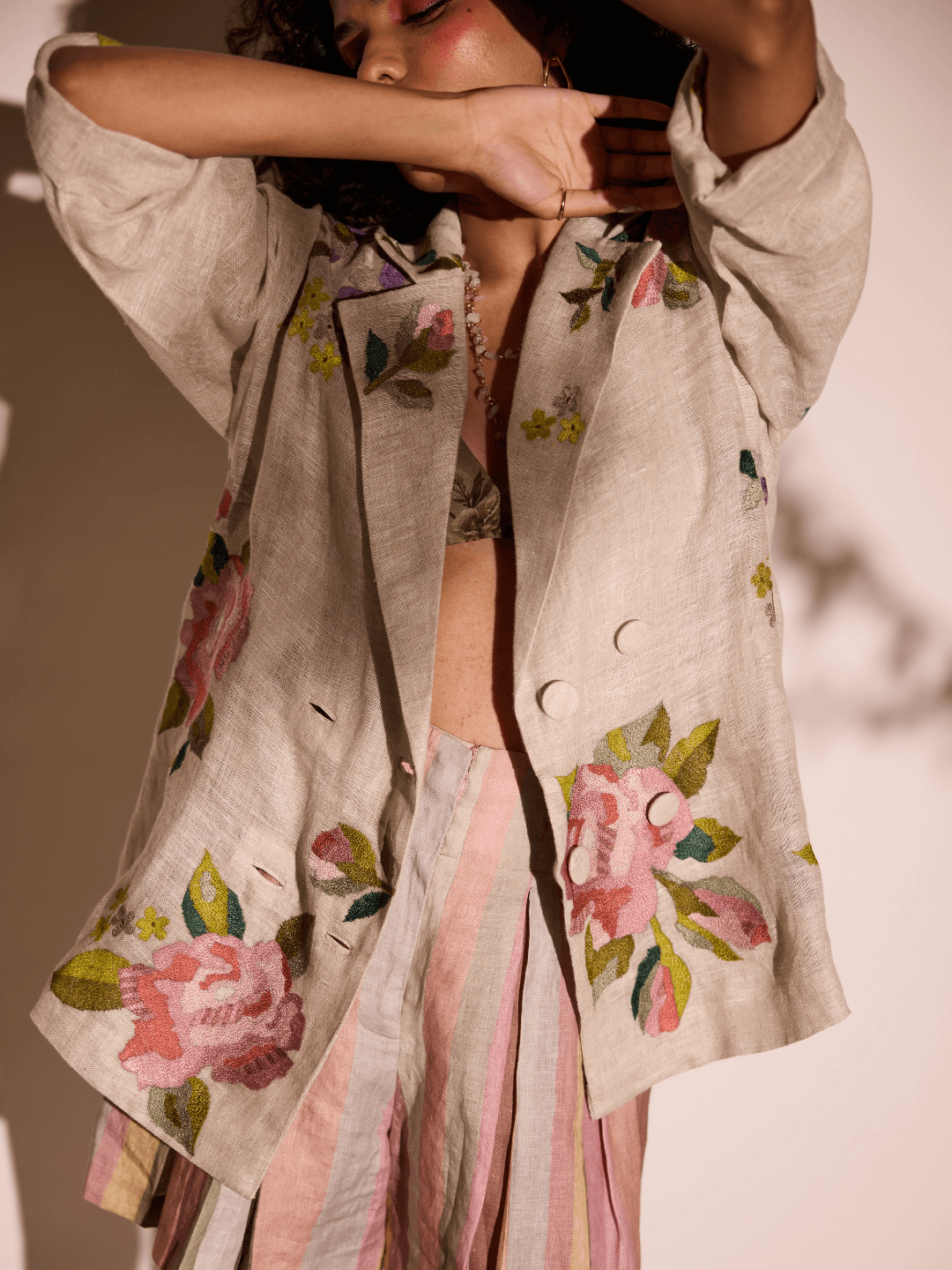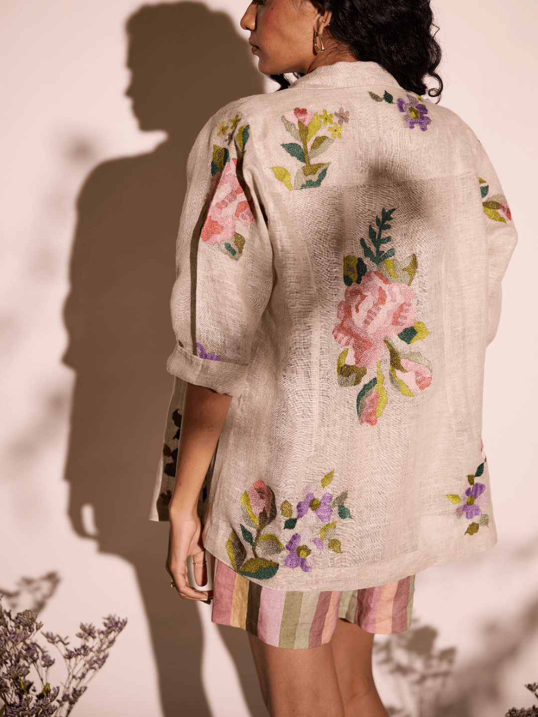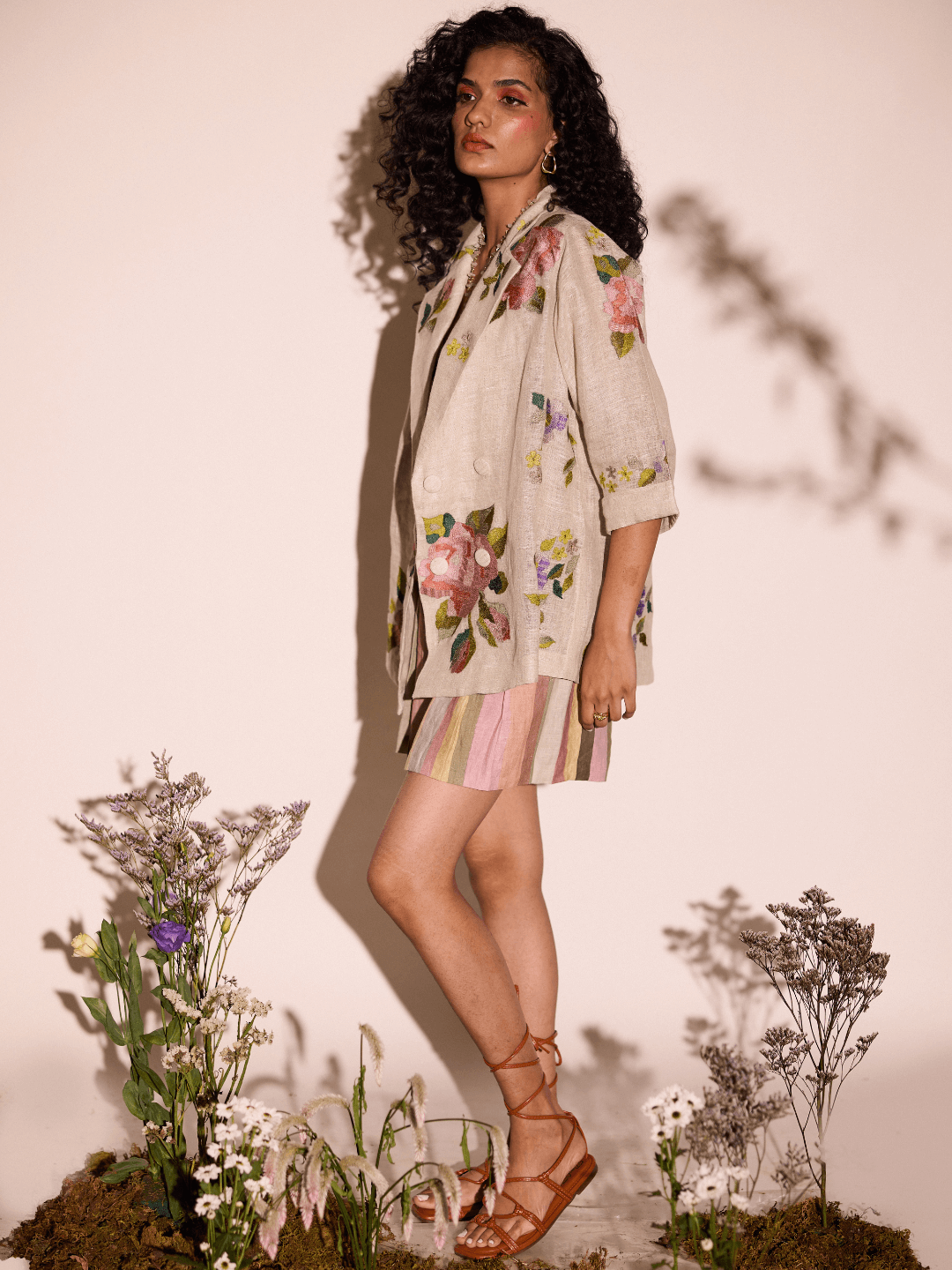 Art meets embroidery with this linen blazer. Watercolour roses transformed into intricate thread embroidery juxtaposed with high waist geometric stripe shorts, makes this set a versatile look.
