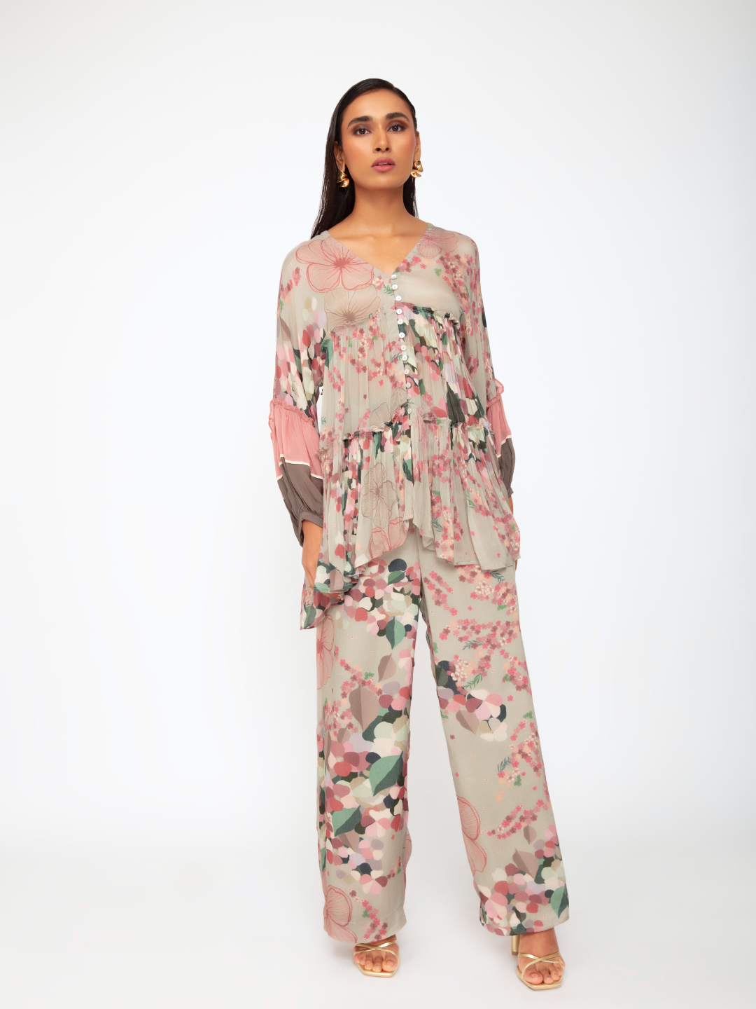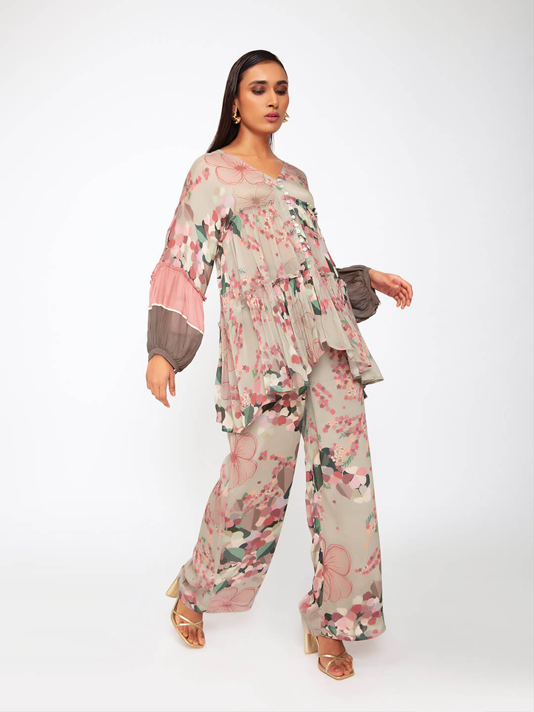 The perfect brunch look, stylish & comfortable. A lightweight flared tunic top, with wide leg pants, in a delicate floral print. Wear the set as a co-od look, or wear each piece individually.