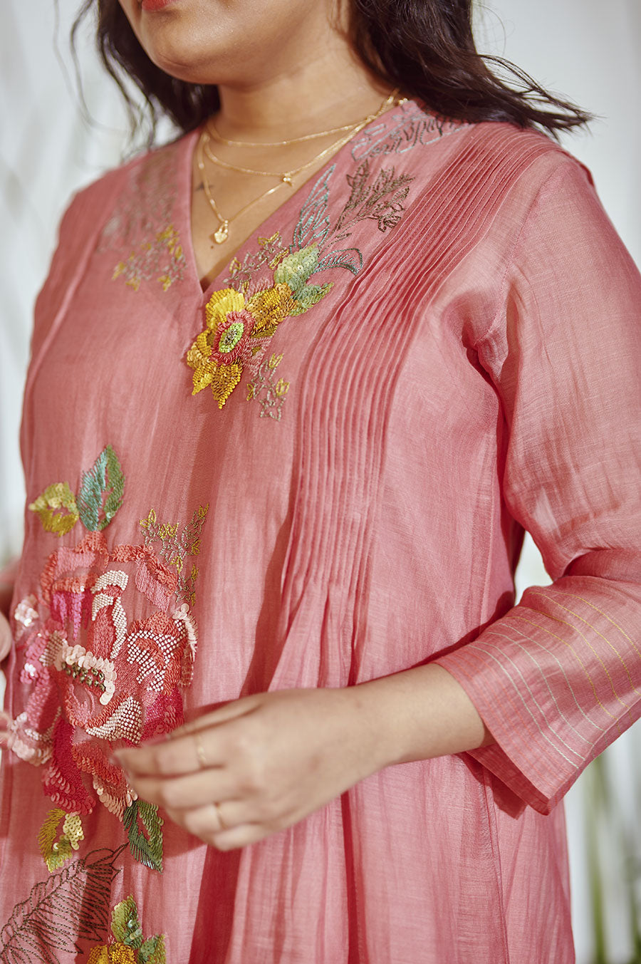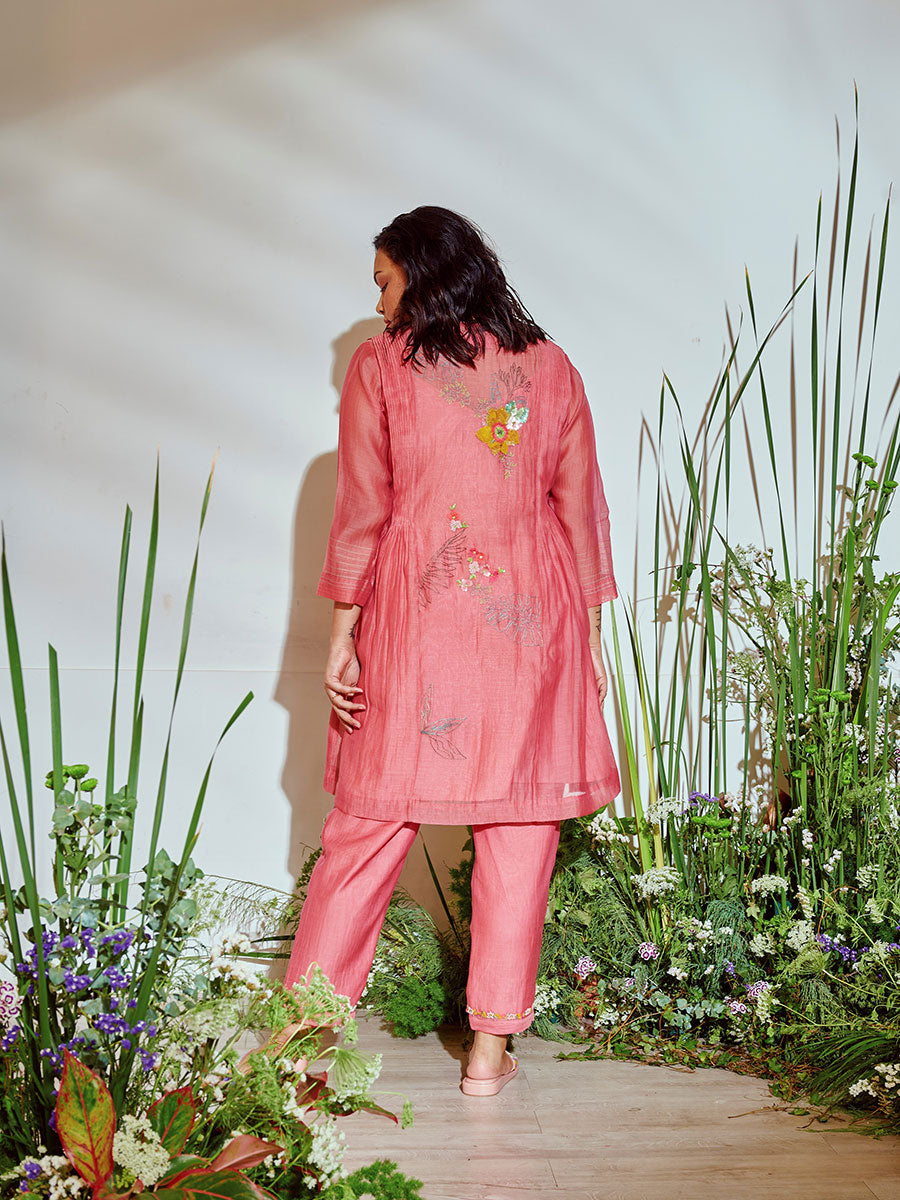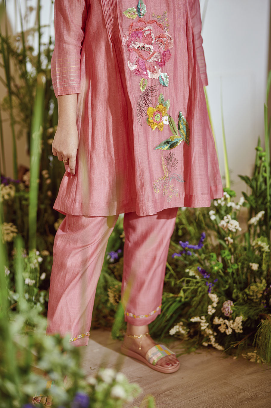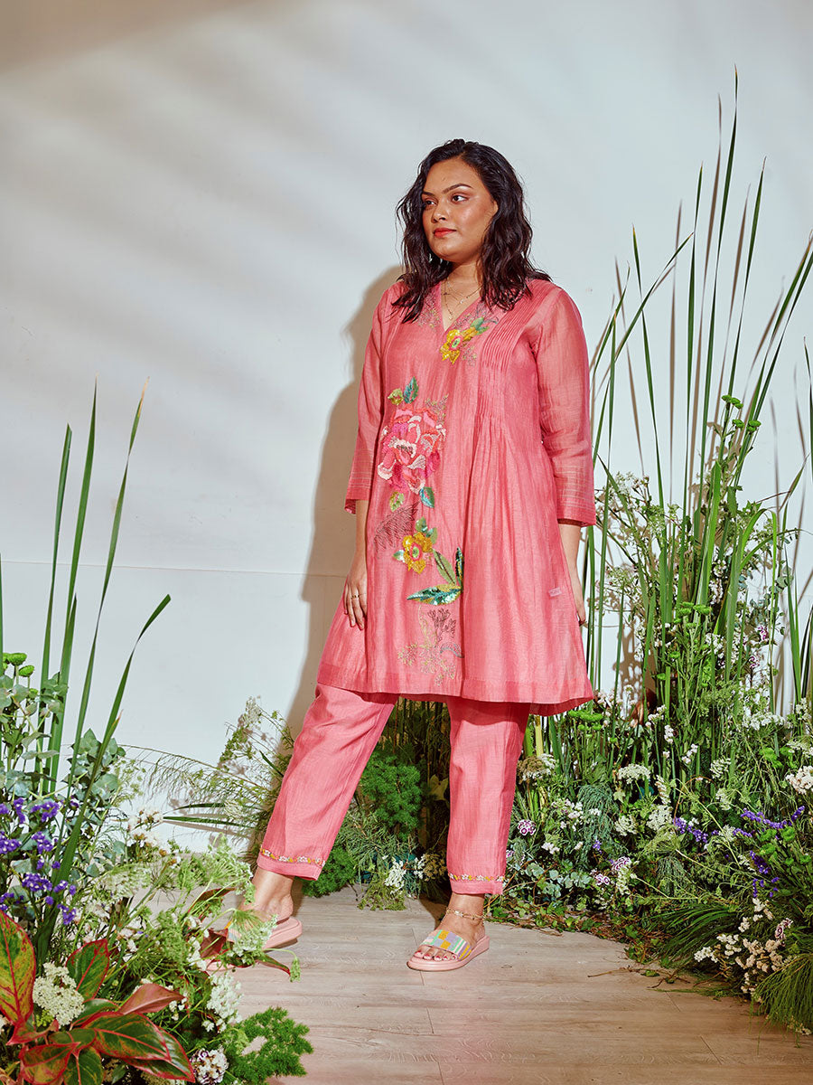 Tropical Garden V Neck Kurta + Pants (Pink)