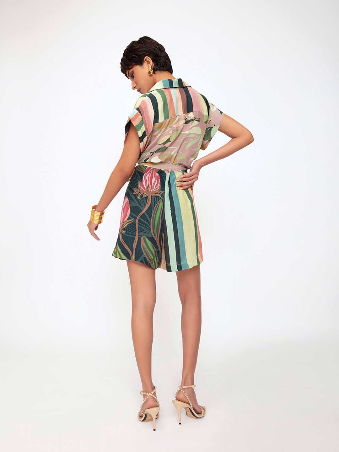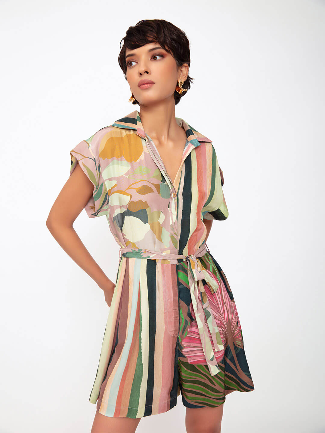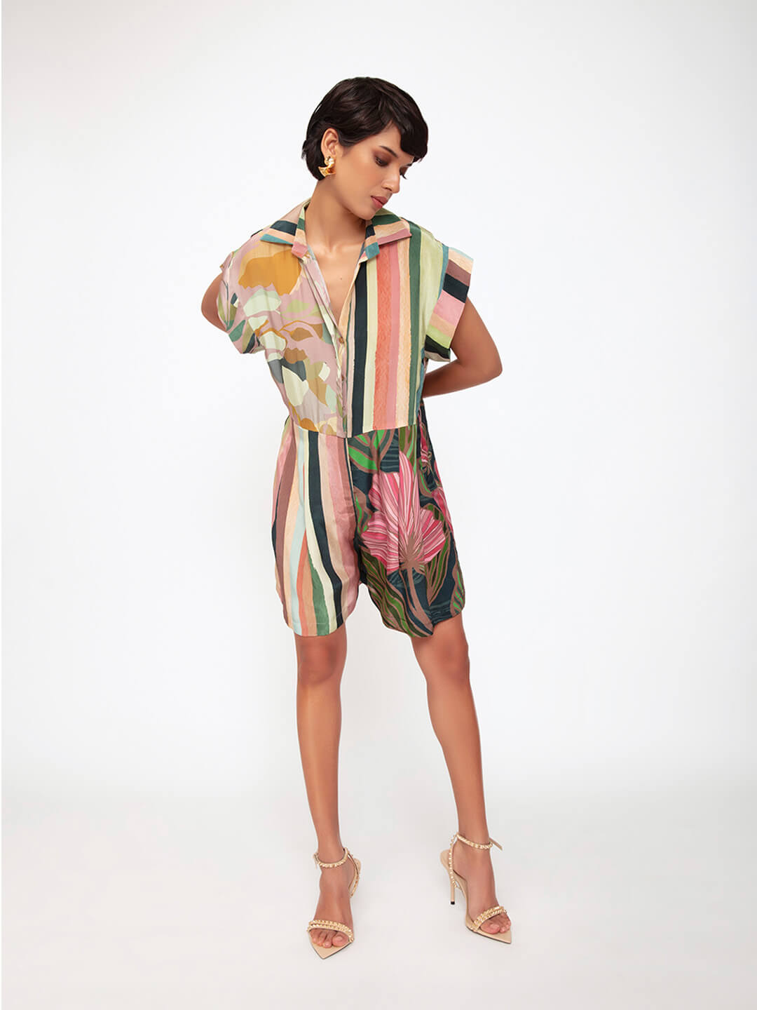 A fun silhouette, this playsuit in a mix of bold prints, makes a statement resort wear look.