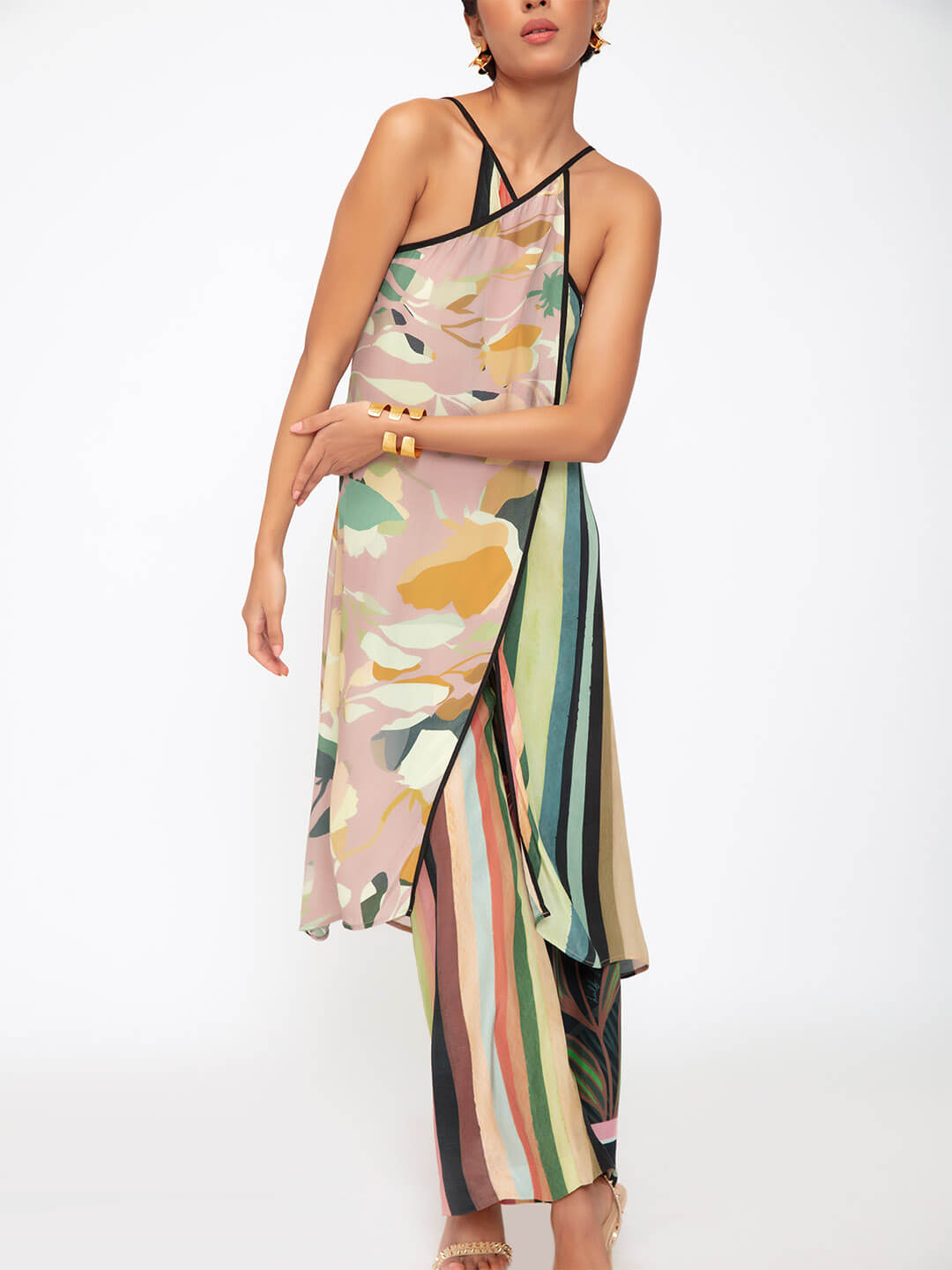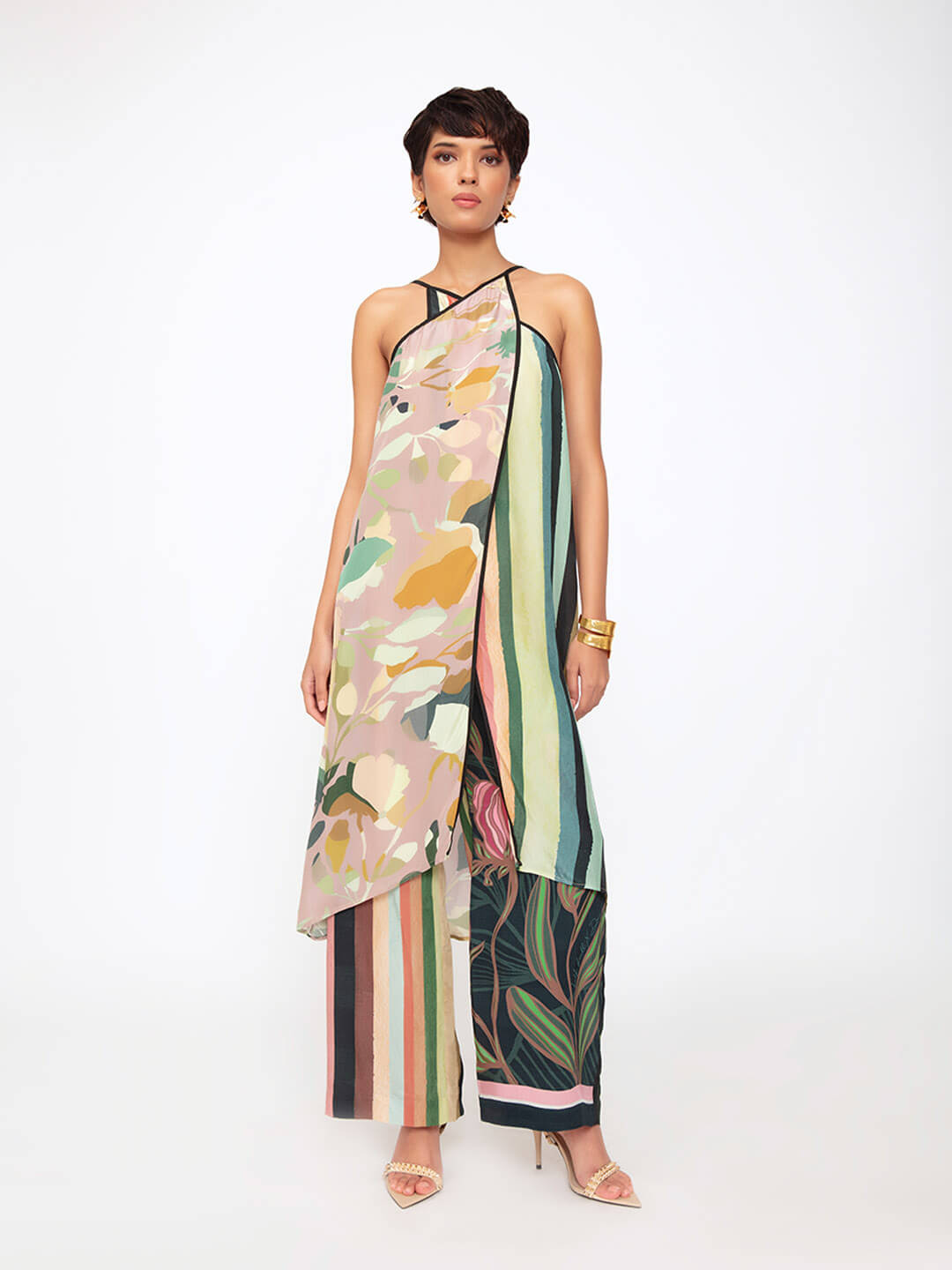 The perfect resort look, stylish & comfortable. A lightweight overlap tunic, it’s breezy yet sexy, with wide leg pants. Wear the set as a co-od look, or wear each piece individually.