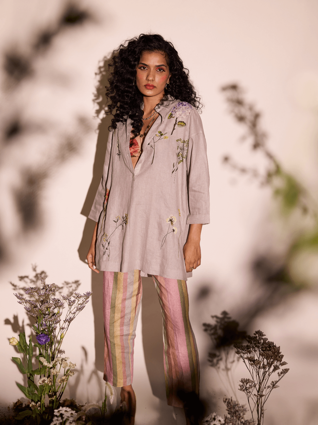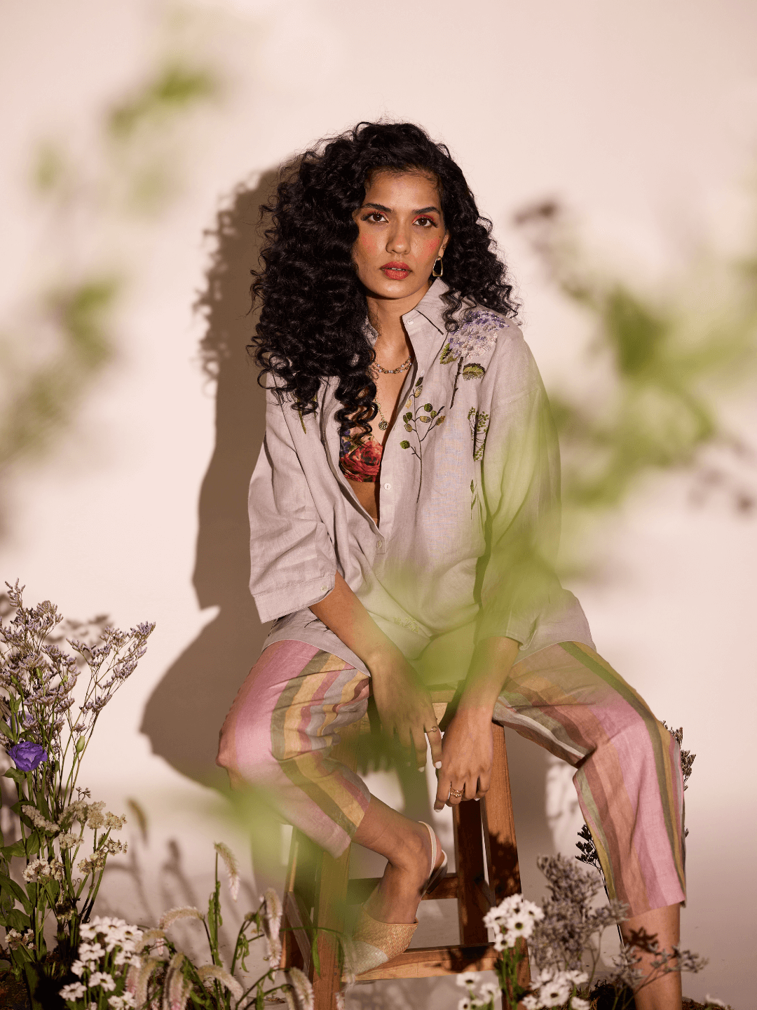 The perfect summer ensemble! Delicate wildflower embroidery, in pastel hues juxtaposed with geometric stripes, makes this shirt and pant set a versatile look.