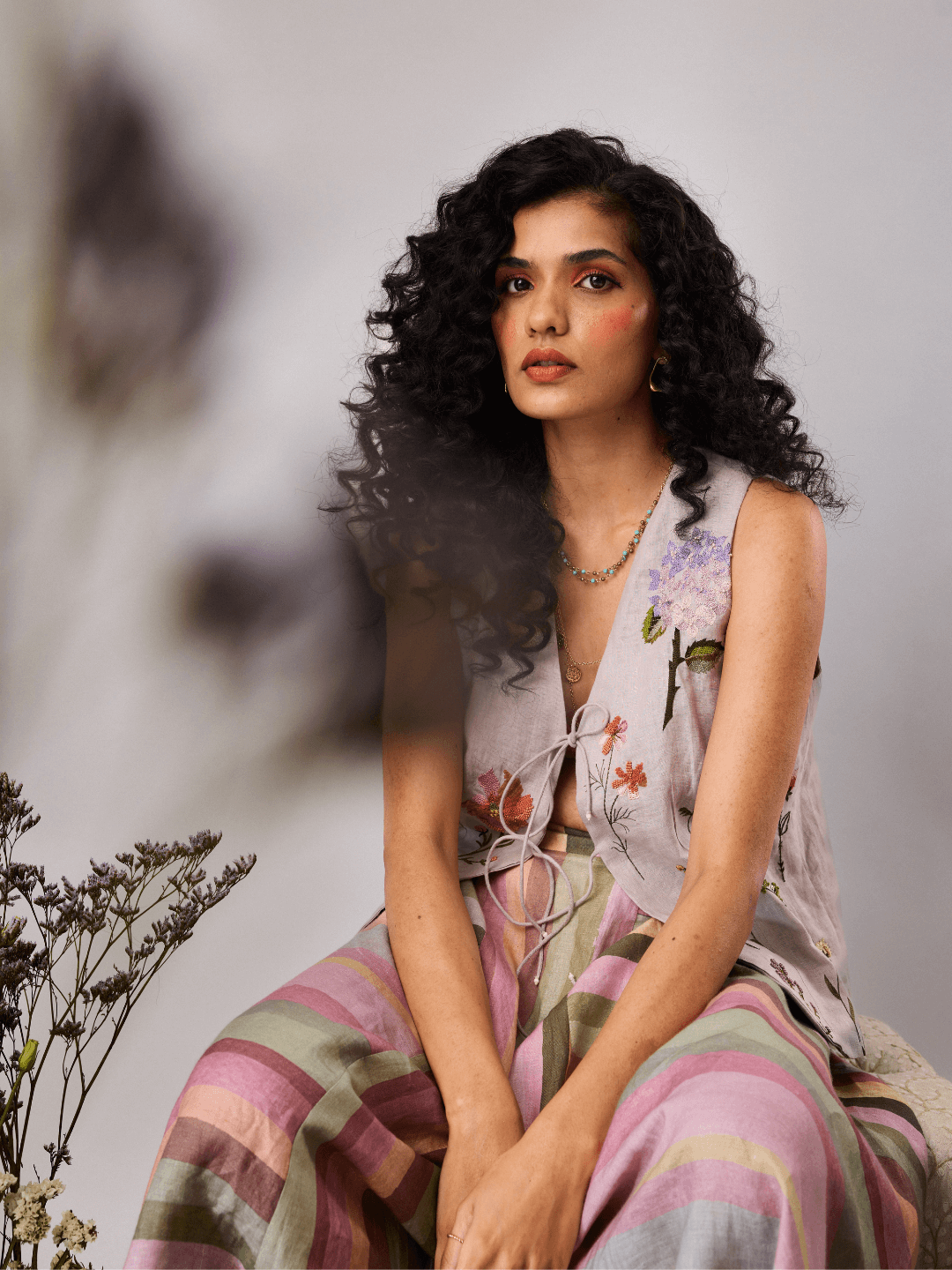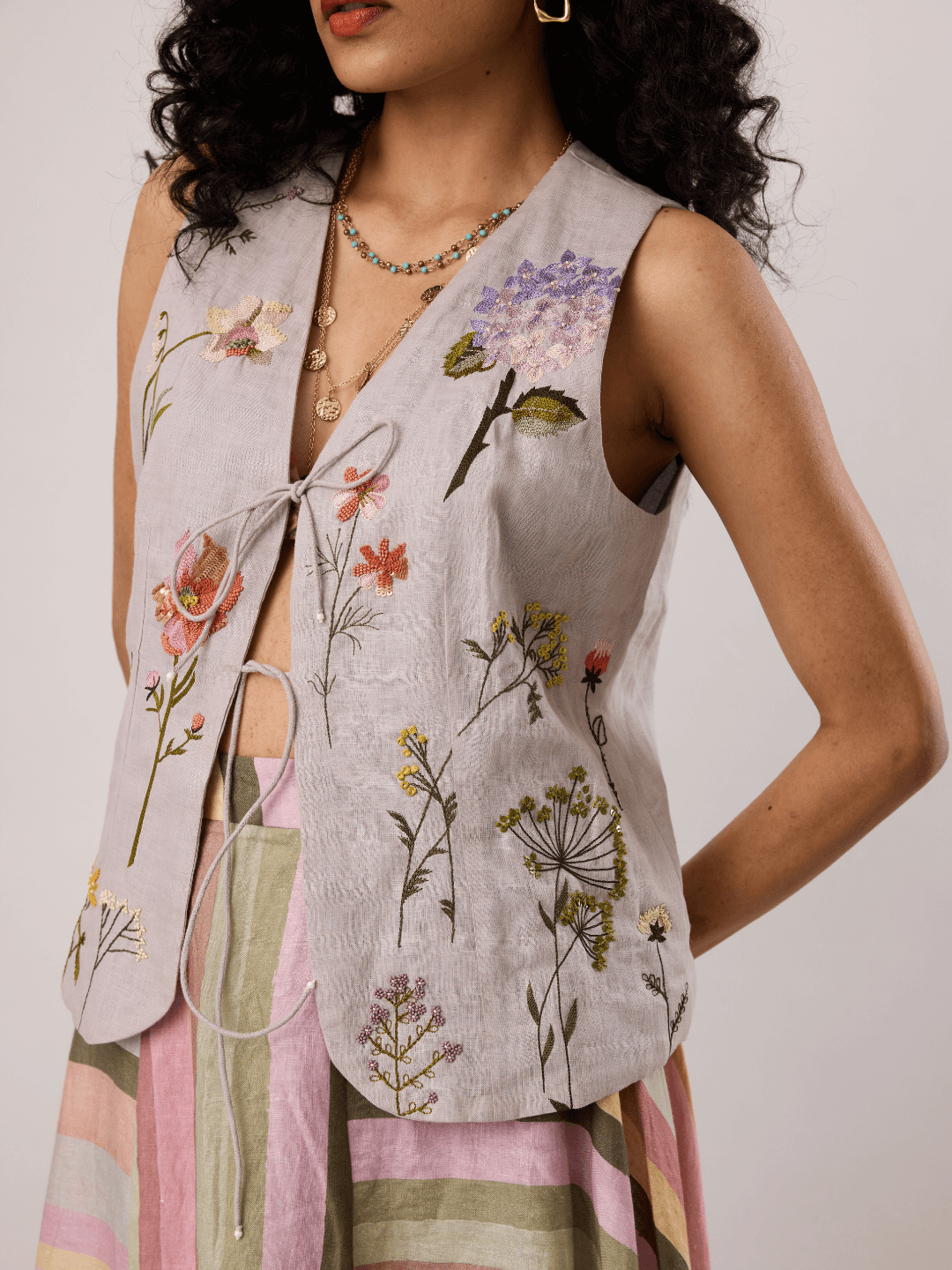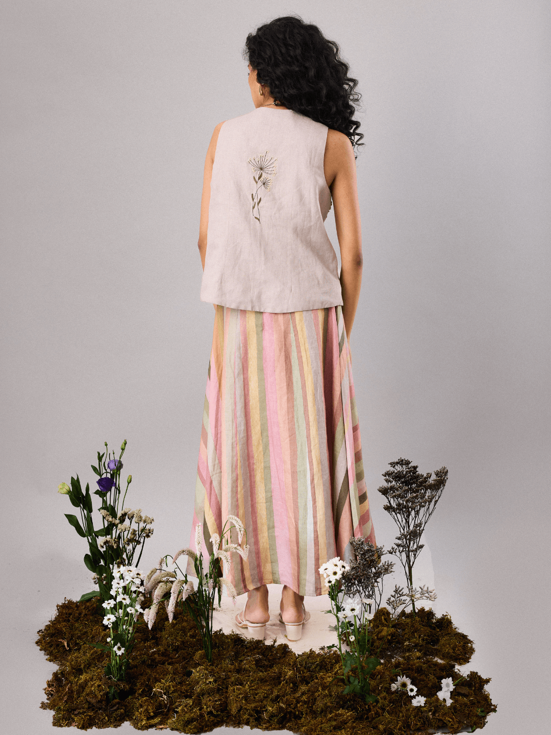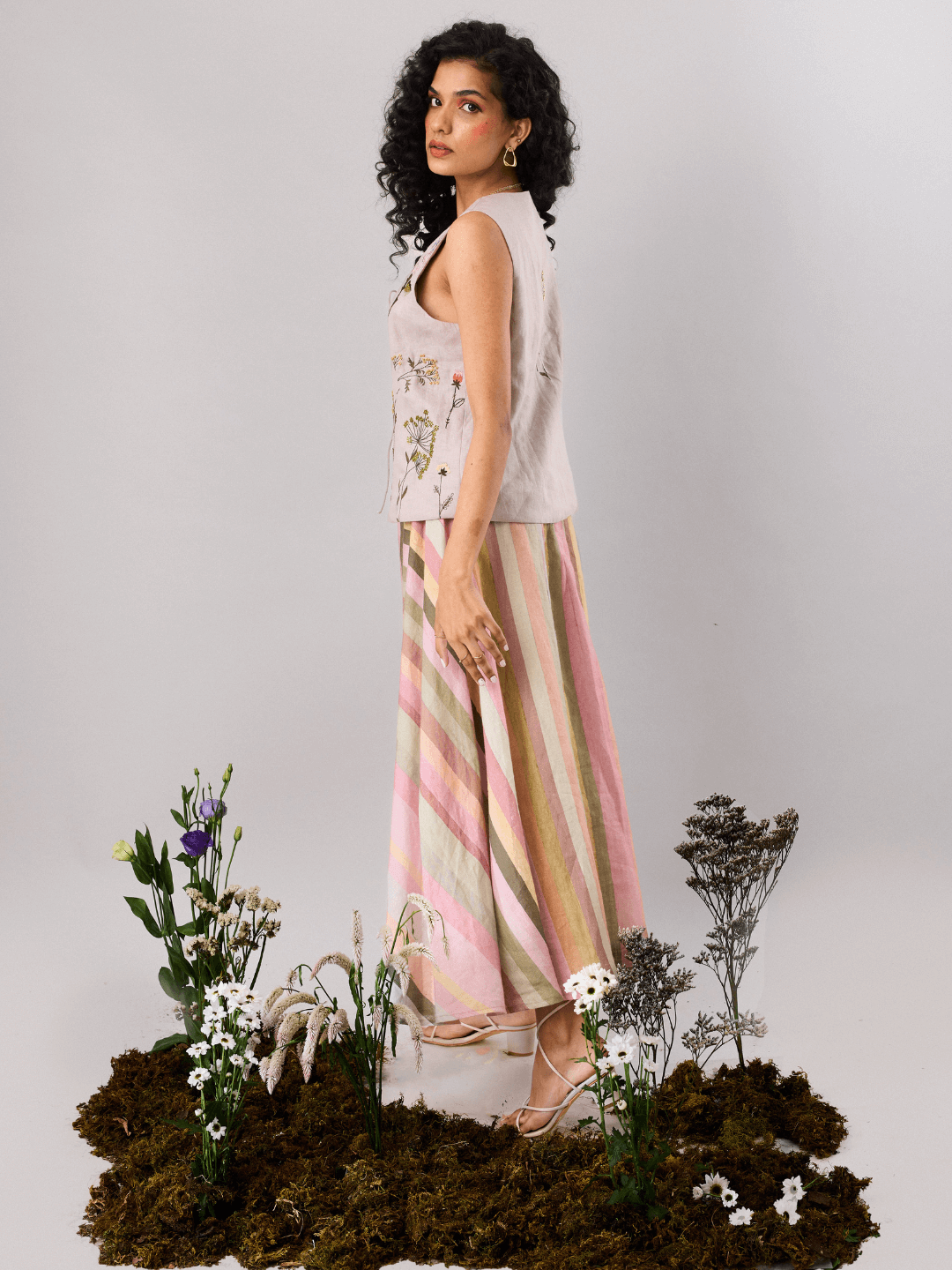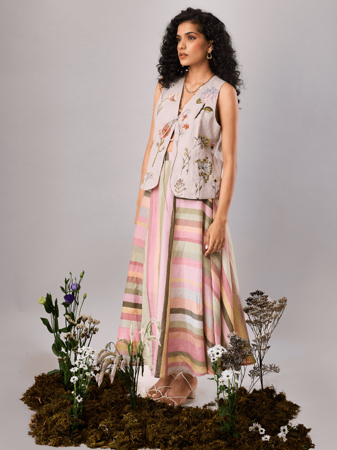 The perfect summer ensemble! Delicate wildflower embroidery, in pastel hues juxtaposed with geometric stripes, makes this vest and skirt set a versatile look.