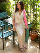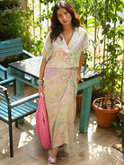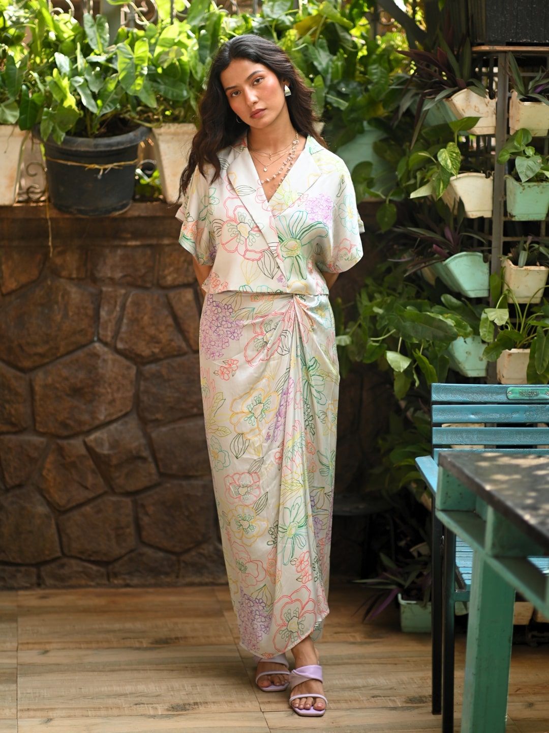 Pretty florals outlined in pop hues, created by the fluidity of the ink. An expression of nature in a subtle pattern. The crop shirt, with the drape skirt, sexy & artsy in one look. Easy, comfort chic and glam. Wear it as a set or style them individually. Style with metallic boots, or strappy stilettos, glam make up, and metallic jewellery, it’s the perfect sundowner look.