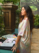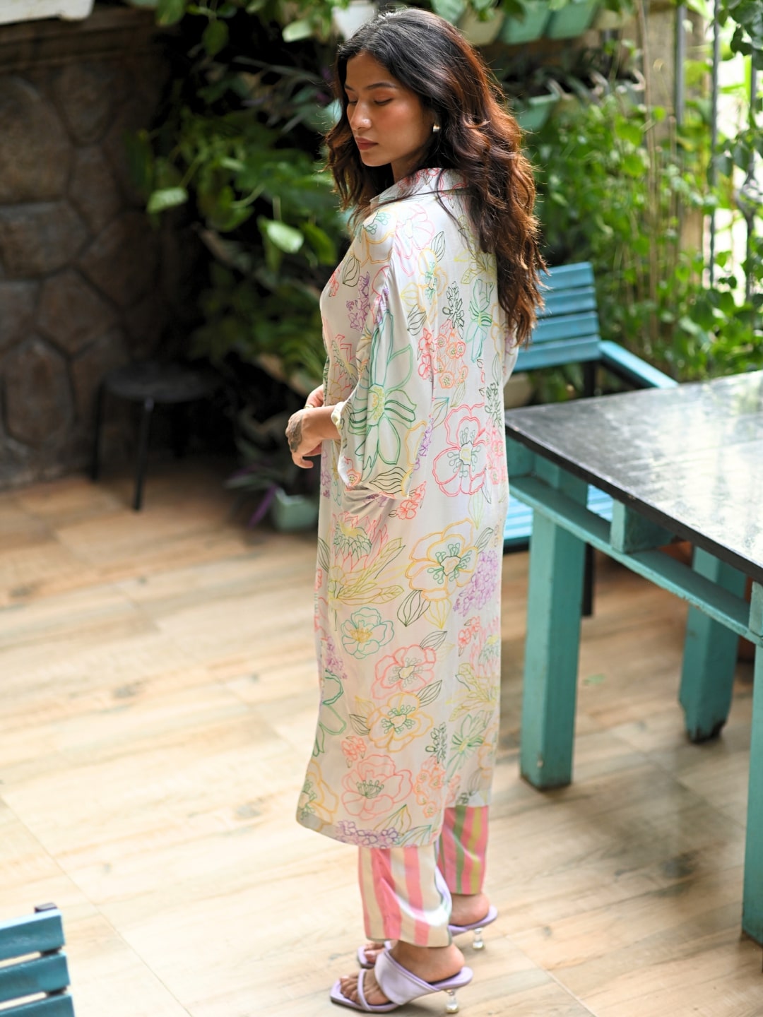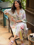 Pretty florals outlined in pop hues, created by the fluidity of the ink. An expression of nature in a subtle pattern. The shirt tunic in a kaftan drape style coordinated with geometric pattern pants. Easy, comfort chic and breezy. Wear it as a set or style them individually. Perfect for all your resort travels, styled with jewelled sandals, sunglasses, and dewy make up.