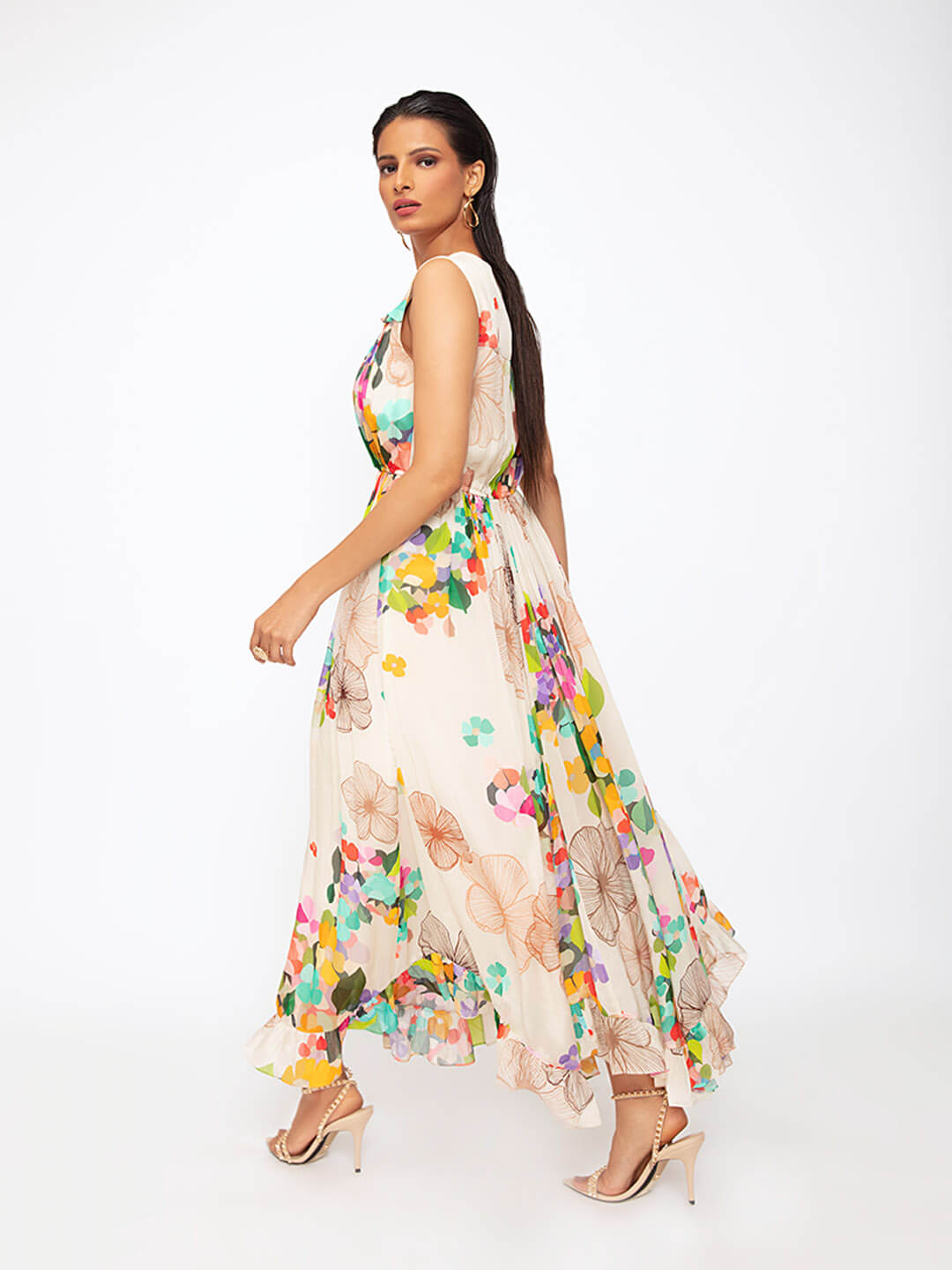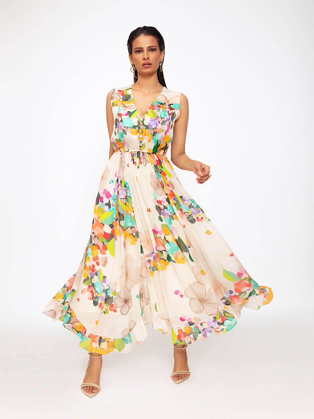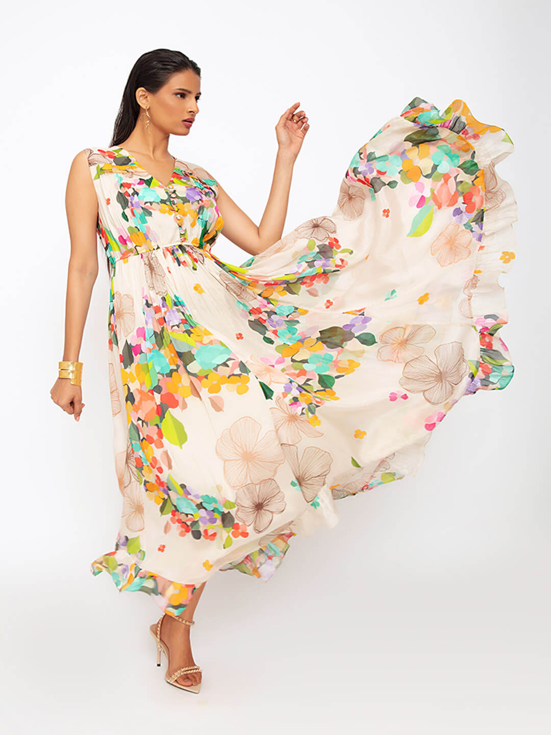 Elegant, feminine, this midi dress evokes a sense of old world charm. The delicate floral print, with a flared and ruffled bottom hem, add a hint of flirty, a perfect brunch look.