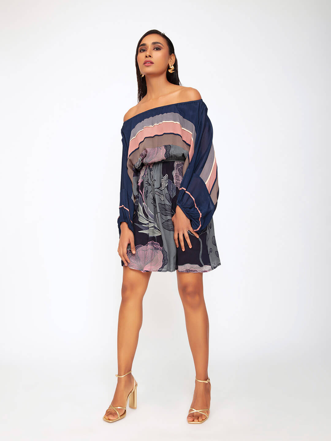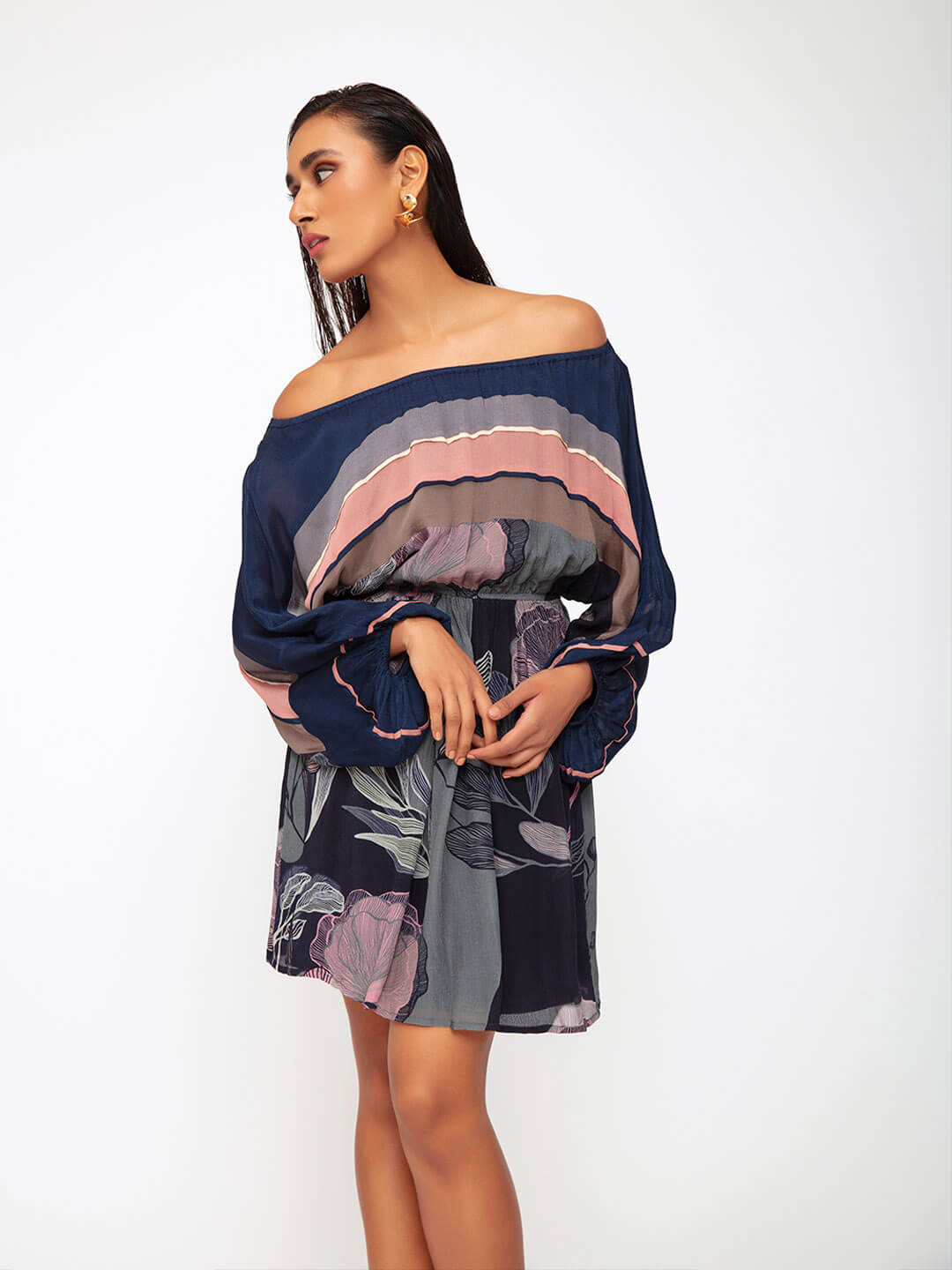 Stylish and oh so comfortable. This offshoulder dress is your perfect day to evening travel look. The colour block stripes and big flounce sleeves add a hint of drama.