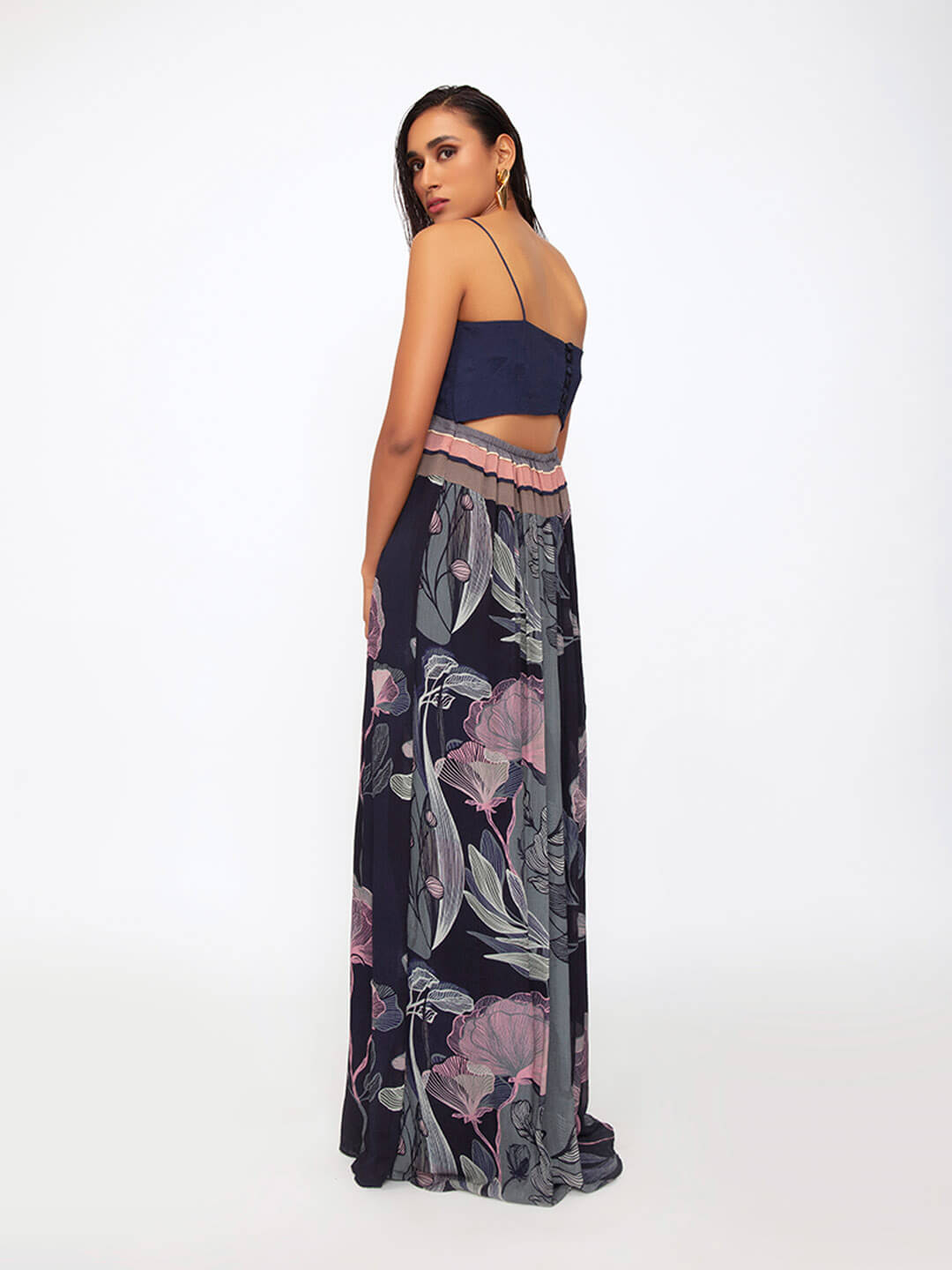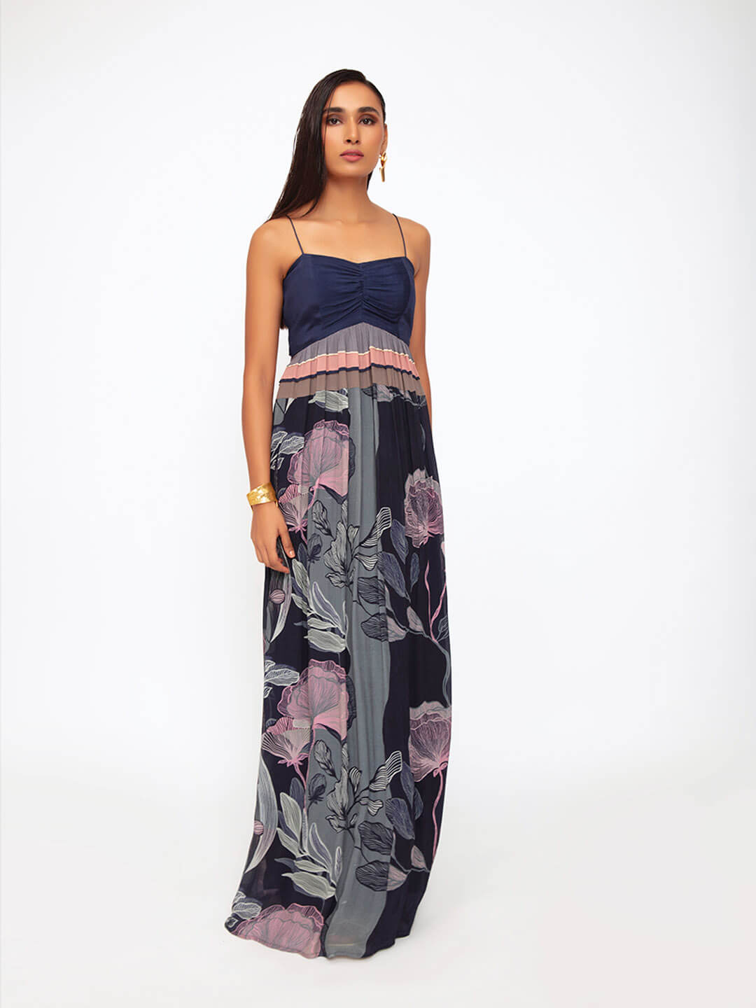 Elegant, feminine, this maxi dress is your perfect cocktail evening look. The striped colour blocking in contrast to the bold floral print, adds to the drama. The subtle back cut out, gives a hint of sexiness.