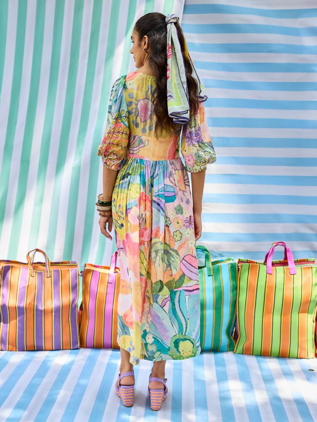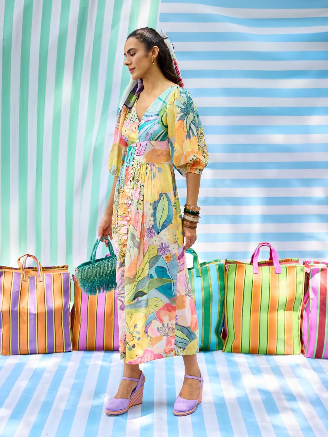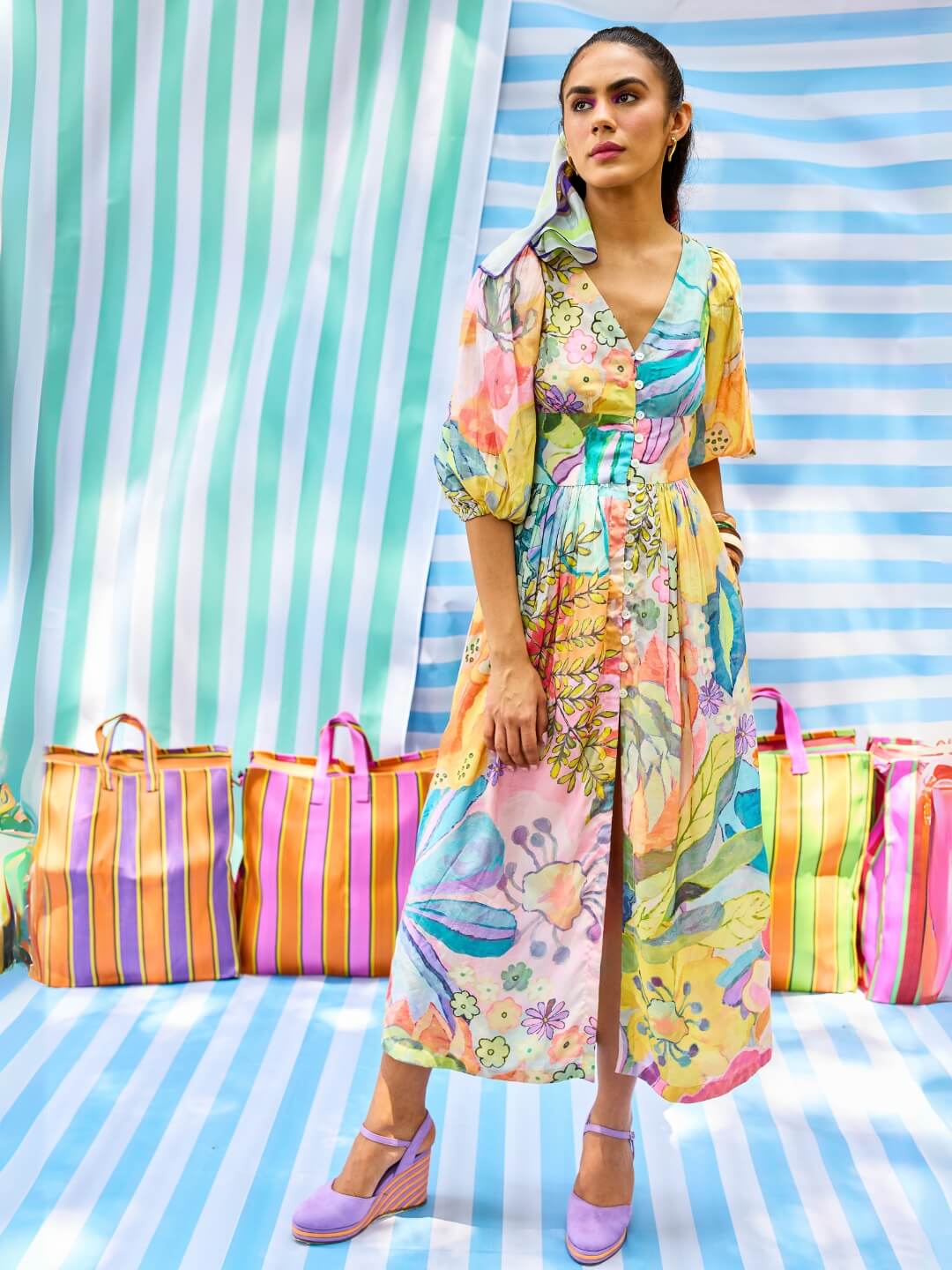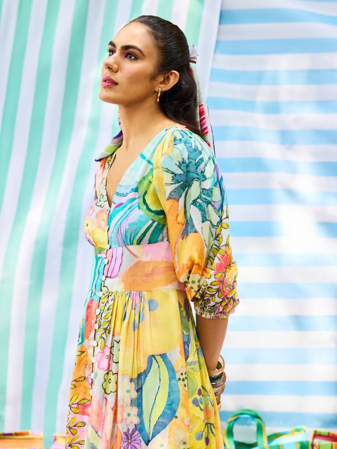 Art meets sunkissed florals. Expressive brushstrokes and blurred shapes in pop hues, creates an impressionist artwork of a spring garden. The cinched waist and gathers add a feminine feel whereas the exaggerated balloon sleeves add drama, making this a statement look. Perfect for brunch and sundowners, styled with metallic jewellery, colour block heels and dewy make up.