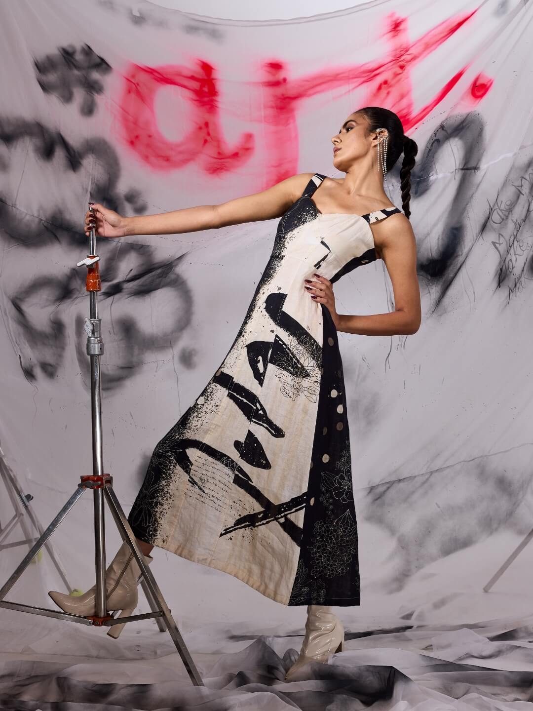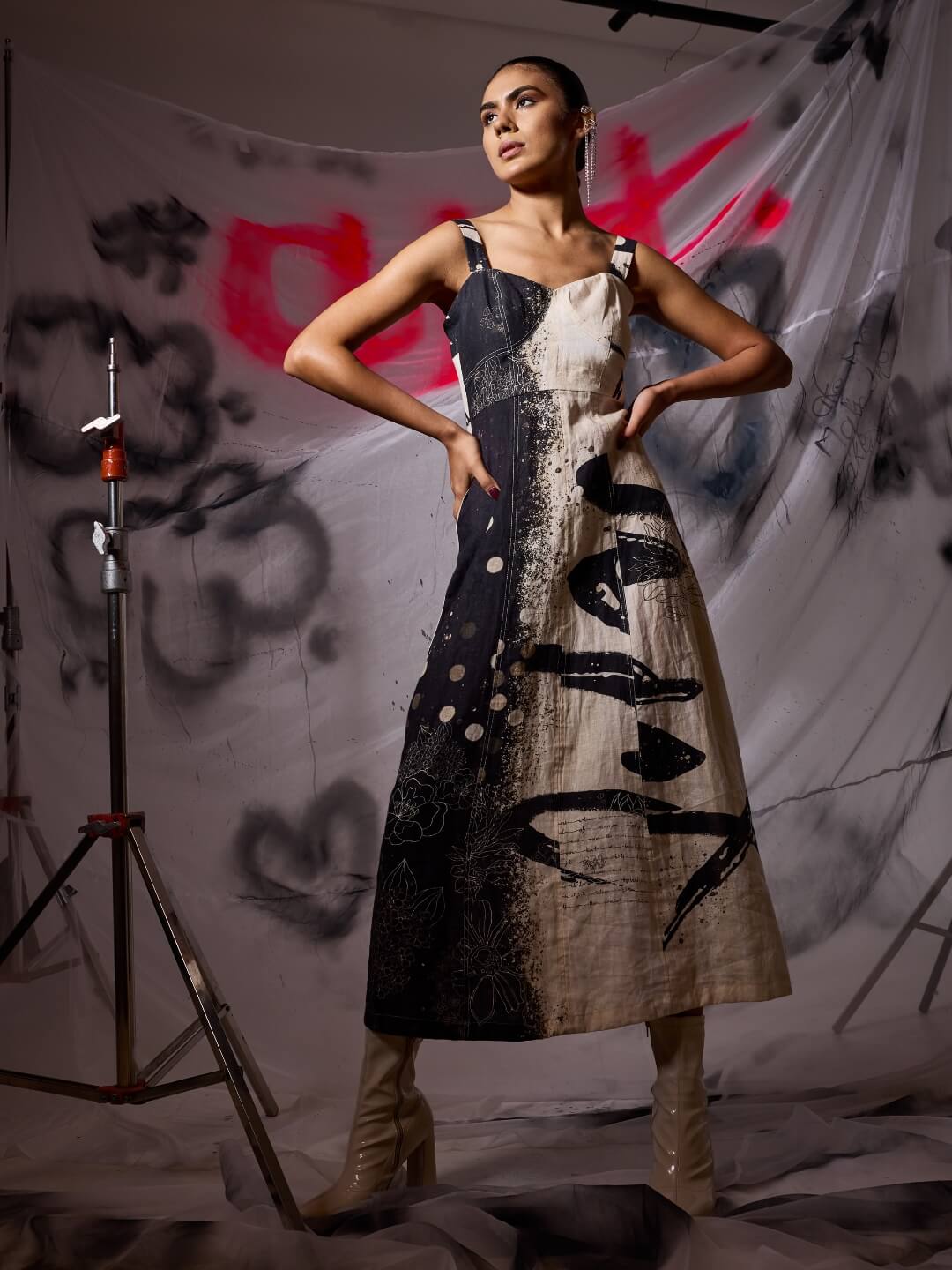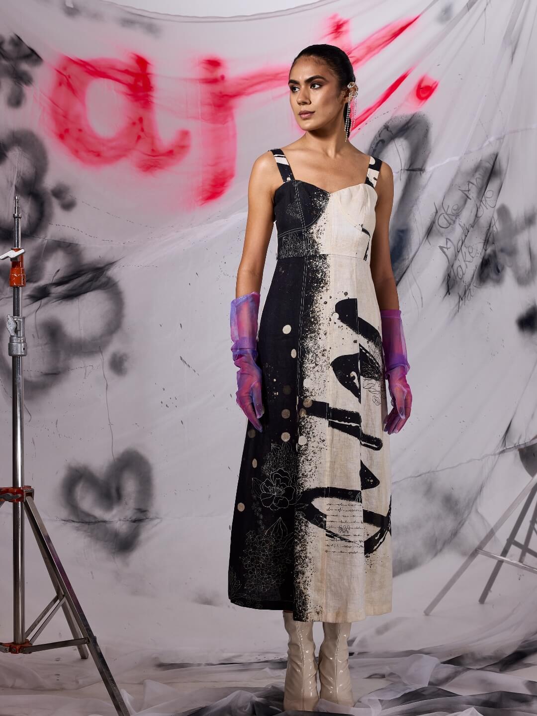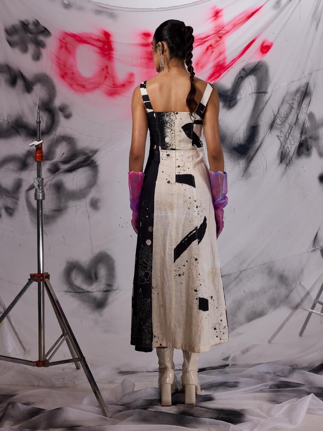 Japanese brushstroke art, highlighting the harmony between black and white. The expressive power of the brushwork, fluidity of the ink, creates different textures while capturing the essence of nature. The corset detailing, and cinched waist add a feminine and elegant feel to the dress. Perfect for brunch and sundowners.
