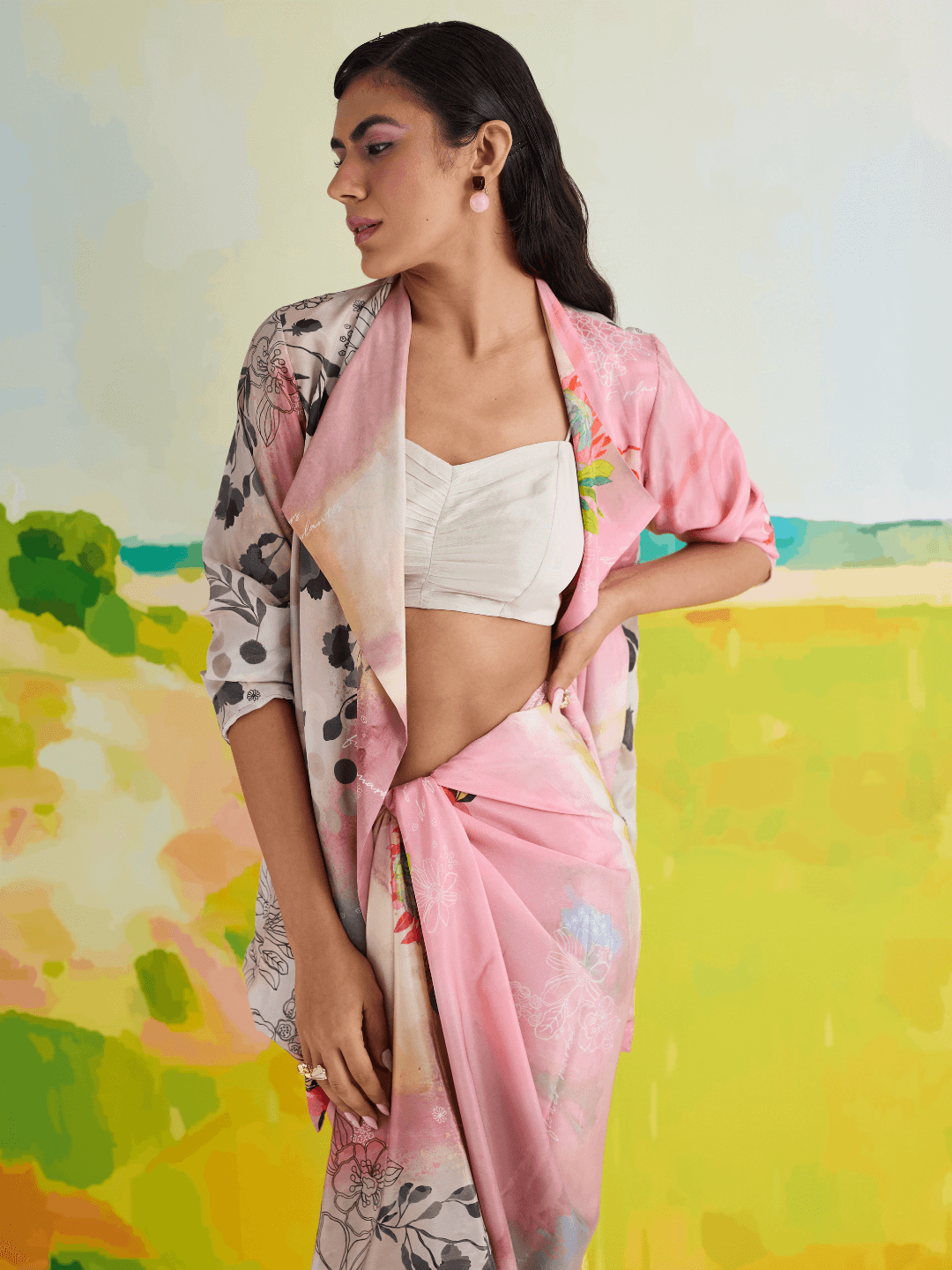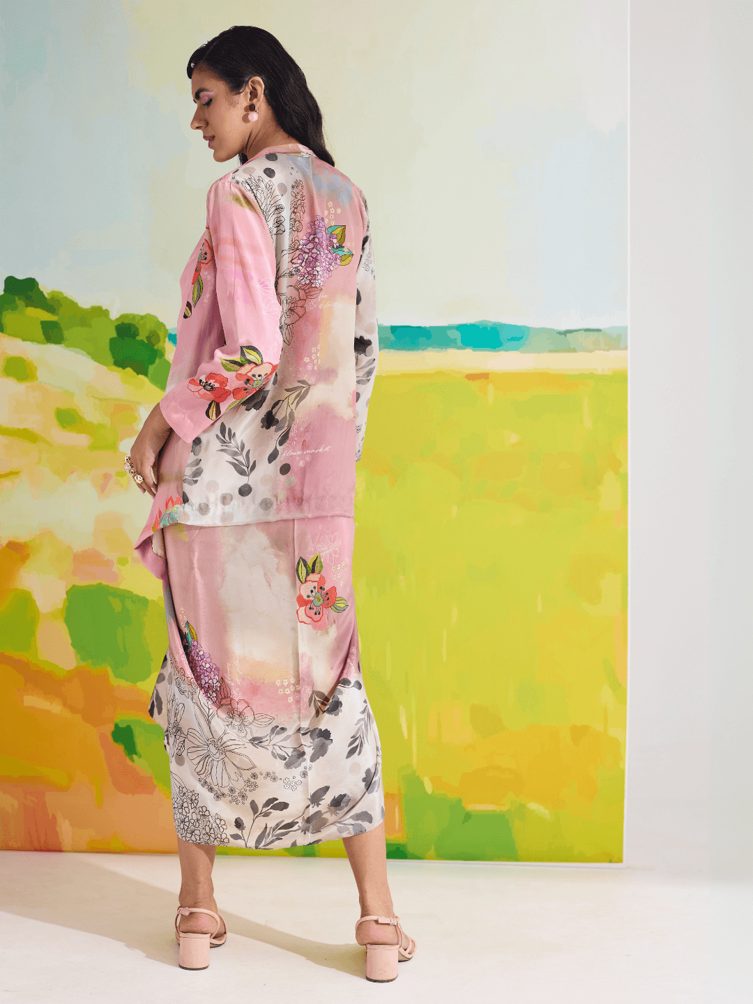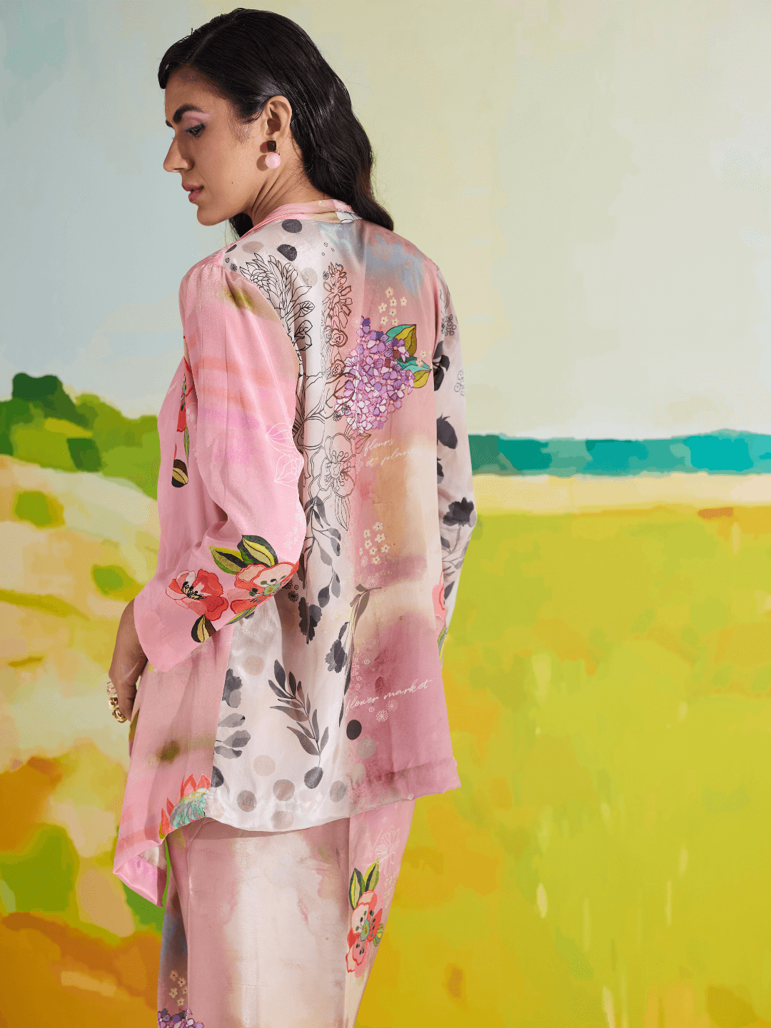 Monet’s garden meets modern art. Pretty pink tones with florals, juxtaposed with black & white geometry. The expressive power of the brushwork, fluidity of the ink, creates different textures while capturing the essence of nature.