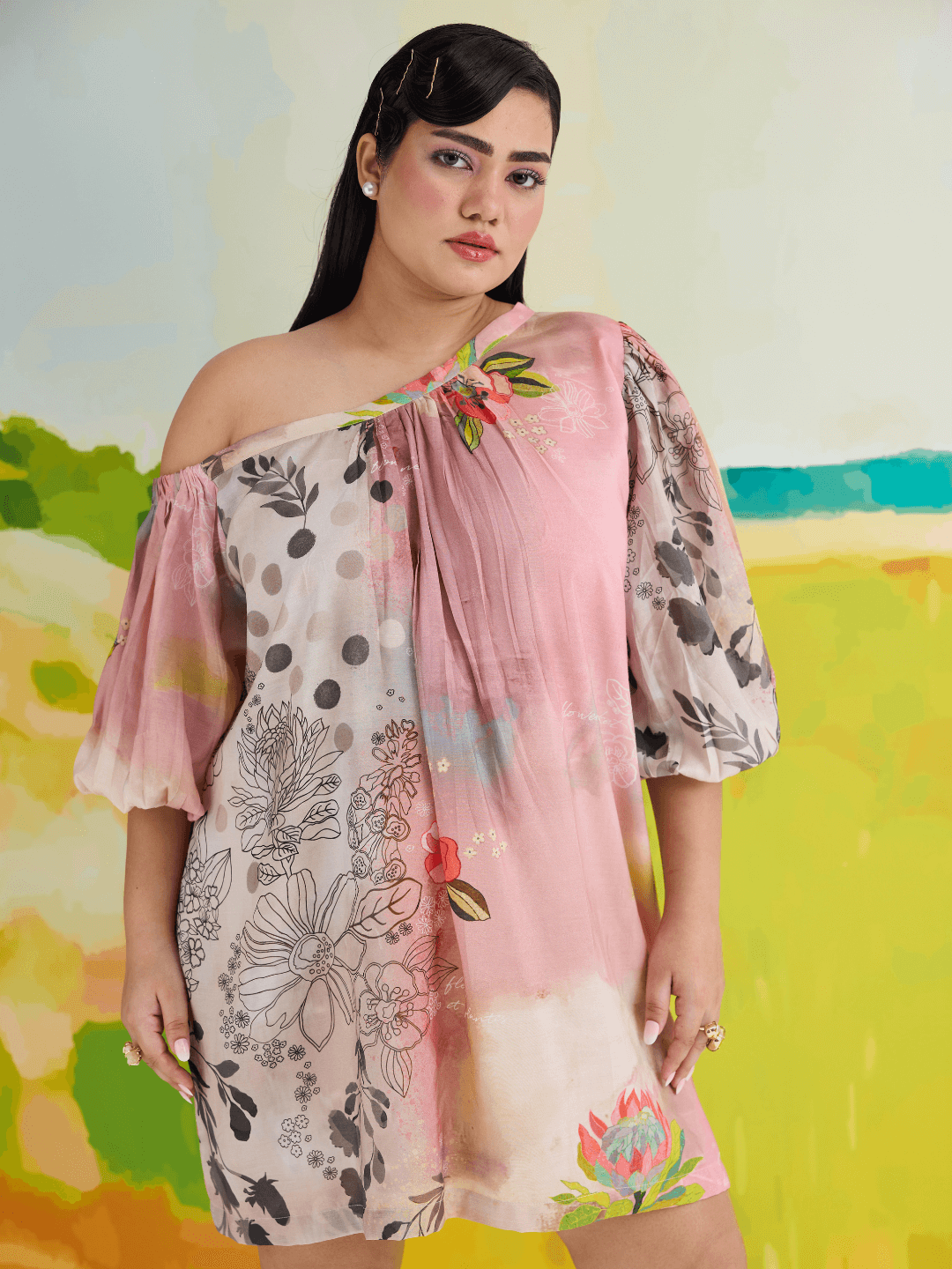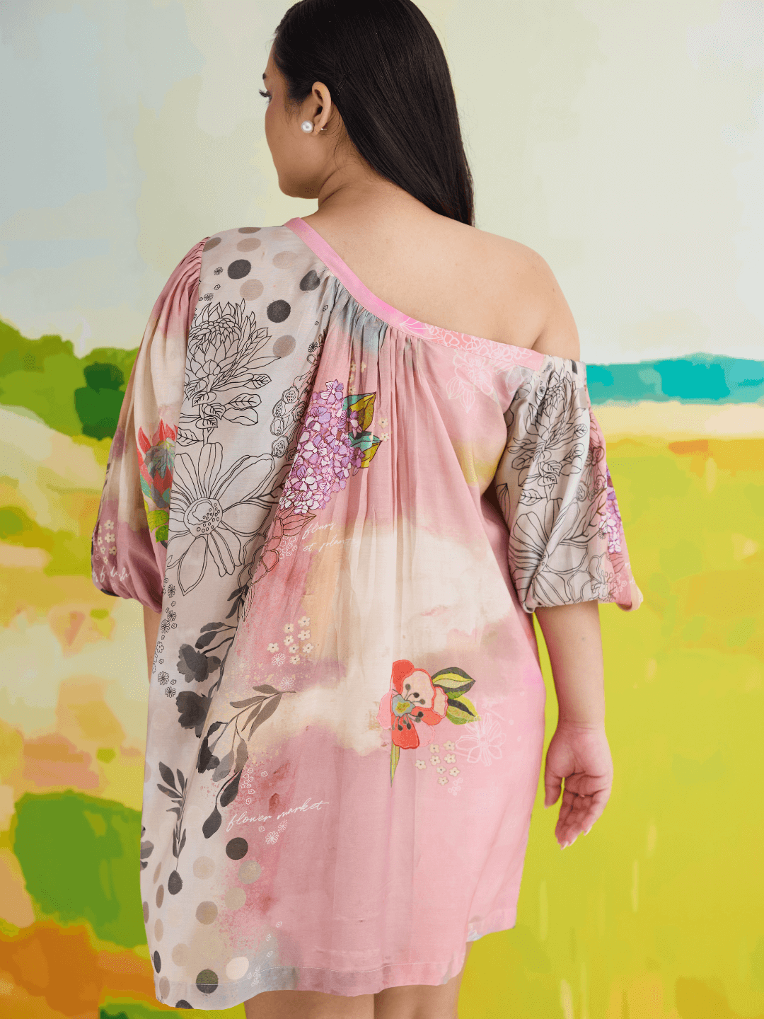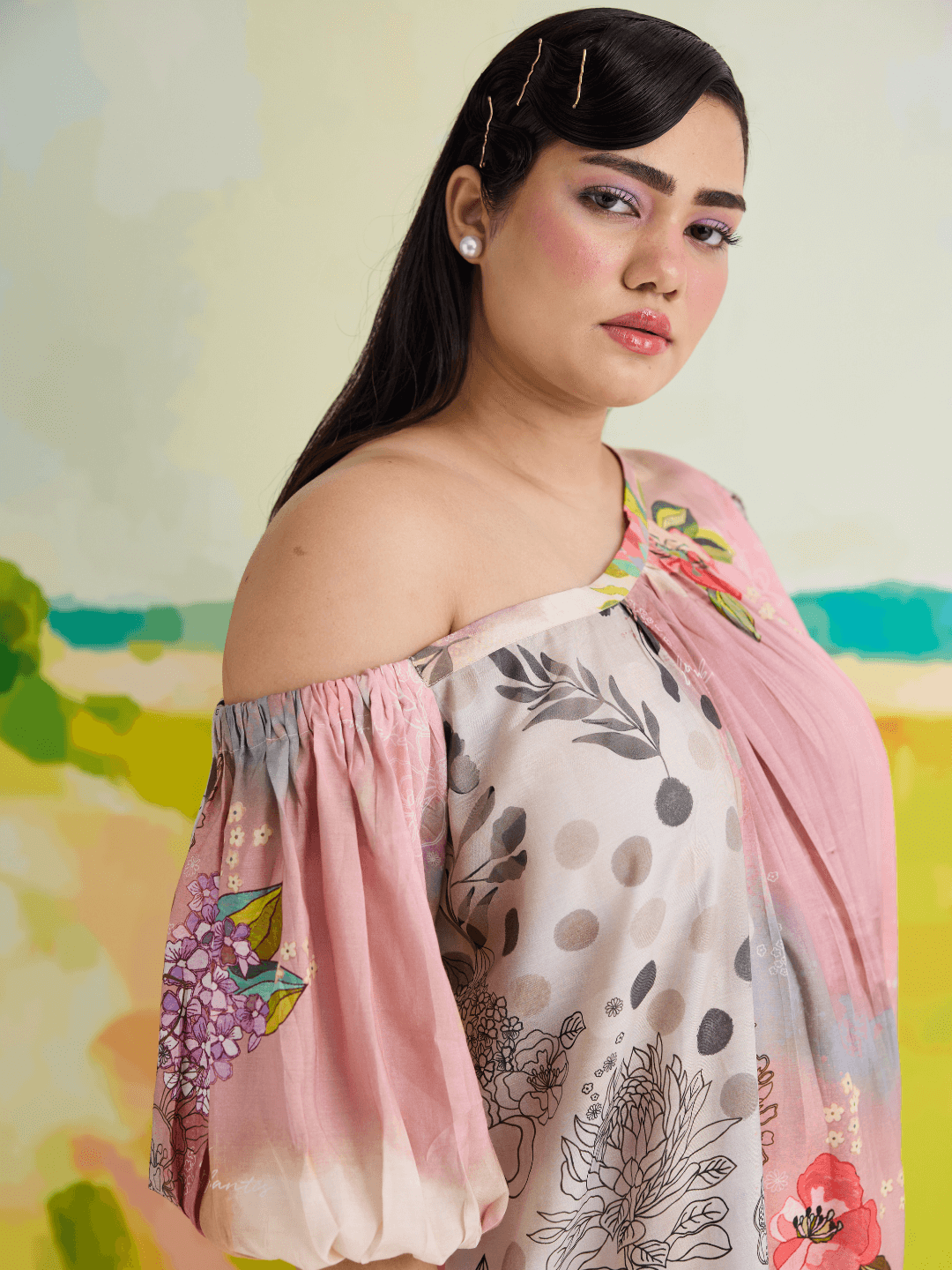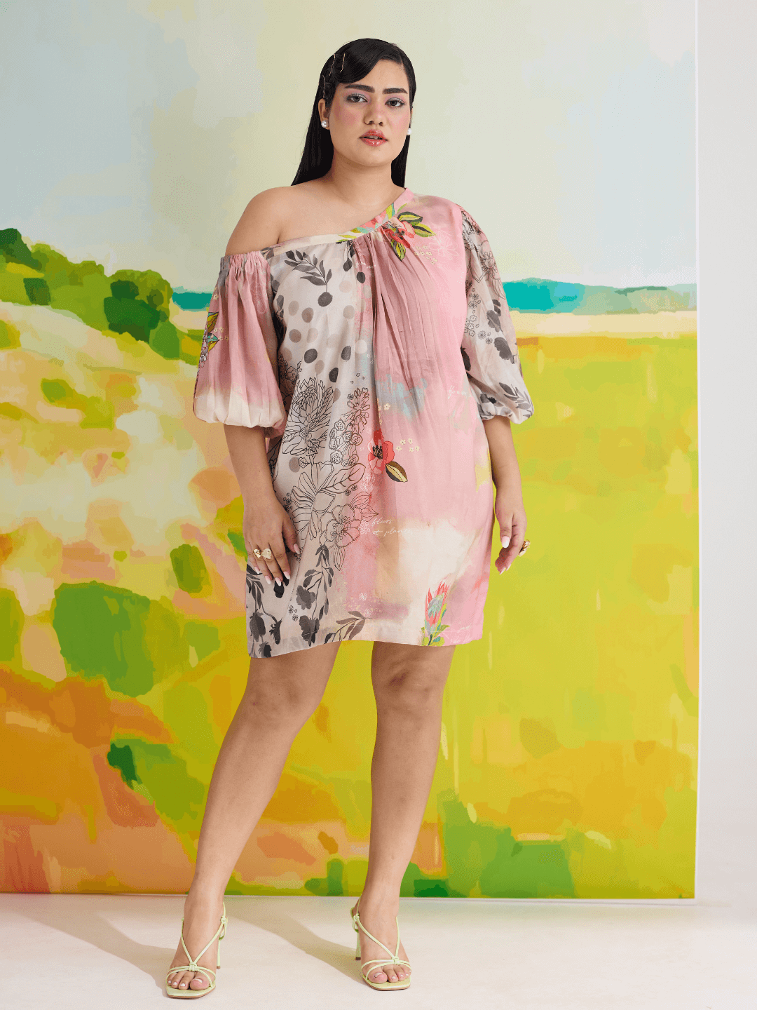 The classic shift dress with exaggerated balloon sleeves and an off shoulder neckline, a fun and flirty look. Perfect for all your resort travels, styled with jewelled sandals, sunglasses, and dewy make up.