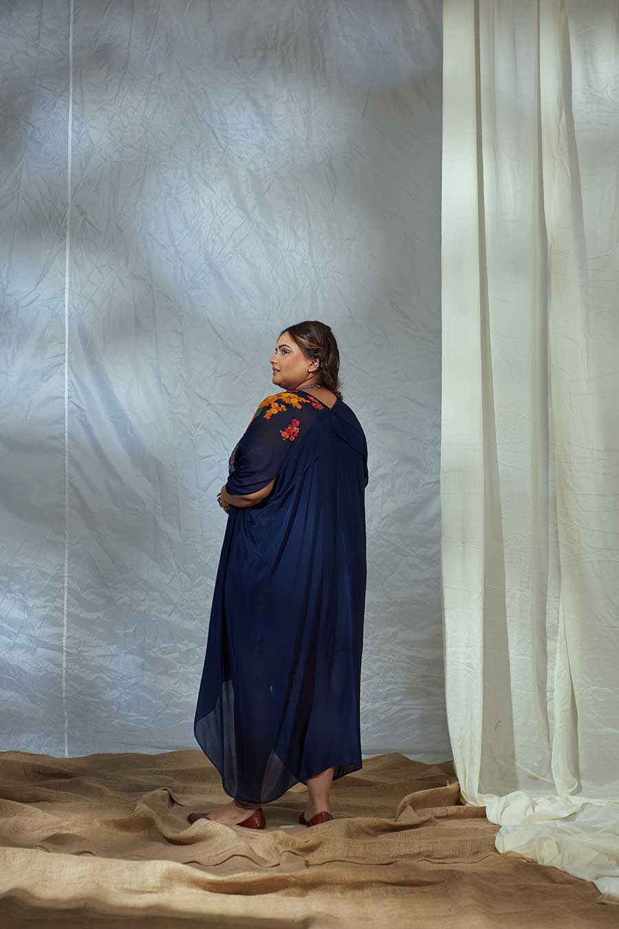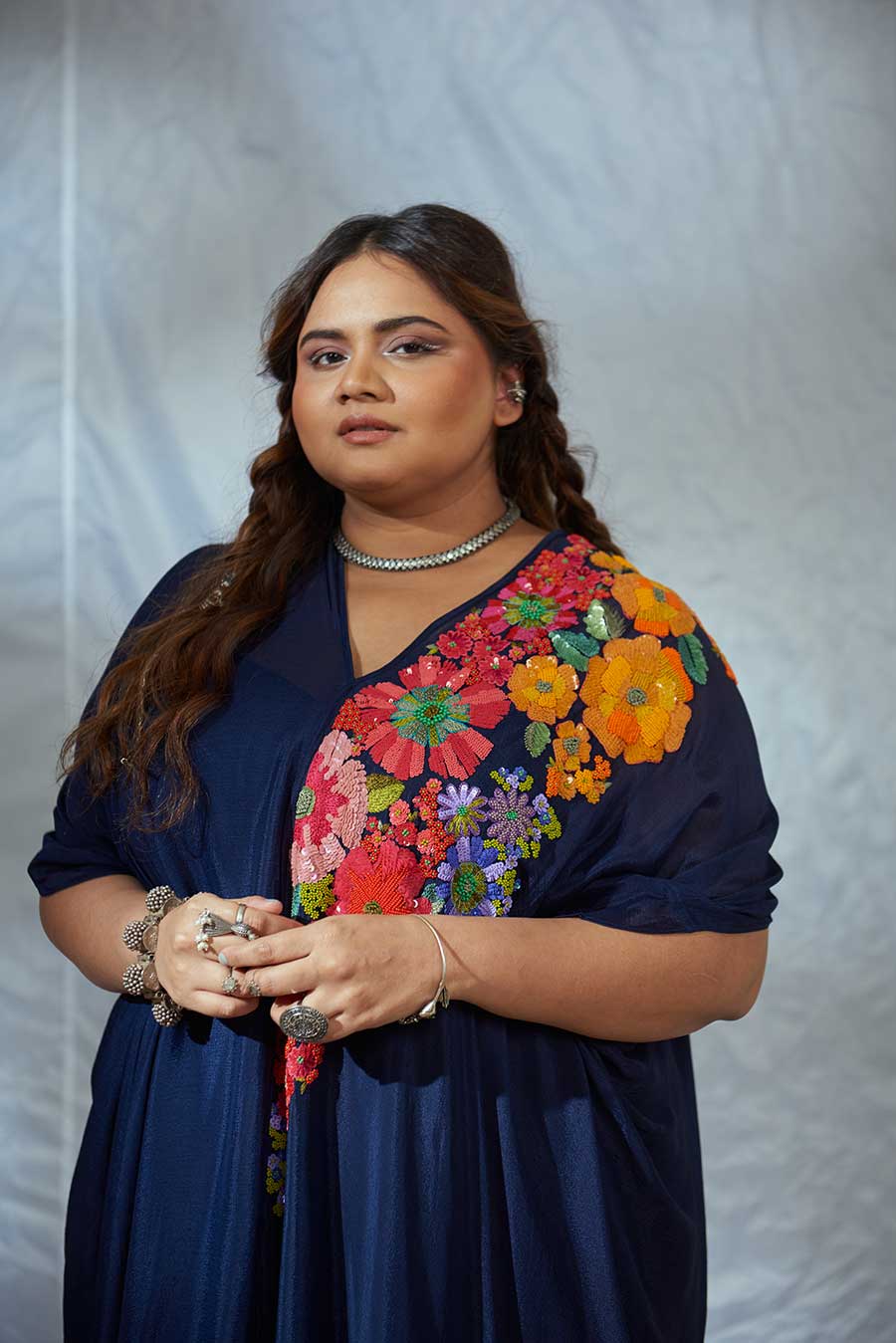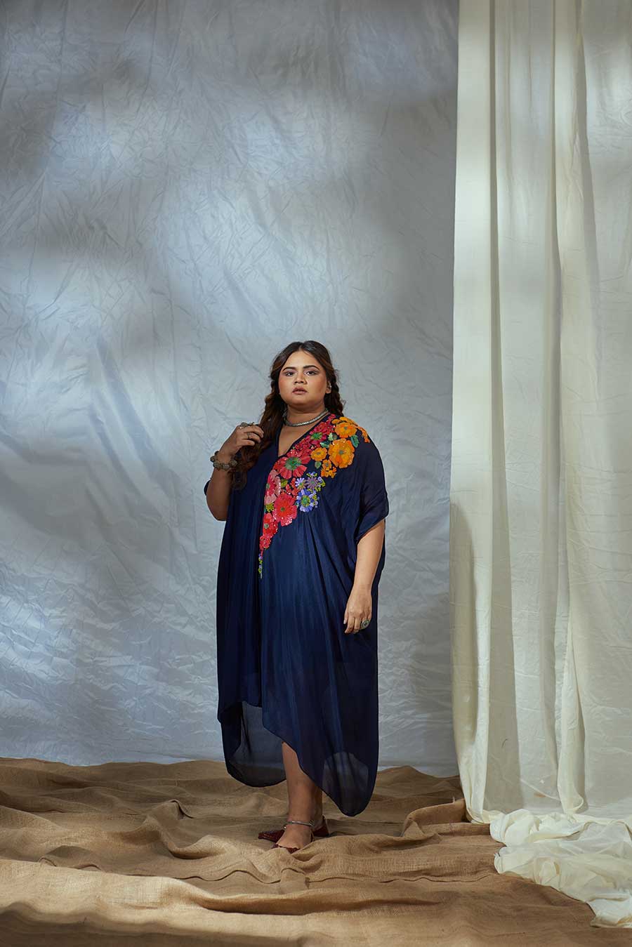 Modern Indian wear, with intricate embroidery inspired by traditional floral decor, adorns the neckline, almost like a statement neckpiece. The drape of the dress adds elegance and an element of fun. Style with chandelier earrings, mojris, a side braid, gloss on the lips, perfect for that destination wedding mehendi.