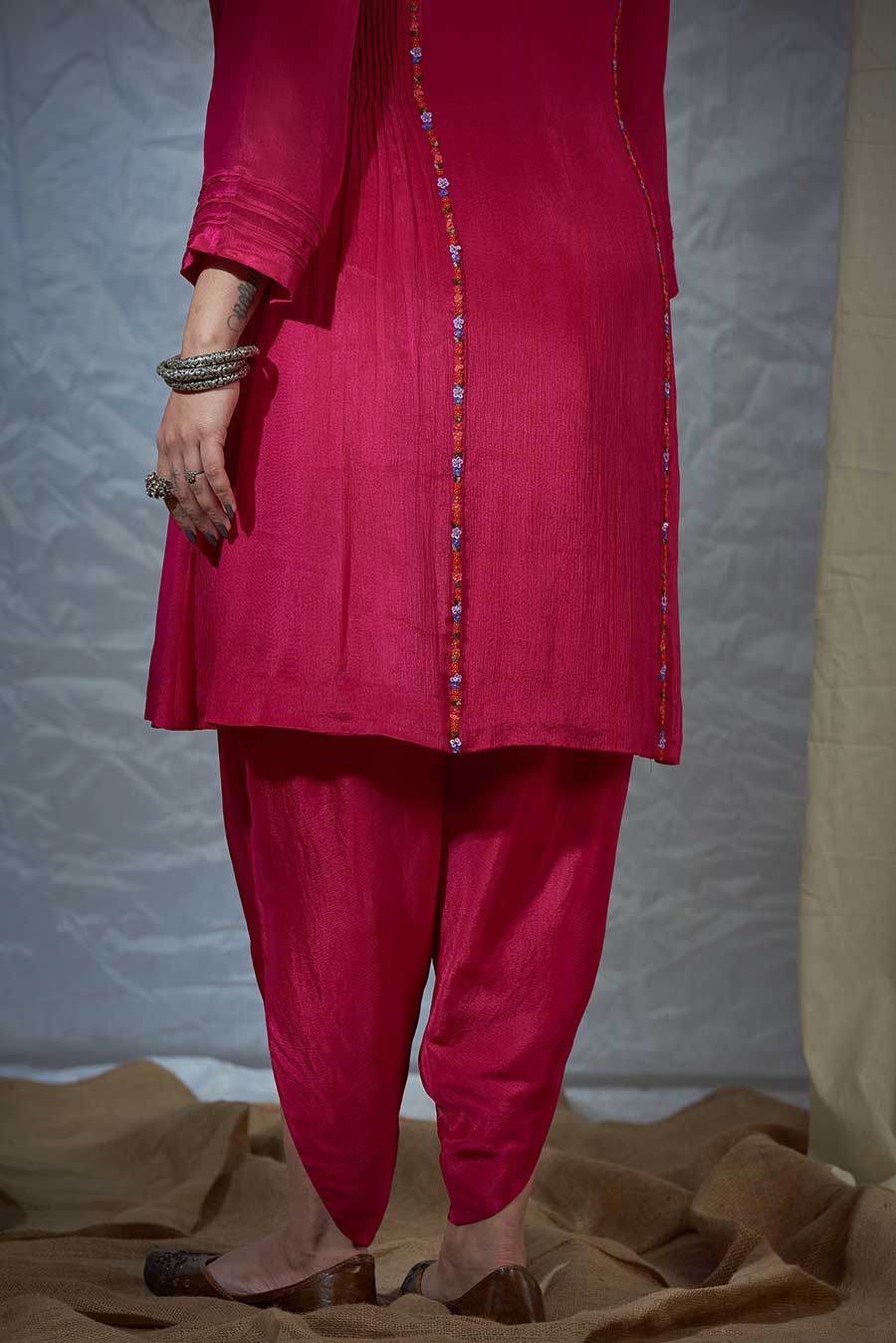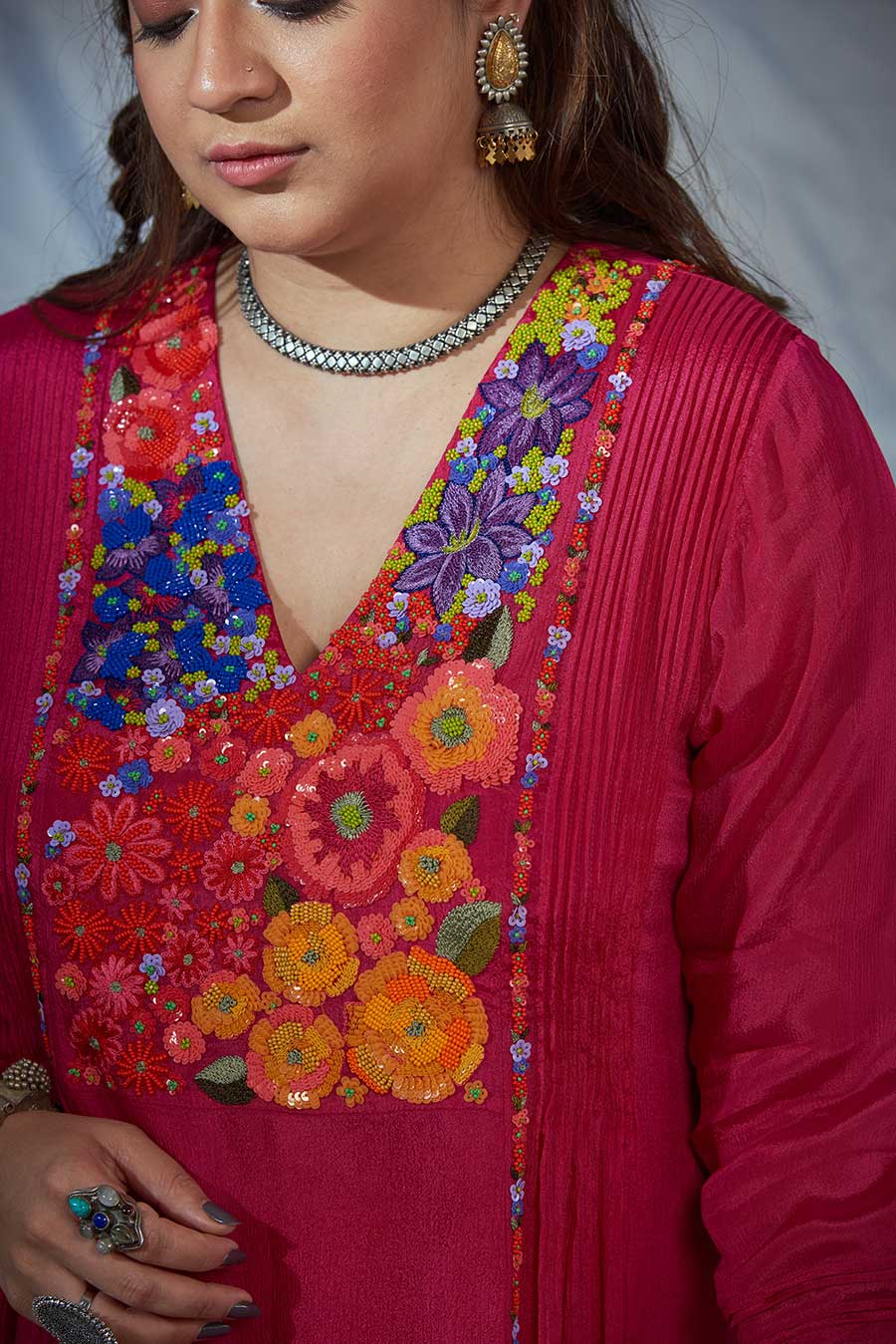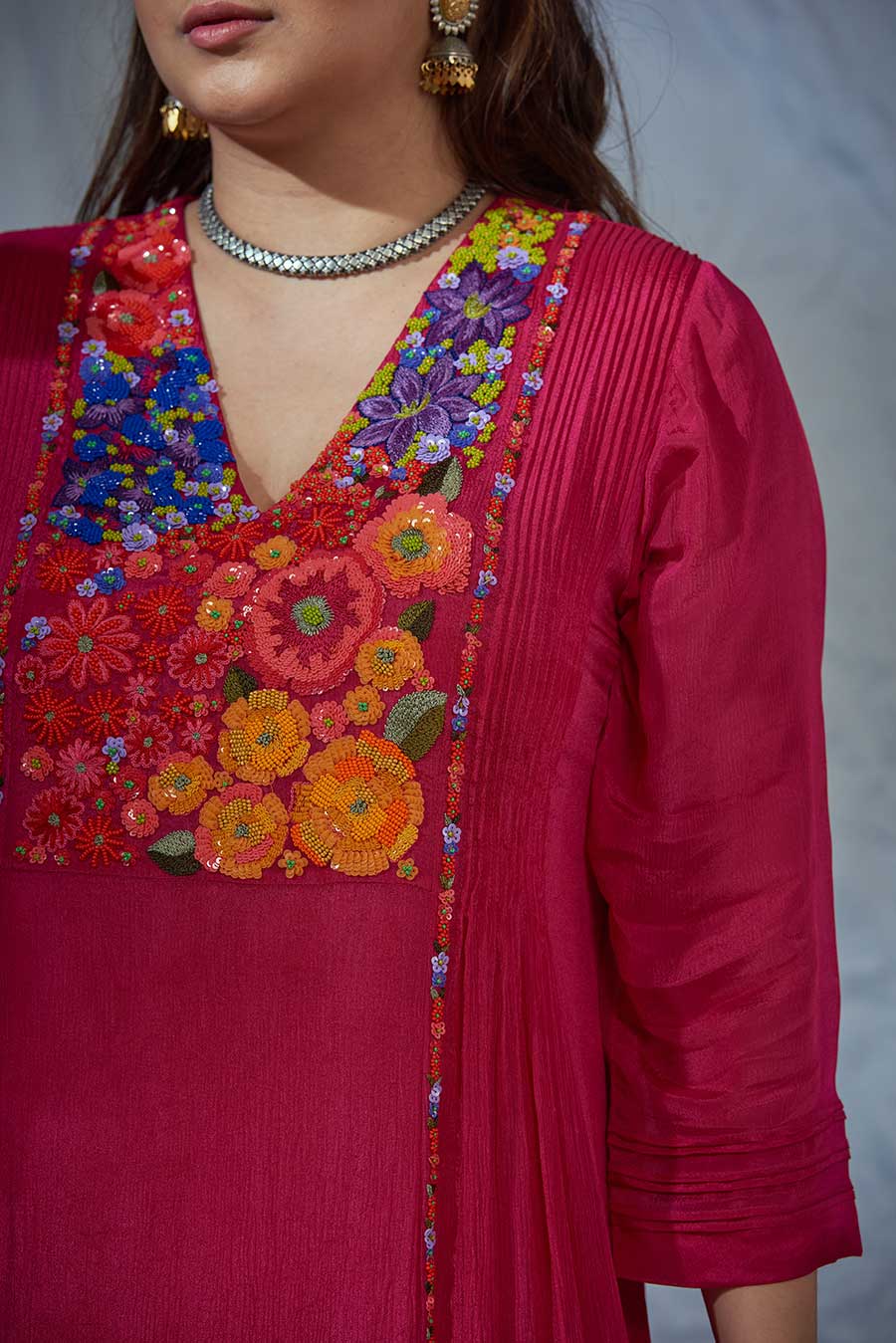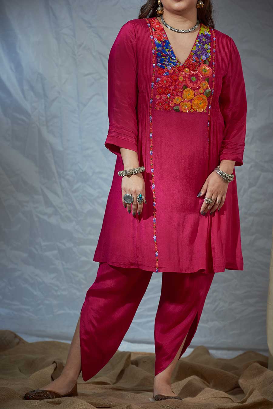 A modern Avataar to the classic Indian ensemble. Intricate embroidery inspired by traditional floral decor, adorns the neckline, almost like a statement neckpiece. Style it with silver jewellery, mojris, a potli bag and dewy makeup, for a destination wedding function.