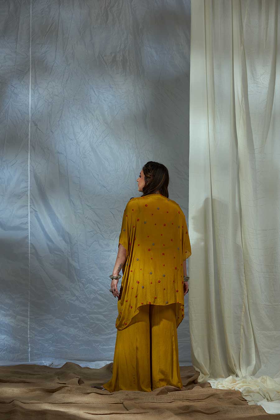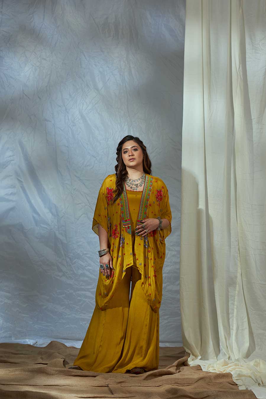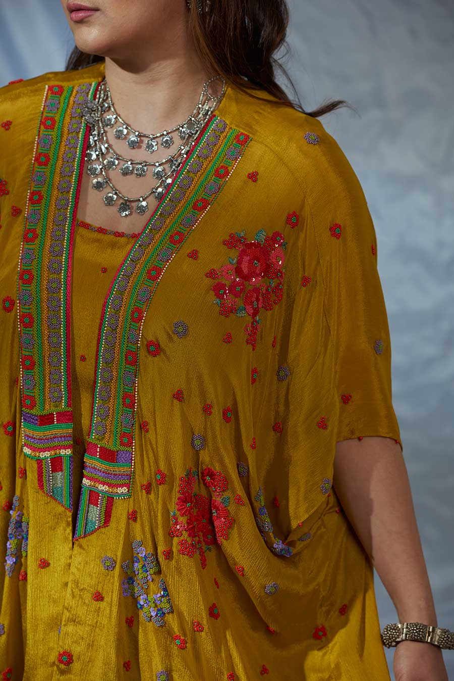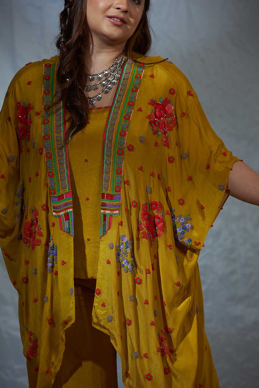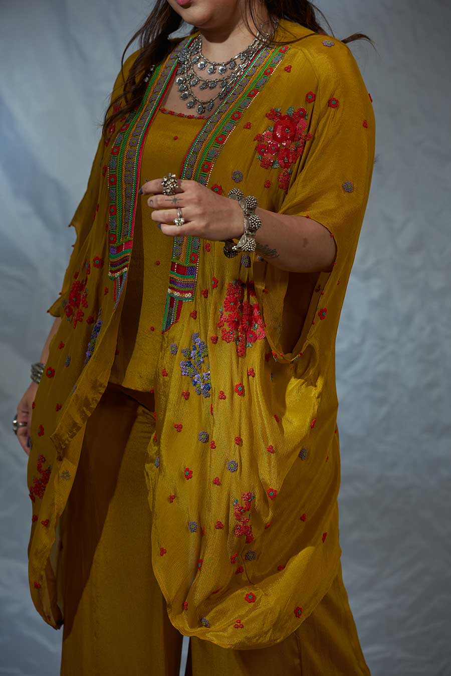 The classic kaftan silhouette but make it an overlay, paired with a top and flared pants. Intricately embroidered flowers, inspired by traditional floral decor, form a statement neckline. This silhouette is perfect for a mehendi function, Cocktail parties, styled with chandelier earrings or a choker necklace, a sequins clutch, and metallic make up.