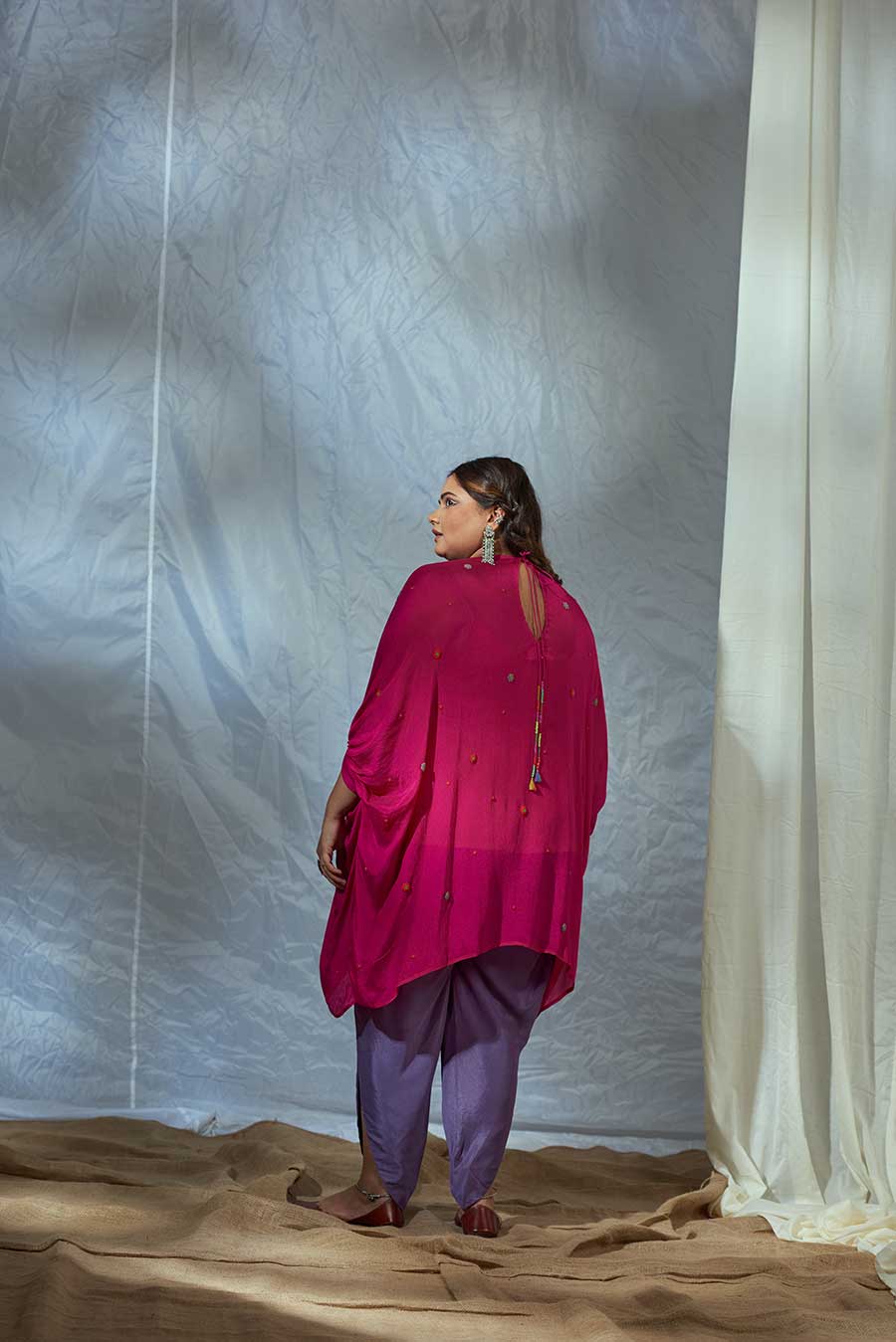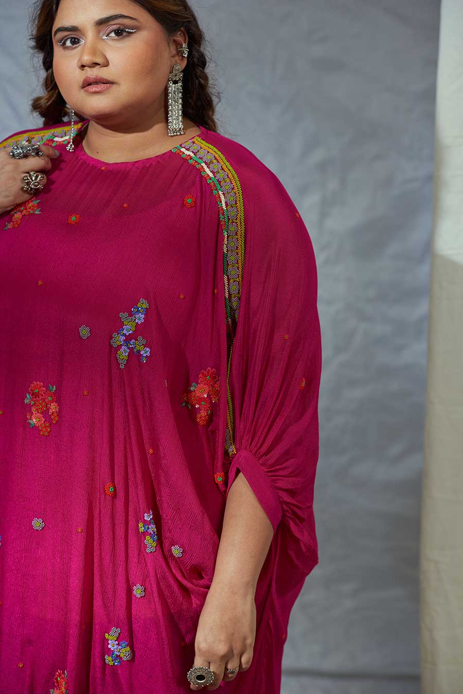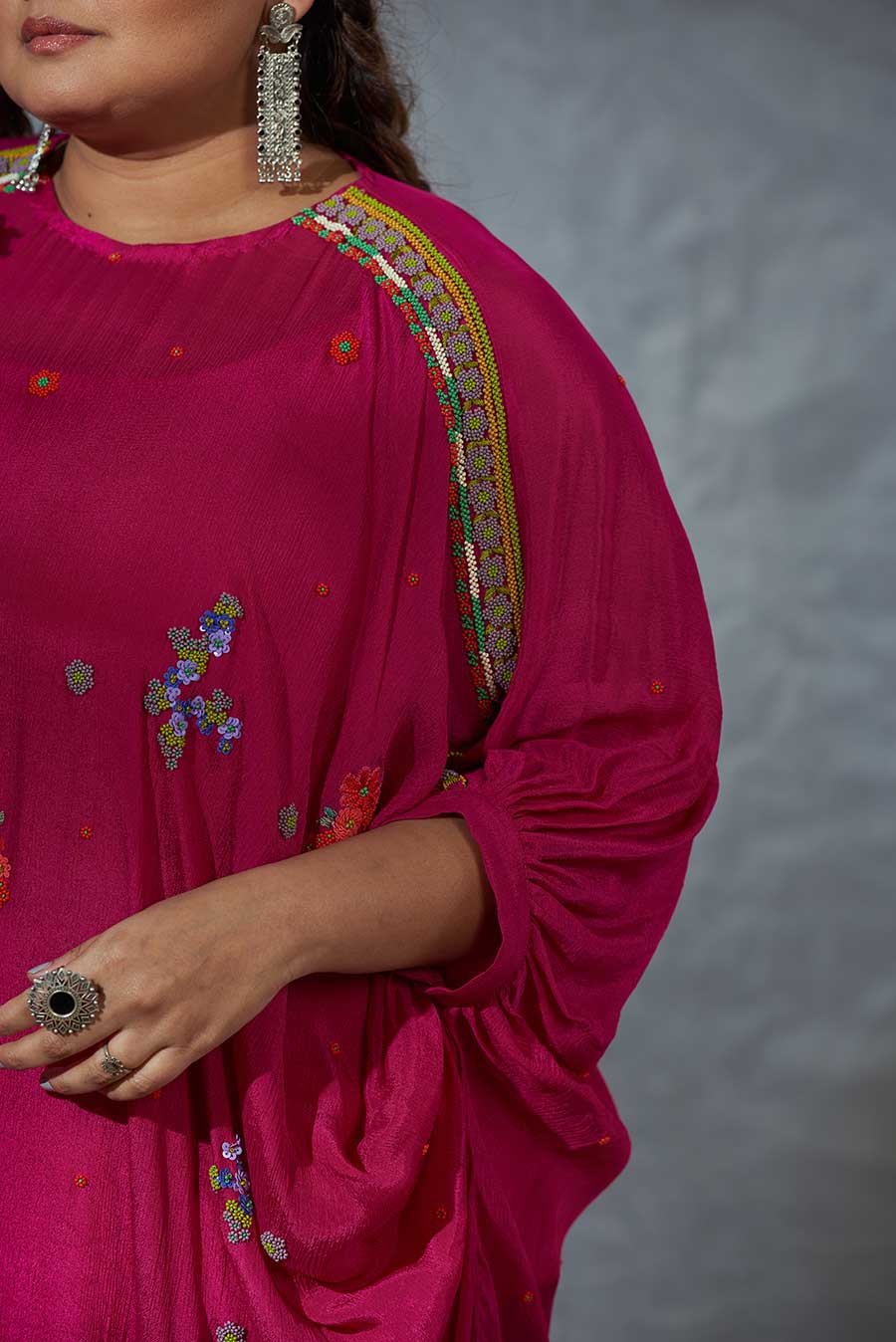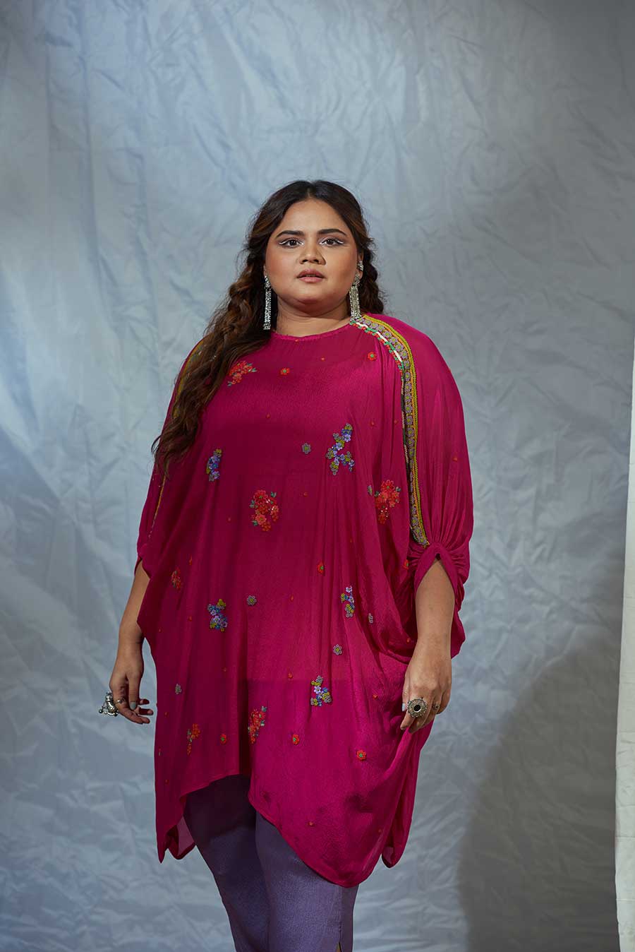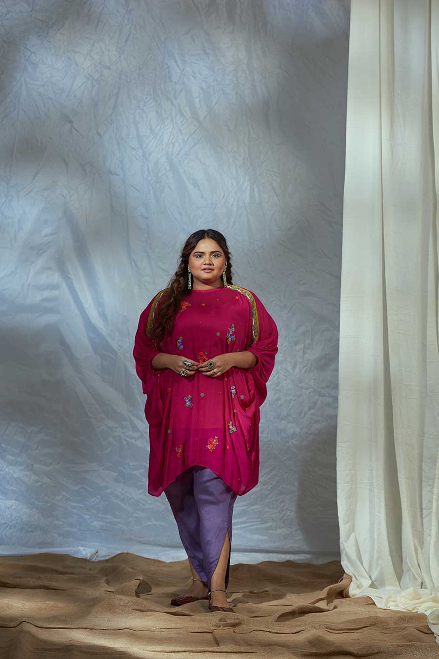 A versatile silhouette, which can be styled both western and Indian. Intricate embroidery inspired by traditional floral decor are spread all across the front of the tunic. Style with dhoti pants, Morris, metallic hoops, and a side braid.