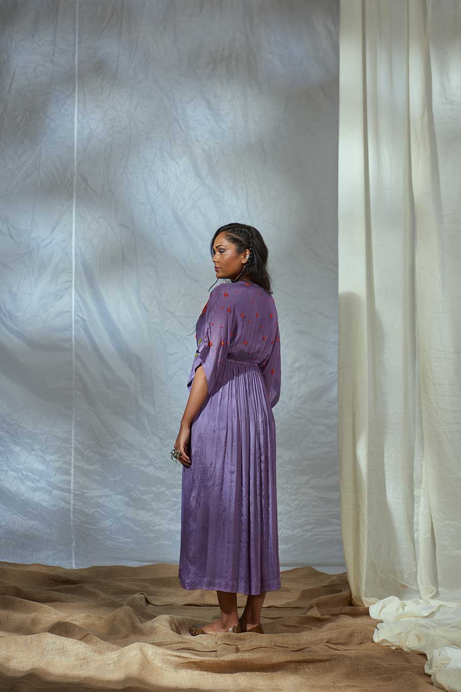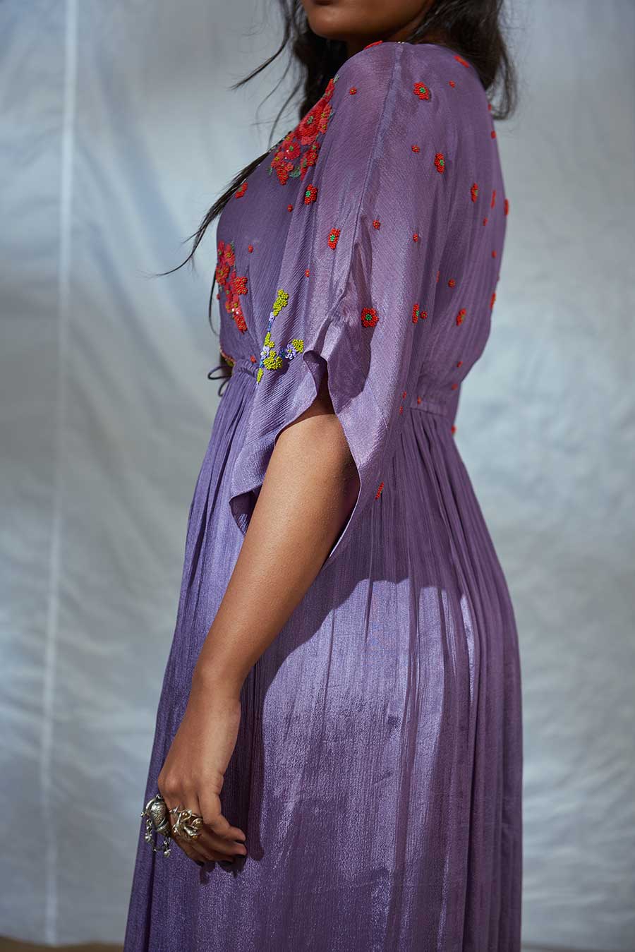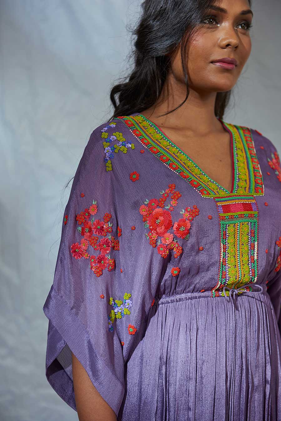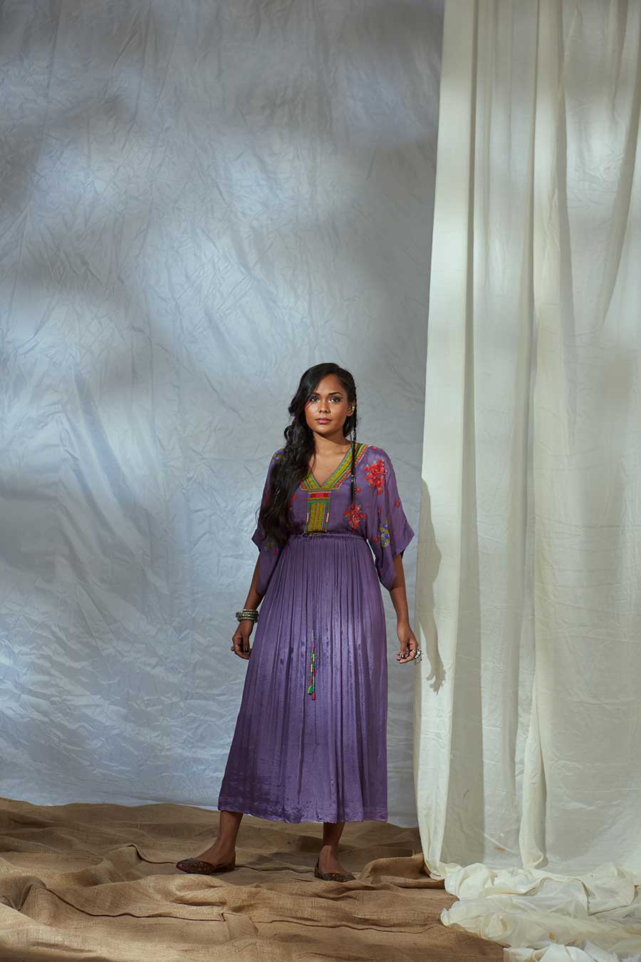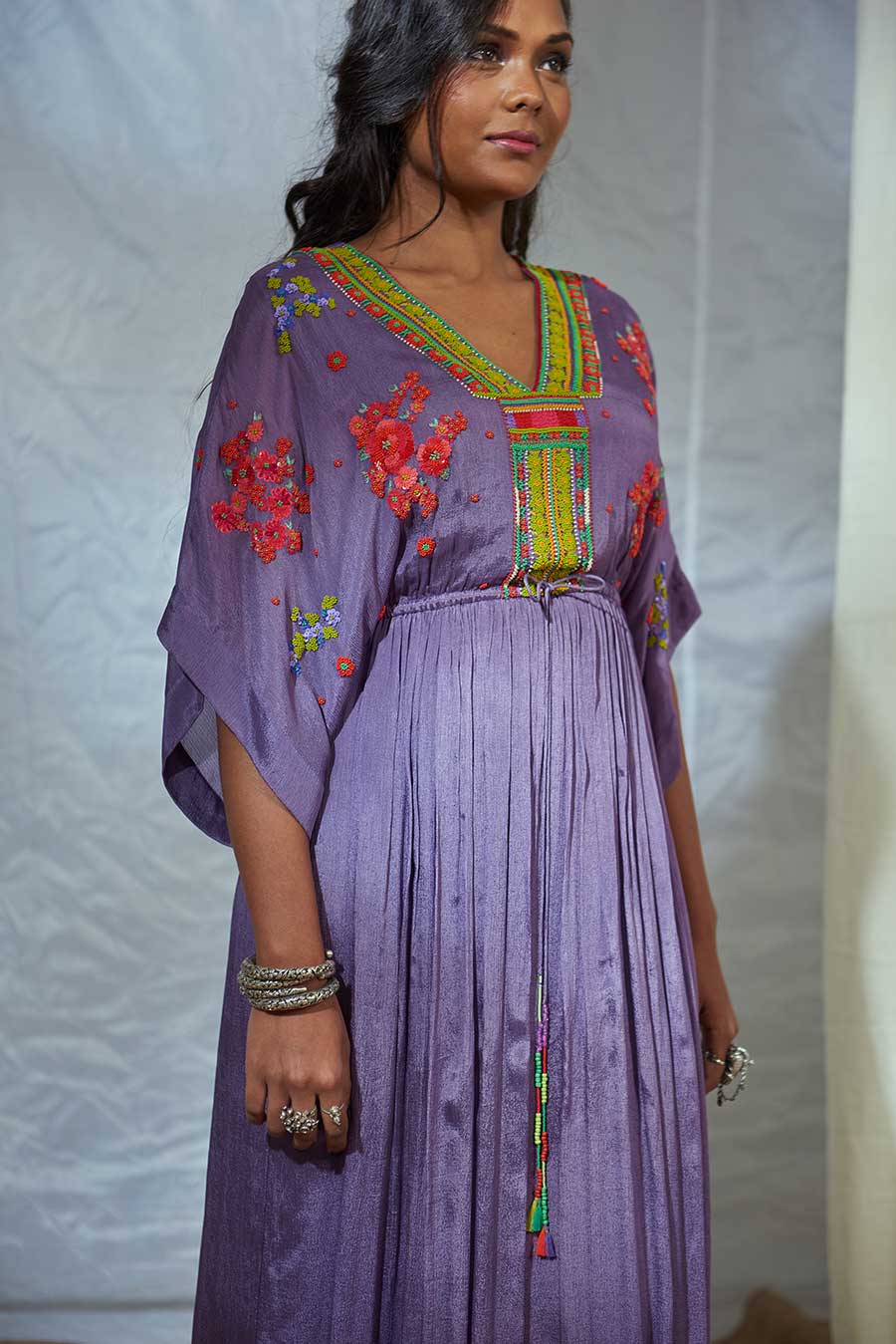 Inspired by the classic kaftan, this tie up midi dress is the new modern Indian look. Intricately embroidered flowers, inspired by traditional floral decor, form a statement neckline. This silhouette is perfect for a mehendi function, Cocktail parties, styled with chandelier earrings or a choker necklace, a sequins clutch, and metallic make up.
