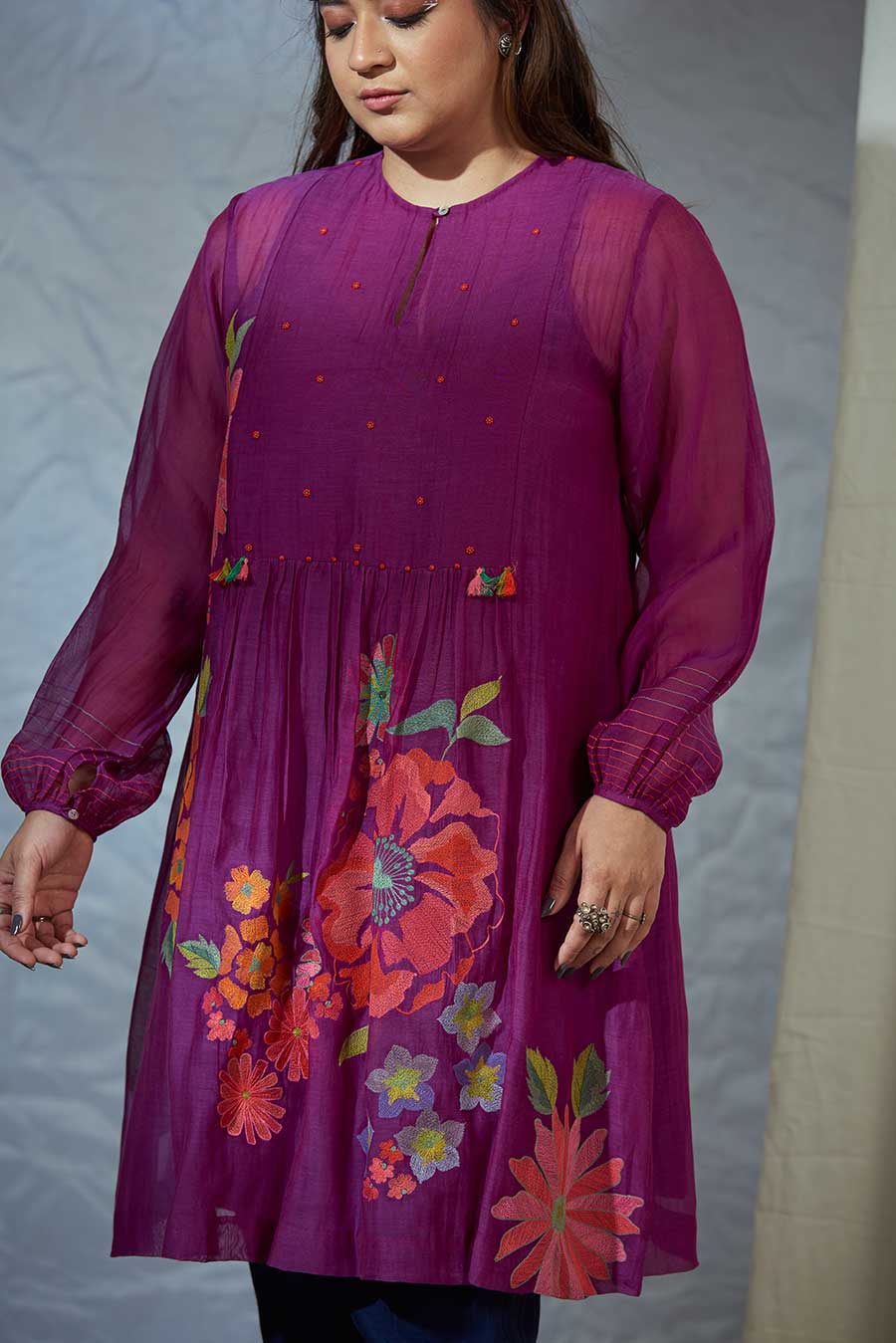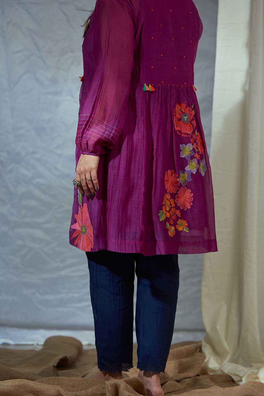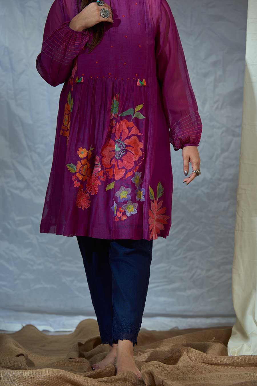 A versatile dress, it takes you from brunch to an evening out. The Indian flowers, rose & marigold embroidered delicately in pop hues, all around the bottom hem of the dress. A fun & relaxed silhouette, styled with jewelled flats, gold hoops, and a side braid.