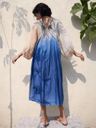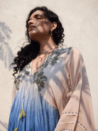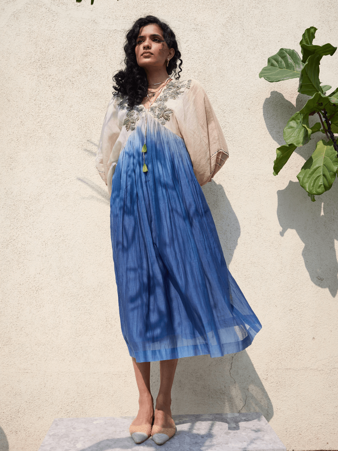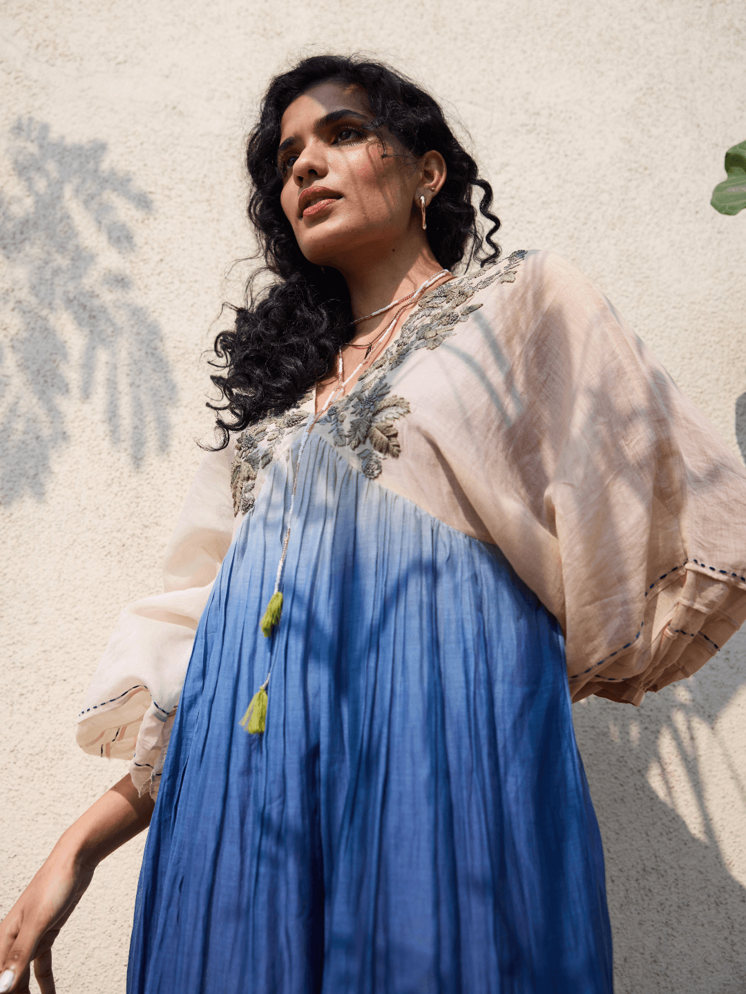 A summer dress that will make you swirl. The ombré from ecru to blue depicts the summer skies and ocean. The delicate hand embroidery sits beautifully, almost like a neck piece.