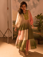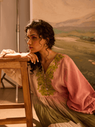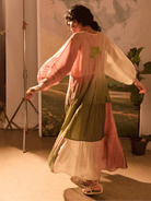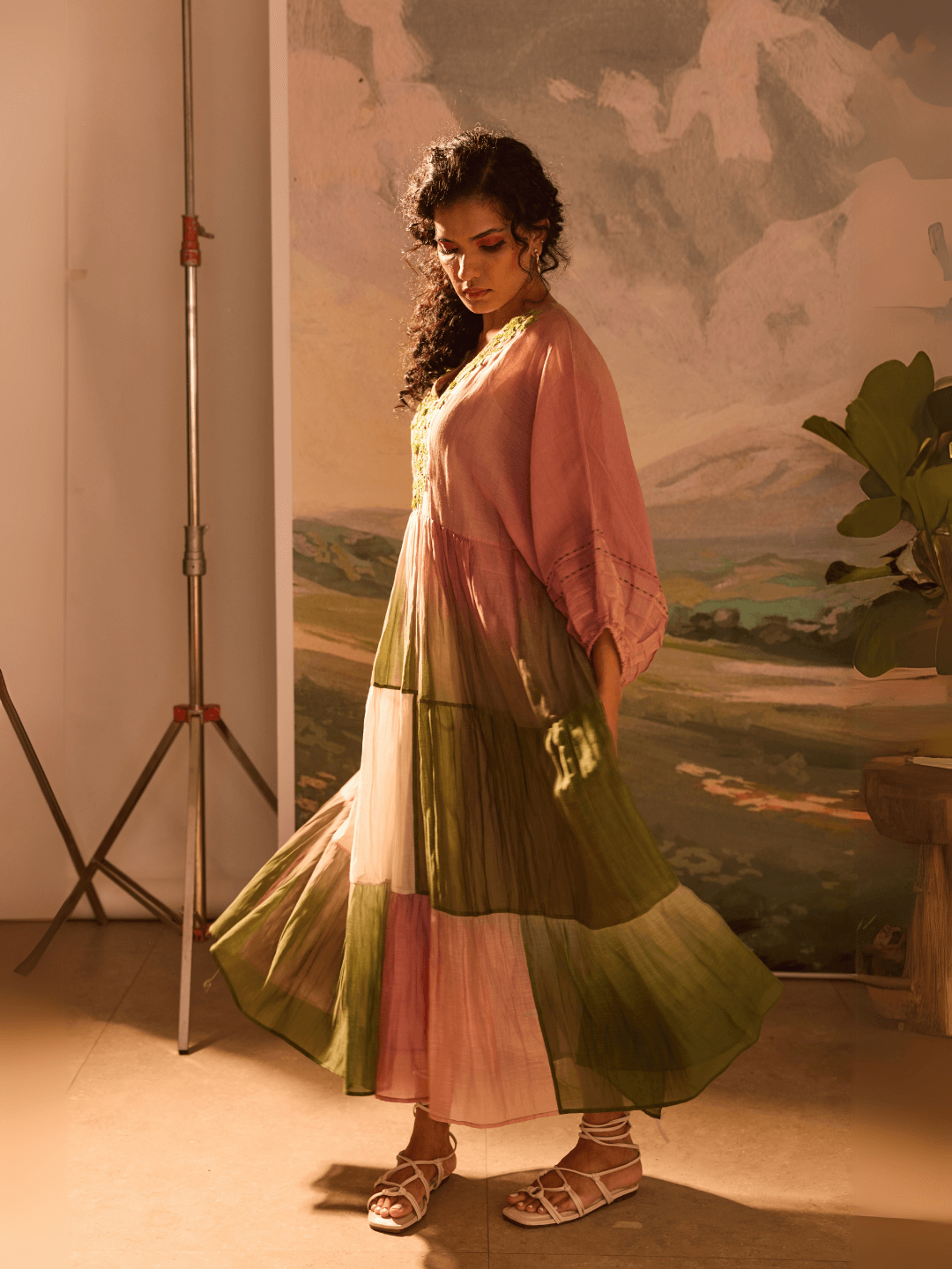 A summer dress that will make you swirl. The ombré from pink to green, depicts nature in its spring hues. The delicate hand embroidery sits beautifully, almost like a neck piece.