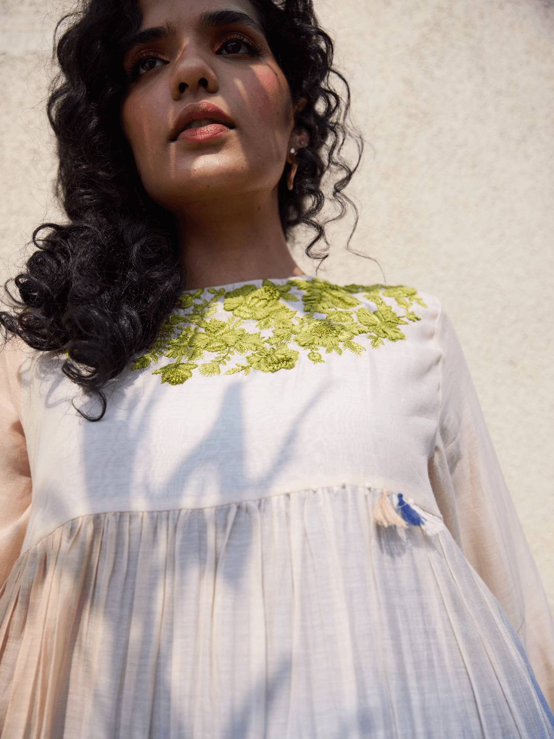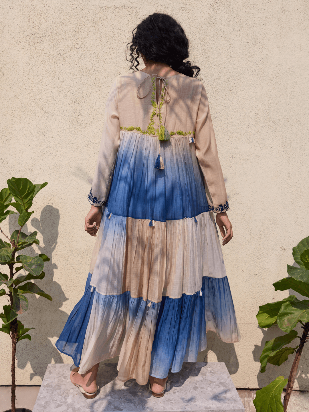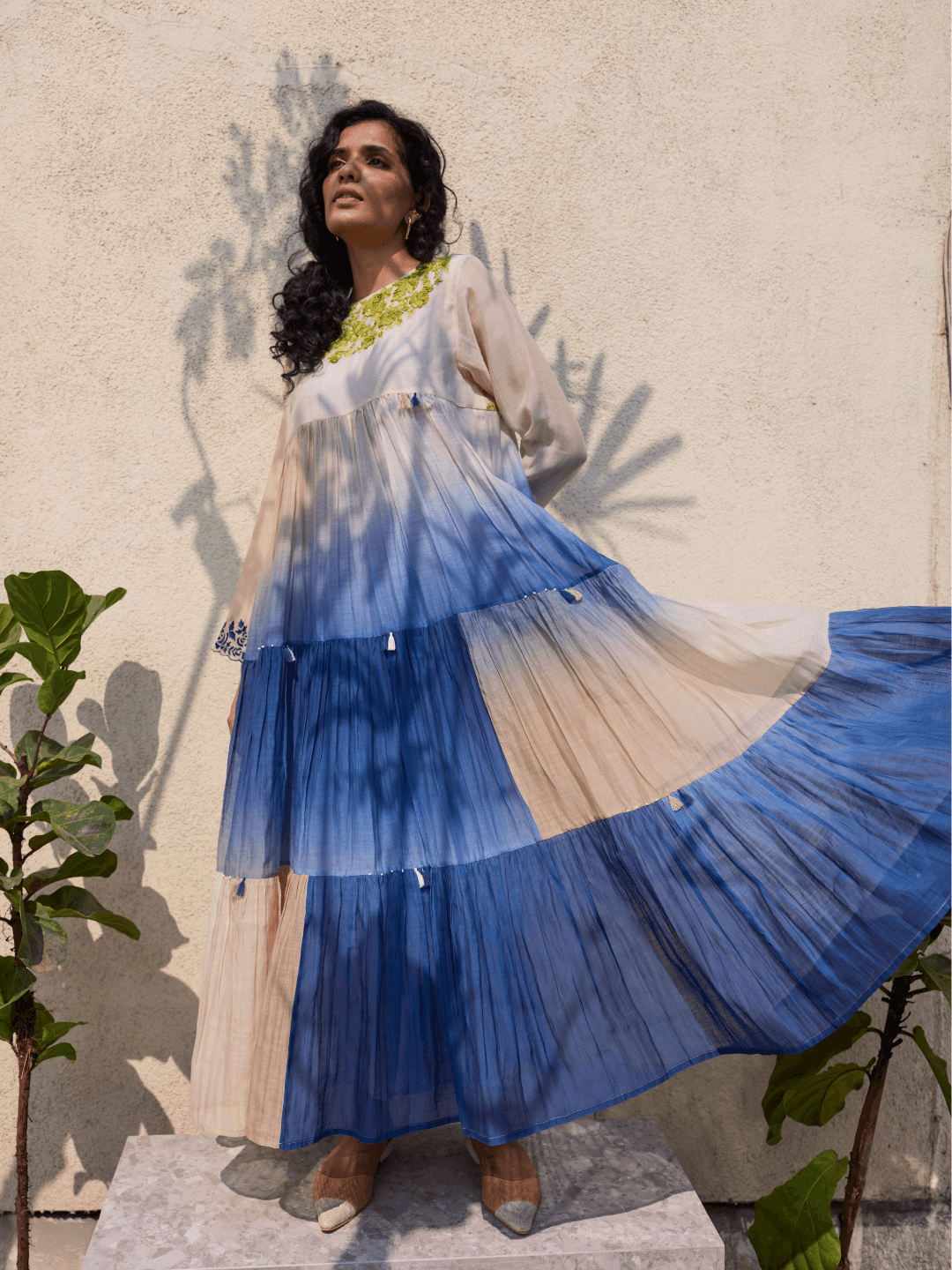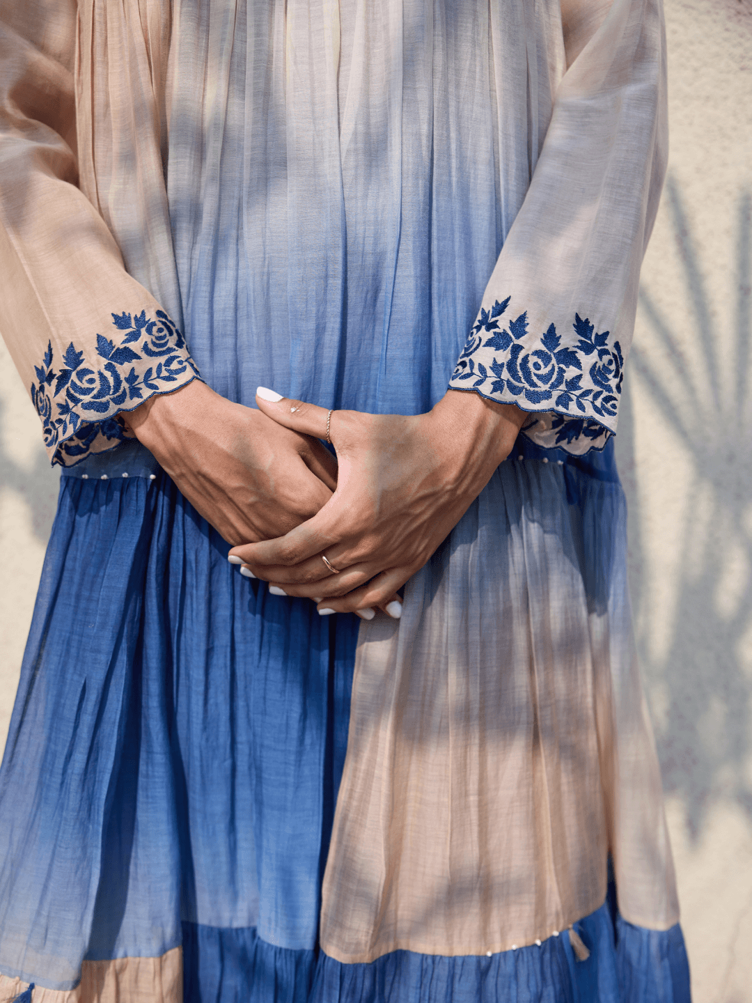 A summer dress that will make you swirl. The ombré from ecru to blue depicts the summer skies and ocean. The delicate hand embroidery sits beautifully, almost like a neck piece.