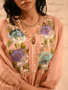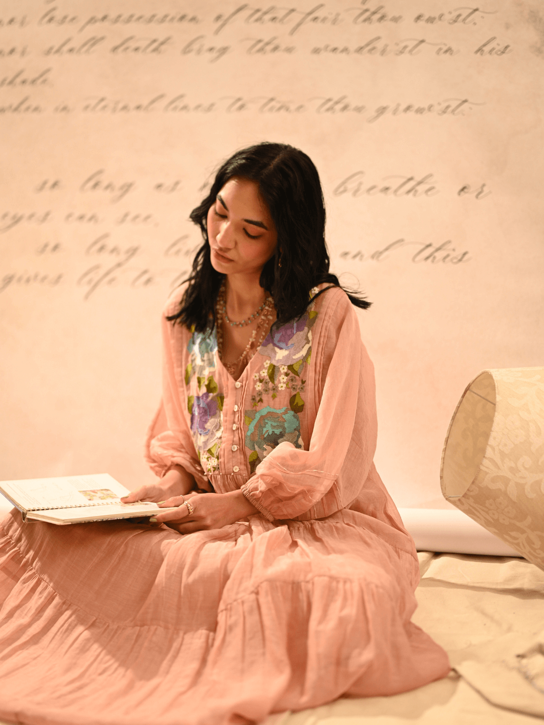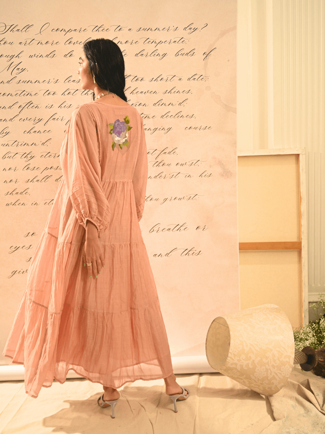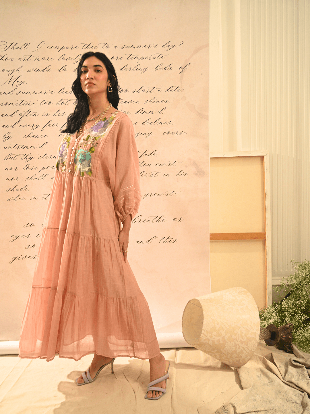 A summer dress that will make you swirl. The design depicts nature in its spring hues. The delicate hand embroidery sits beautifully, almost like a neck piece. The handwoven Chanderi dress is perfect for those summer brunches, resort travel. Style with tie up sandals, delicate jewellery and dewy make up.