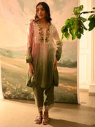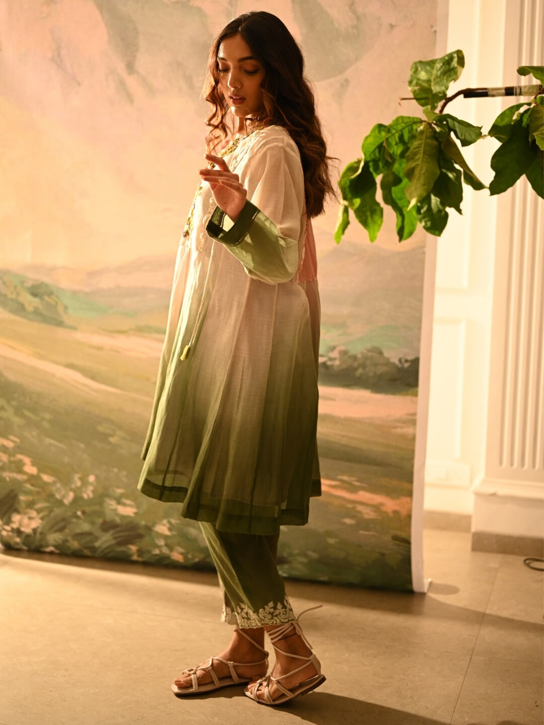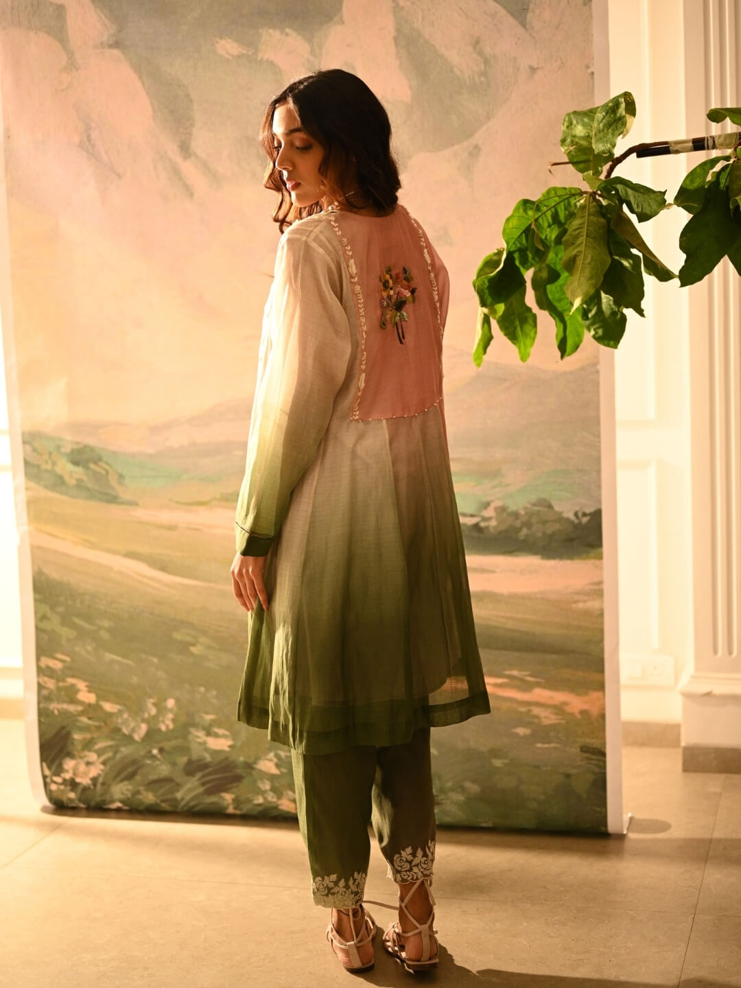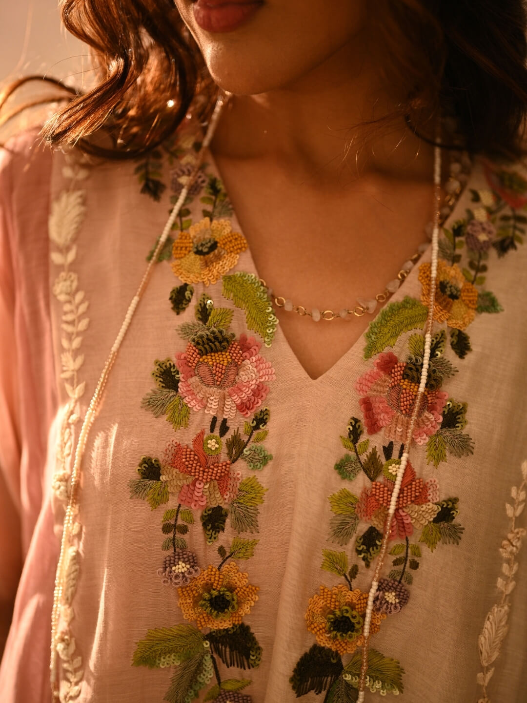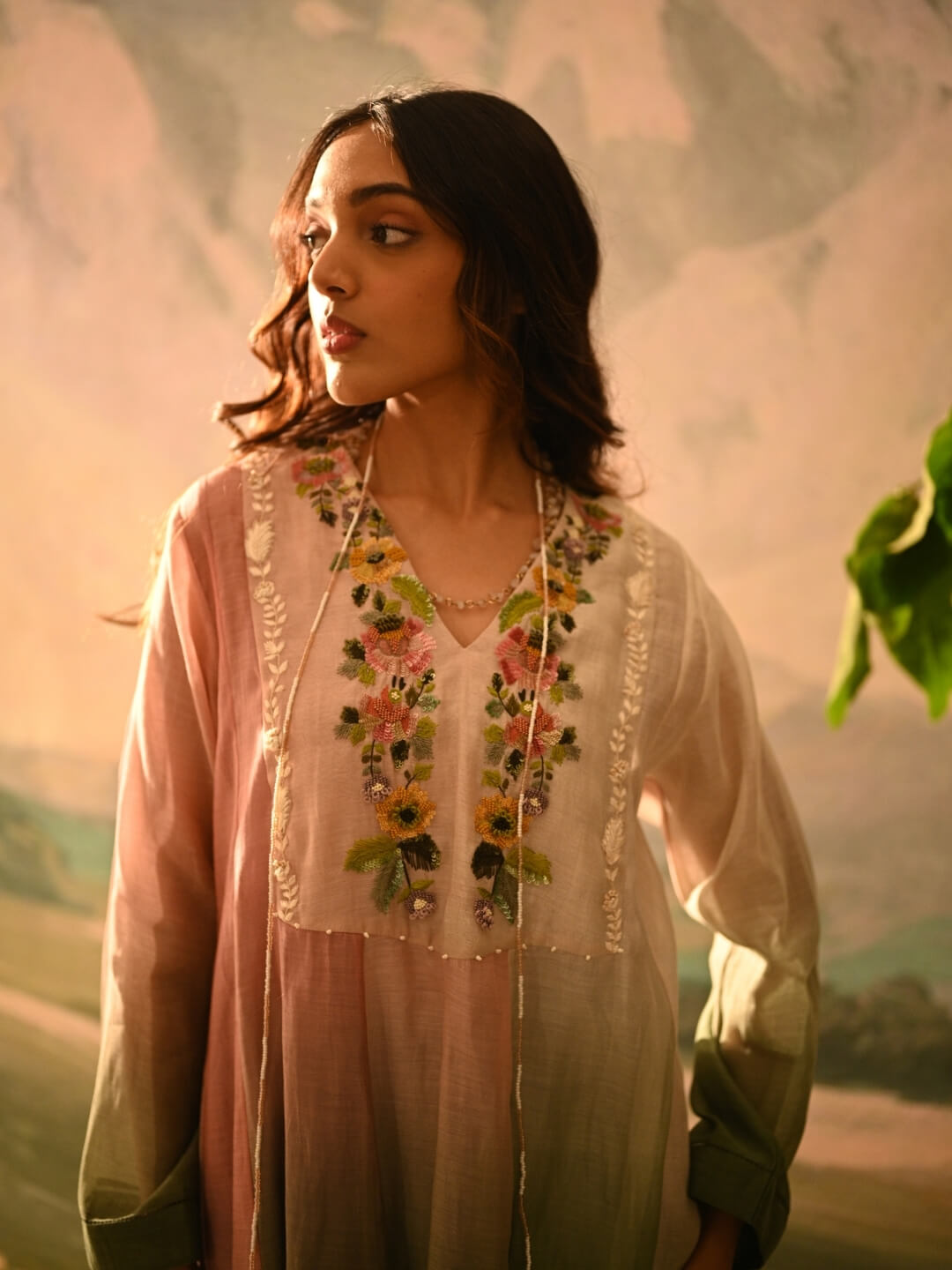 Watercolour flowers transformed into intricate embroidery, almost like art, sit beautifully on the neckline. The ombré hues, make it the perfect spring colour palette.