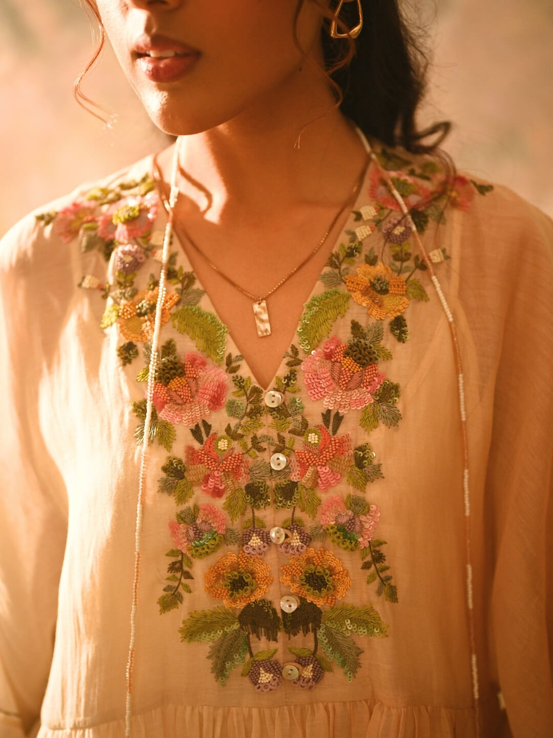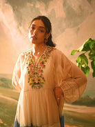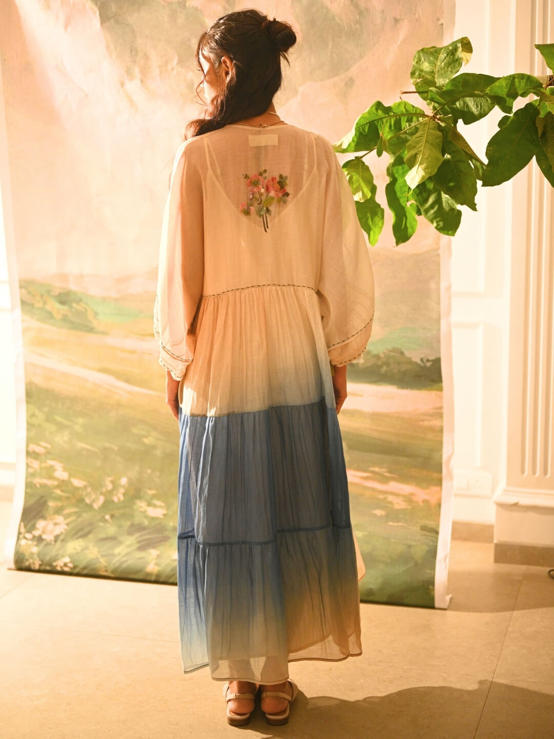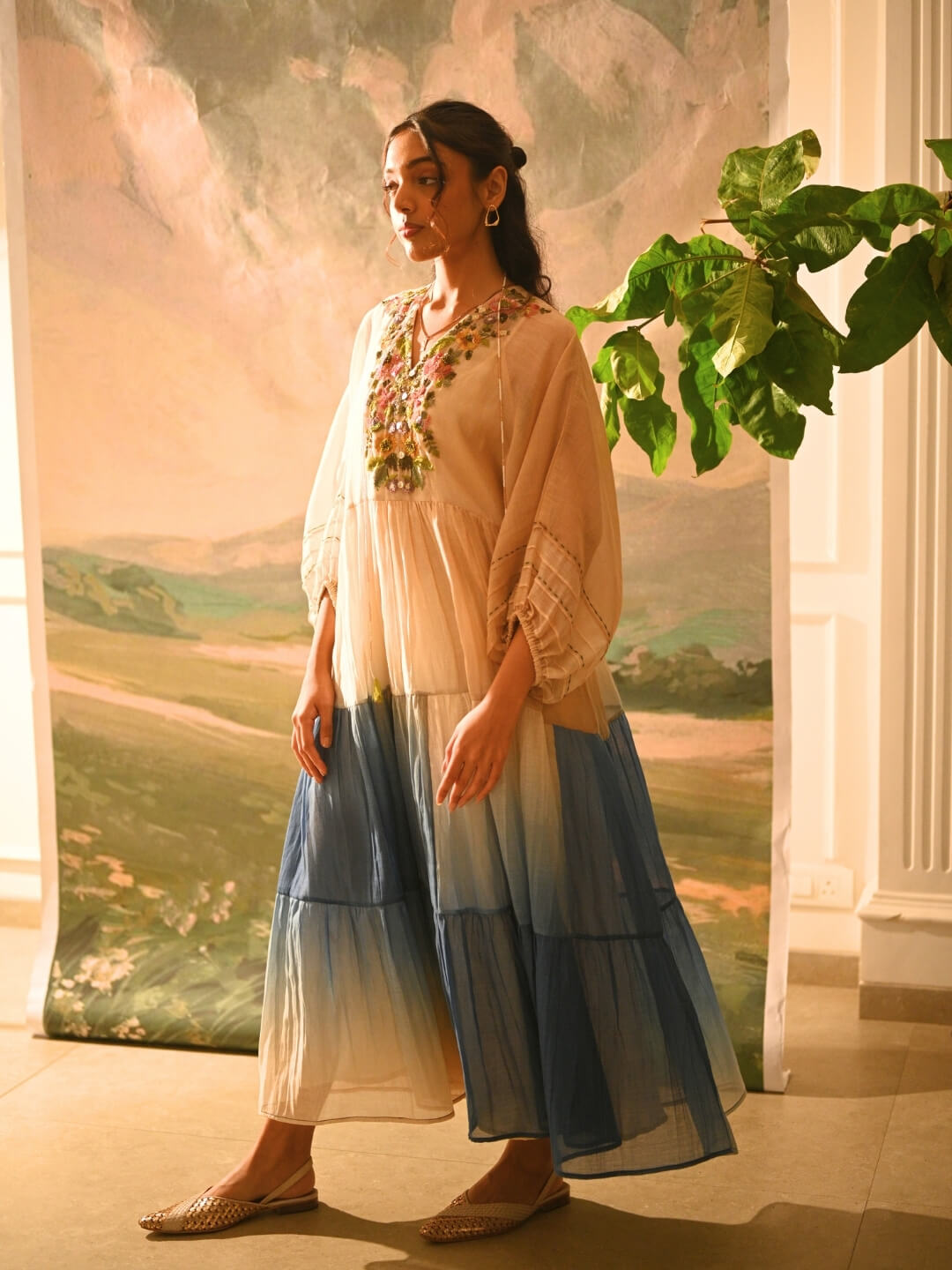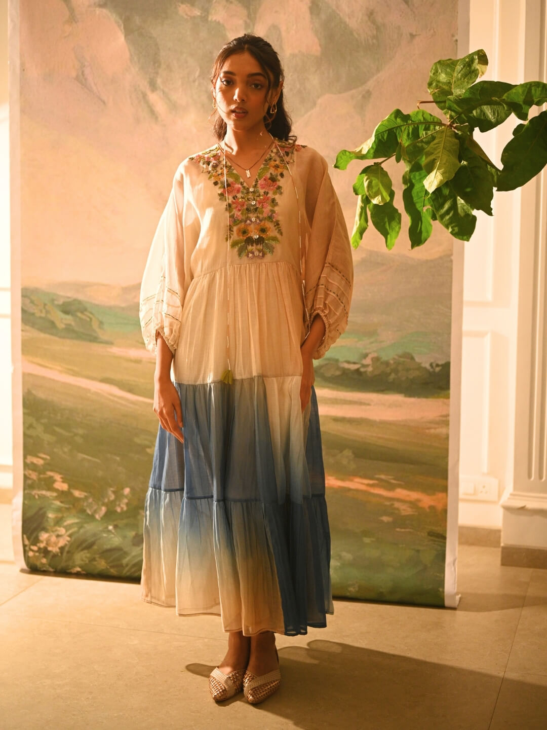 A dress that will make you swirl. The ombré from ecru to blue, depicts ocean in its hues. The delicate hand embroidery sits beautifully, almost like a neck piece.