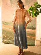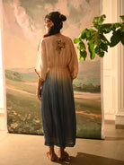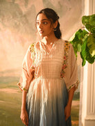 A summer dress that will make you swirl. The ecru and blue ombré with the contrast intricate embroidery depicts blue skies. The subtle gather detail on the neckline adds a romantic feel.