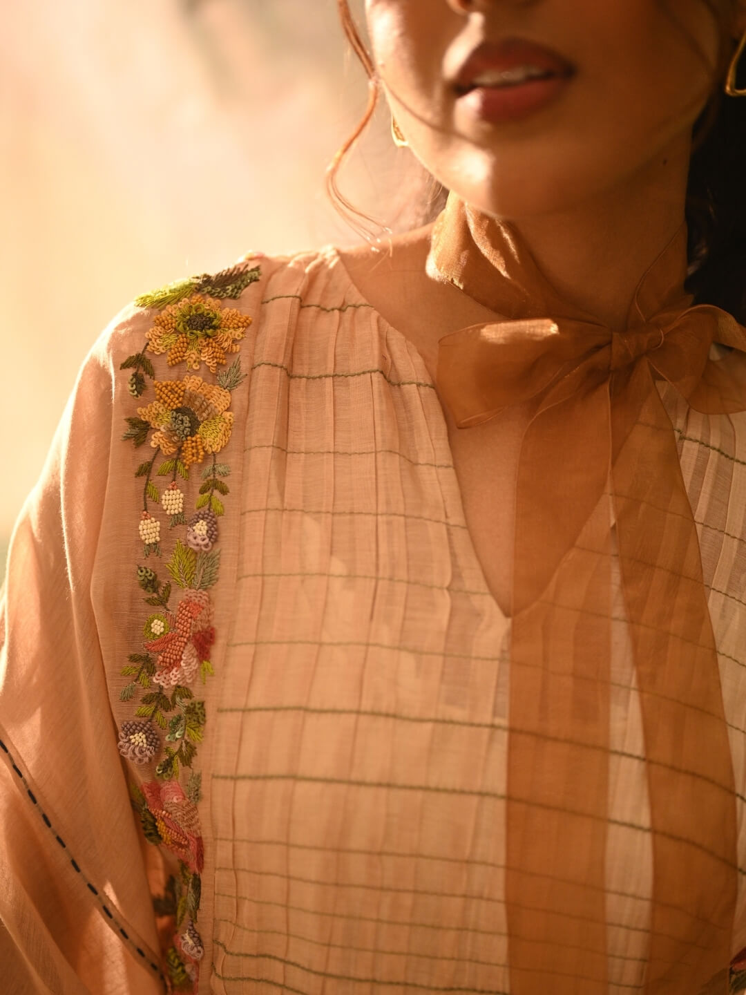 The handwoven Chanderi dress is perfect for brunches & resort travel. Style with tie up sandals, delicate jewellery and dewy make up.