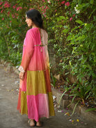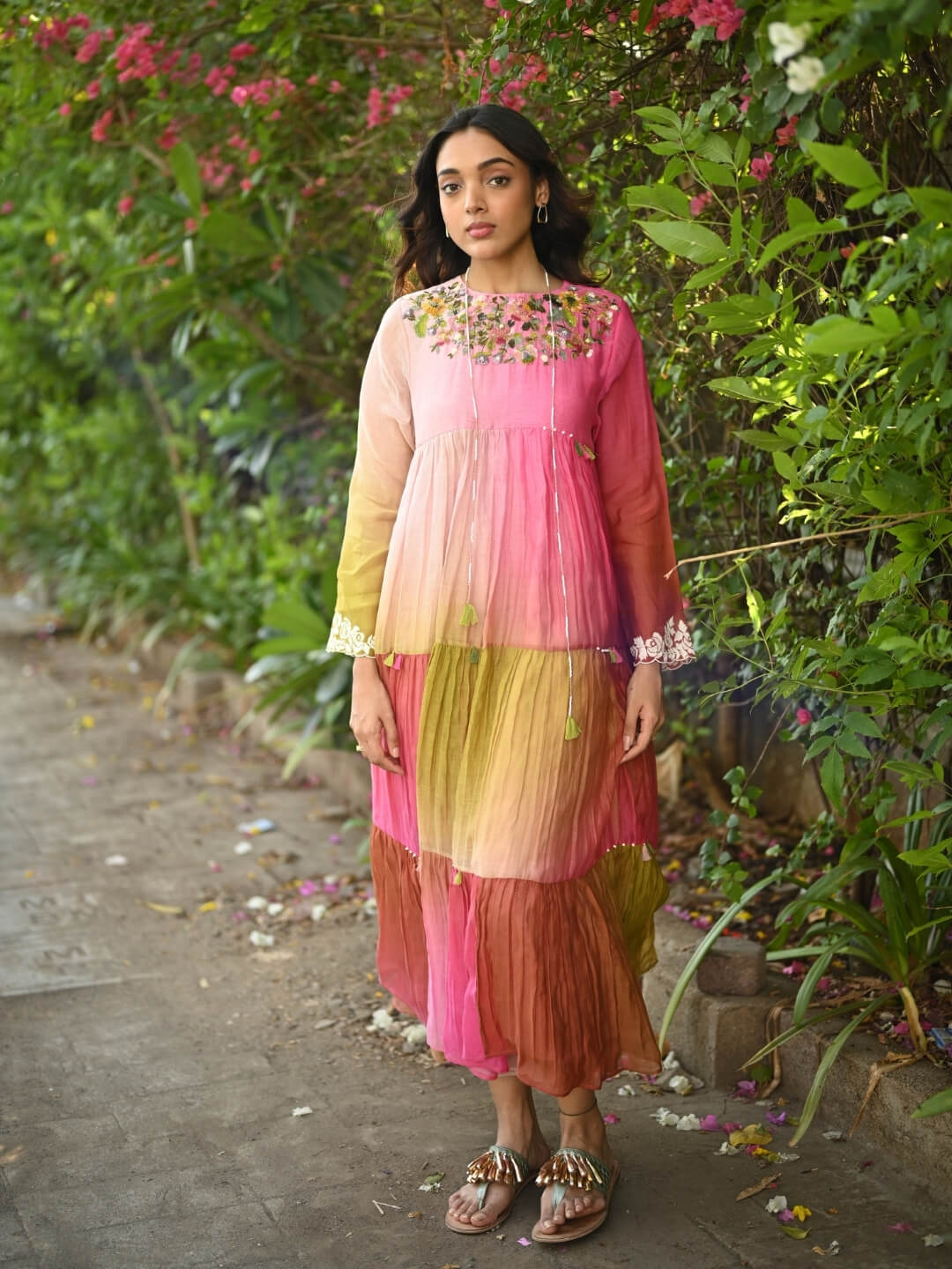 The handwoven Chanderi dress is perfect for those summer weddings, with silver jewellery and dewy make up.