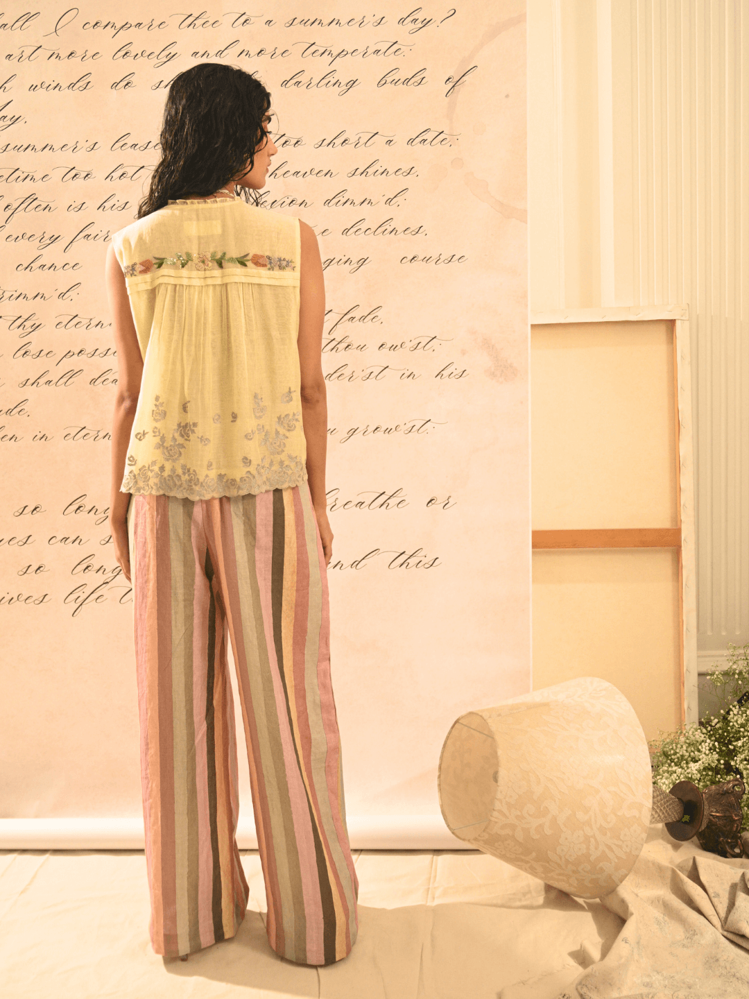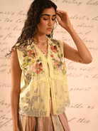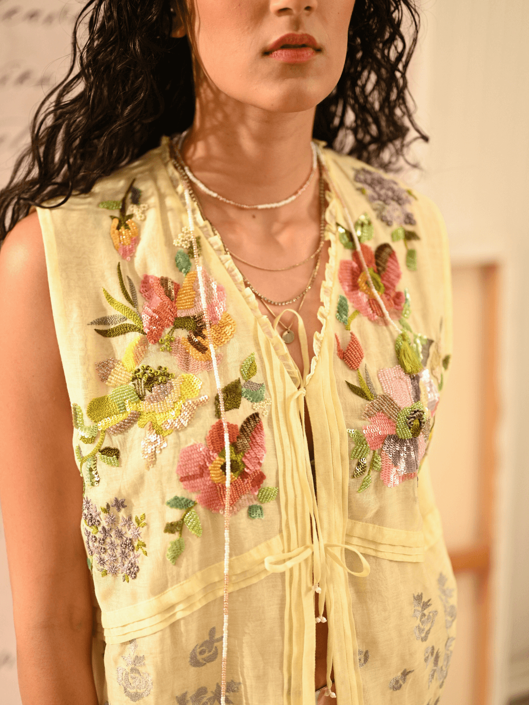 Intricate floral embroidery, in pastel hues with delicate pleat detailing, and a gathered back make this vest the perfect romantic summer look.
