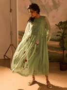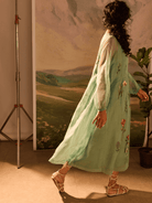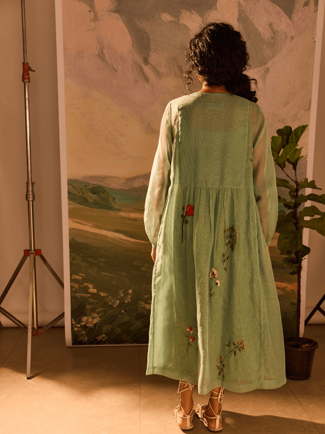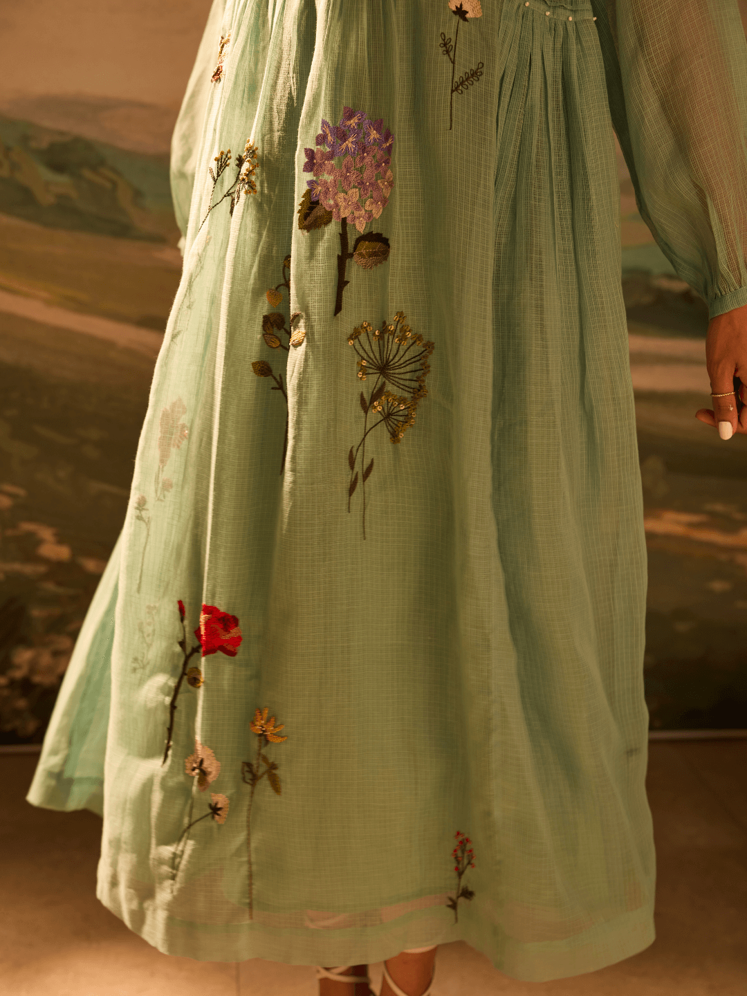 The perfect summer look. The sheer fabric dress is soft, fluid, and off set with intricate floral embroidery, depicting the spring wildflowers across the garden.