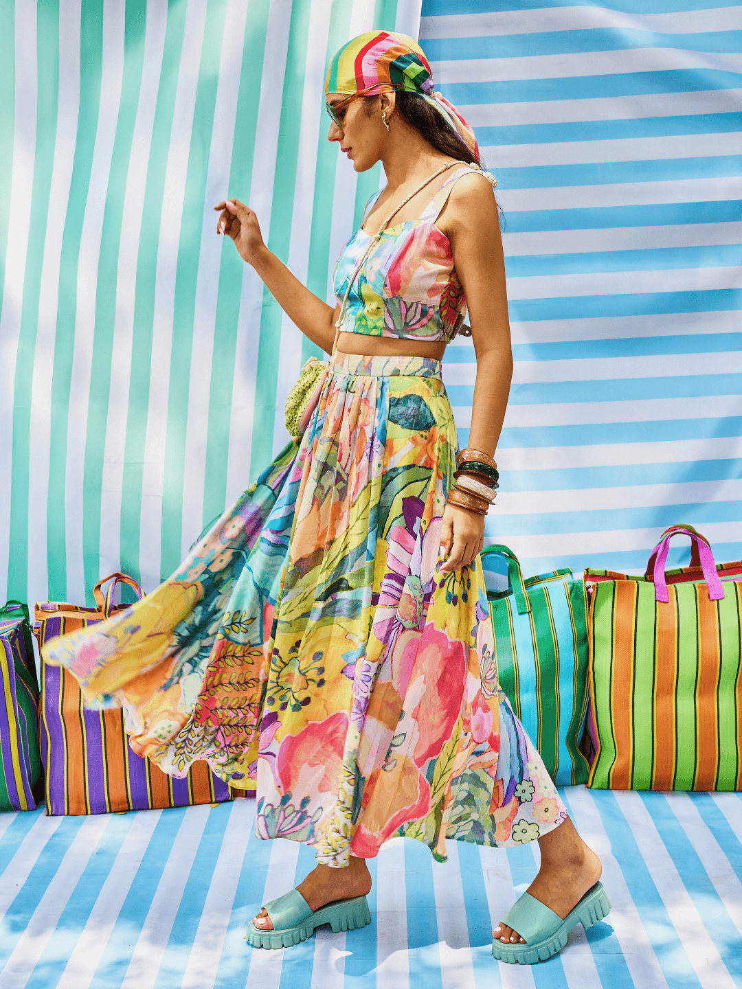 Art meets sunkissed florals. Expressive brushstrokes and blurred shapes in pop hues, creates an impressionist artwork of a spring garden. The printed crop top, is a versatile silhouette. Style it with a high waist skirt, pants or shorts, it’s the perfect resort travel look.
