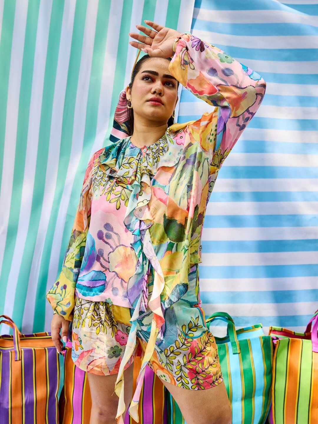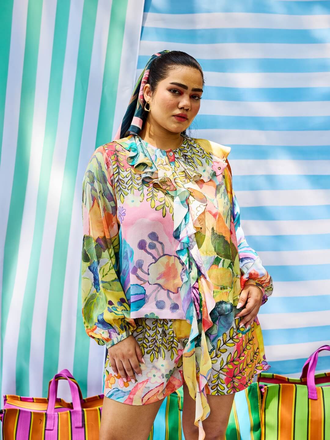 Art meets sunkissed florals. Expressive brushstrokes and blurred shapes in pop hues, creates an impressionist artwork of a spring garden. A classic top, with soft ruffles that cascade from the neckline to the bottom hem, giving it a feminine look. Perfect look for all your resort travels, styled with shorts, trousers or a skirt.