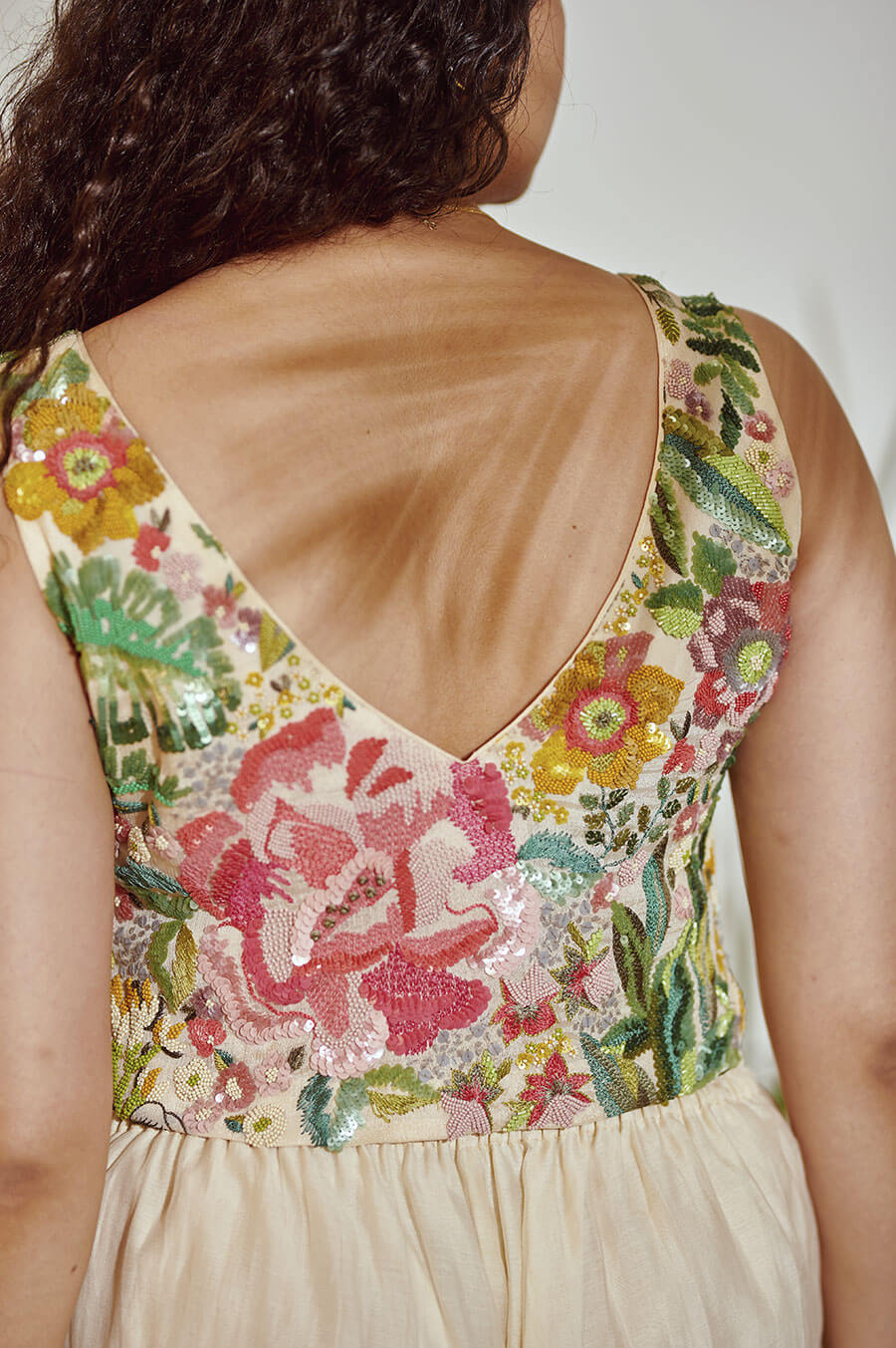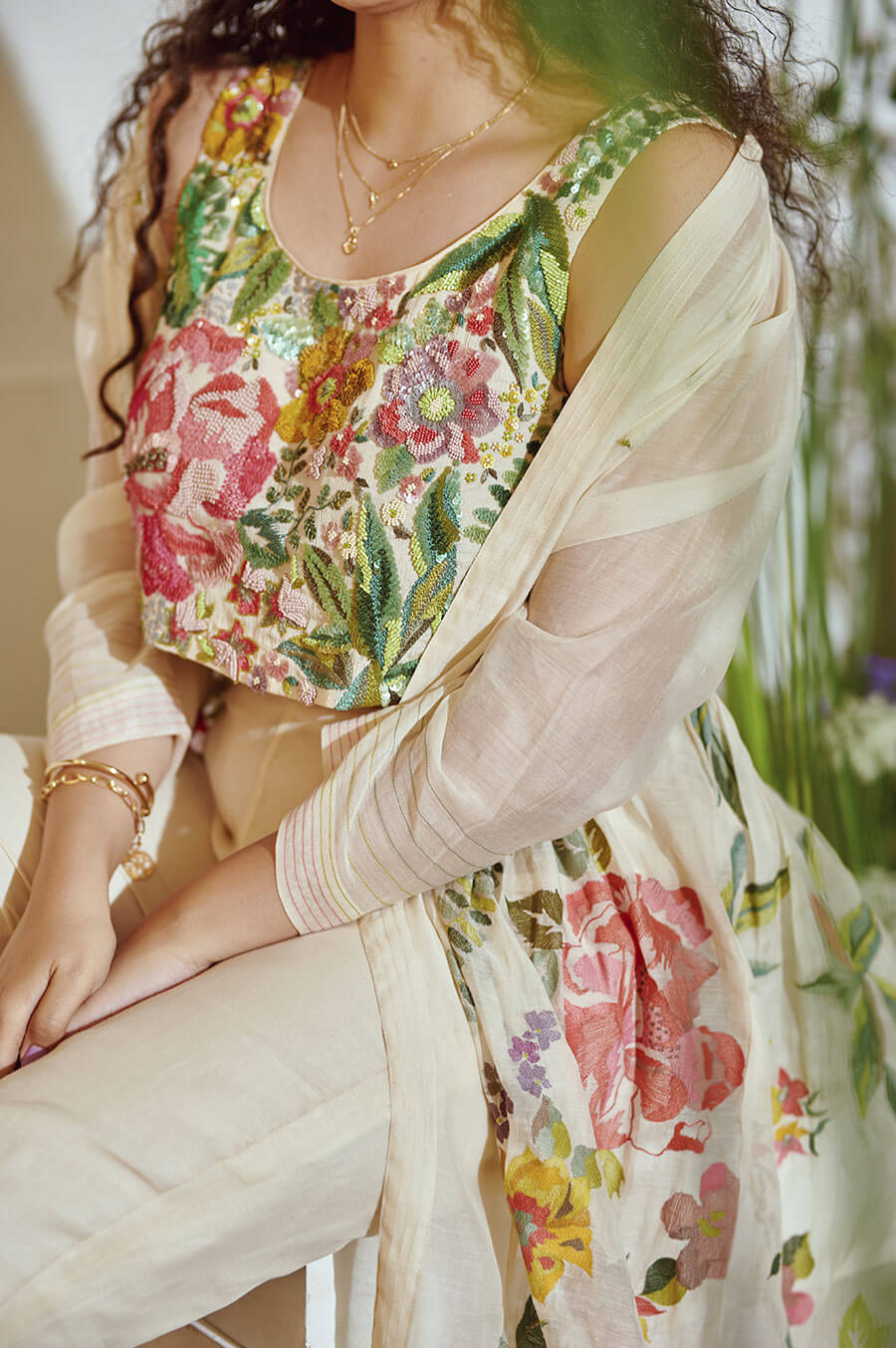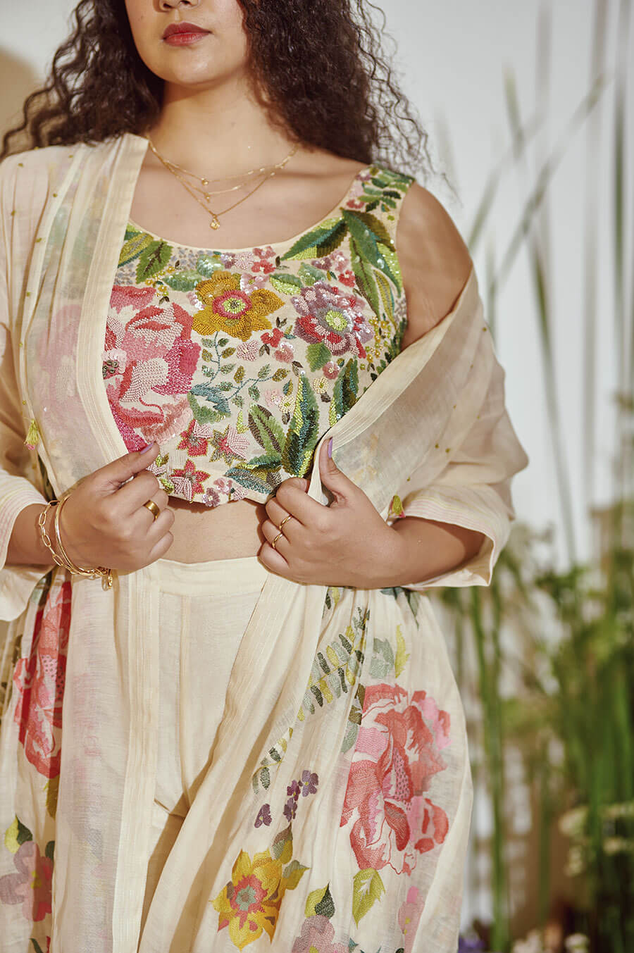 Inspired by a tropical garden, the embroidery is used like art, with pop hues against the subtle ecru background, making it a statement look. Style with a solid hue sari, or with high waist pants, or with a silk lehenga, it will be your most versatile resort wedding look.