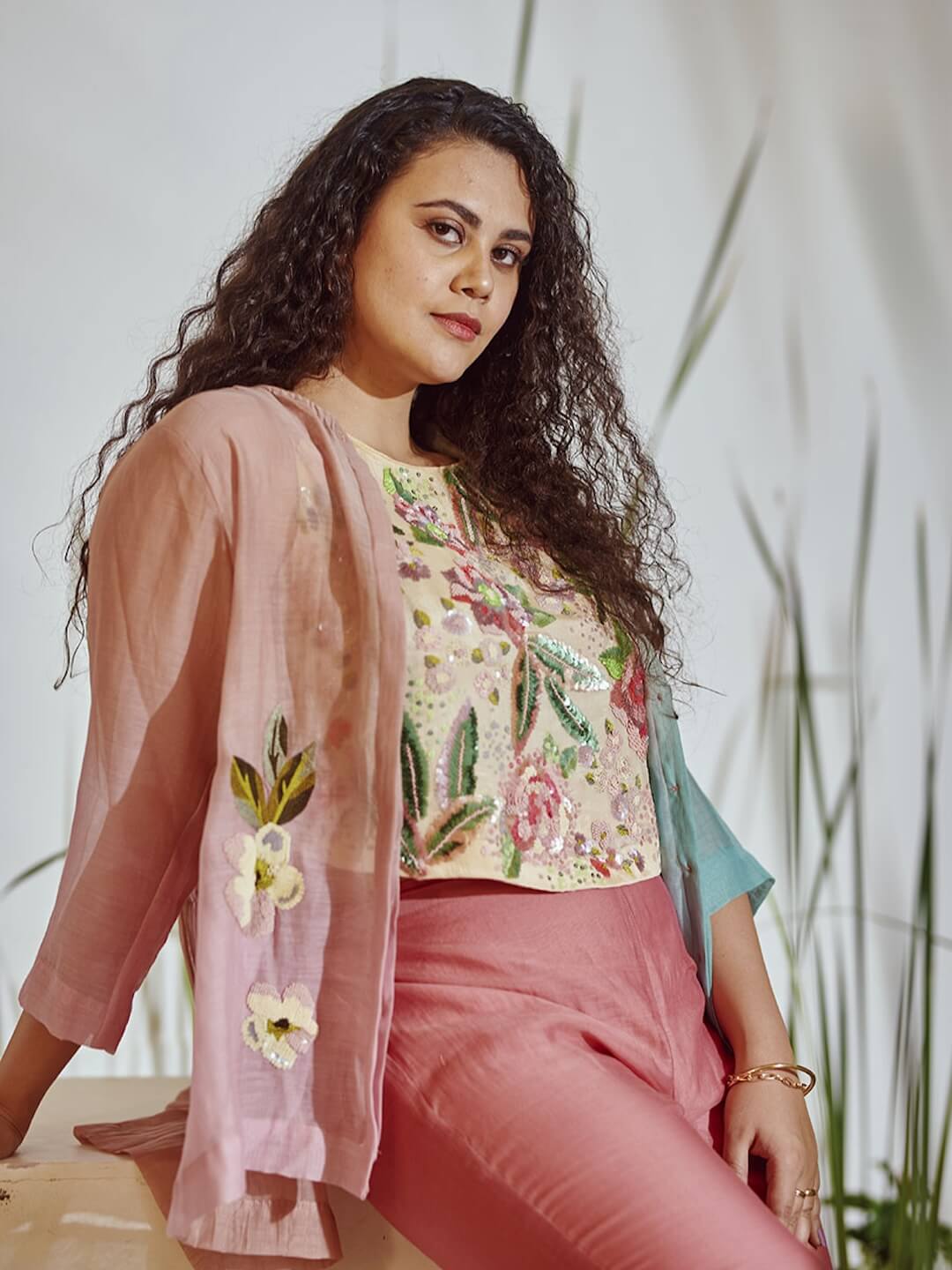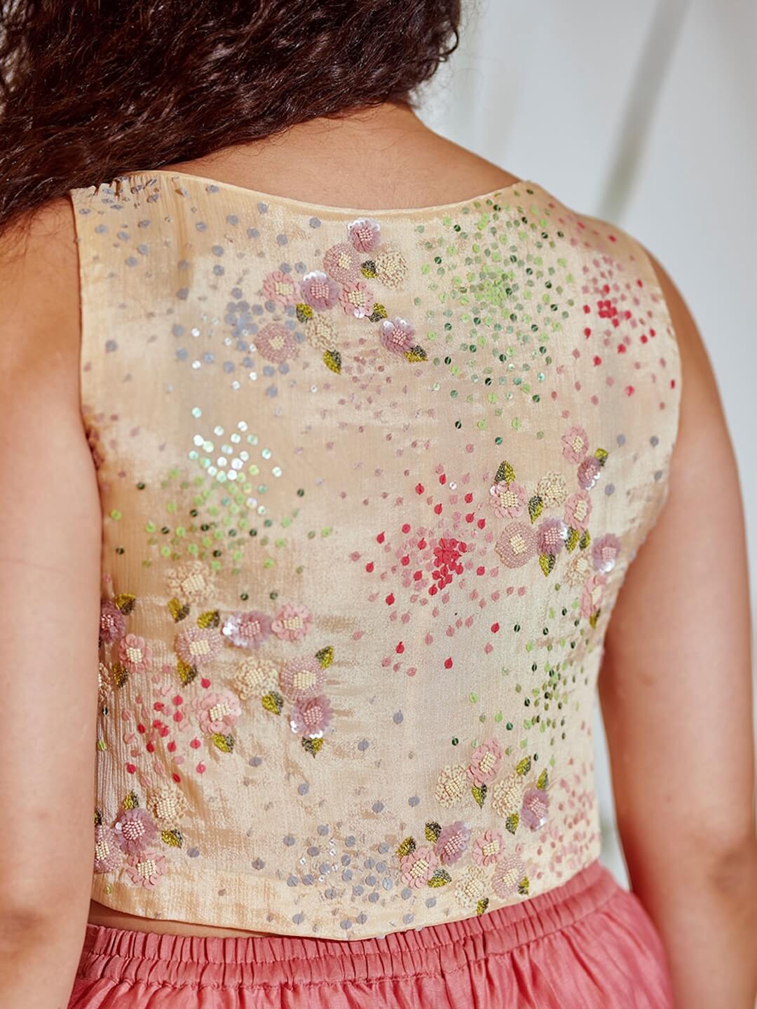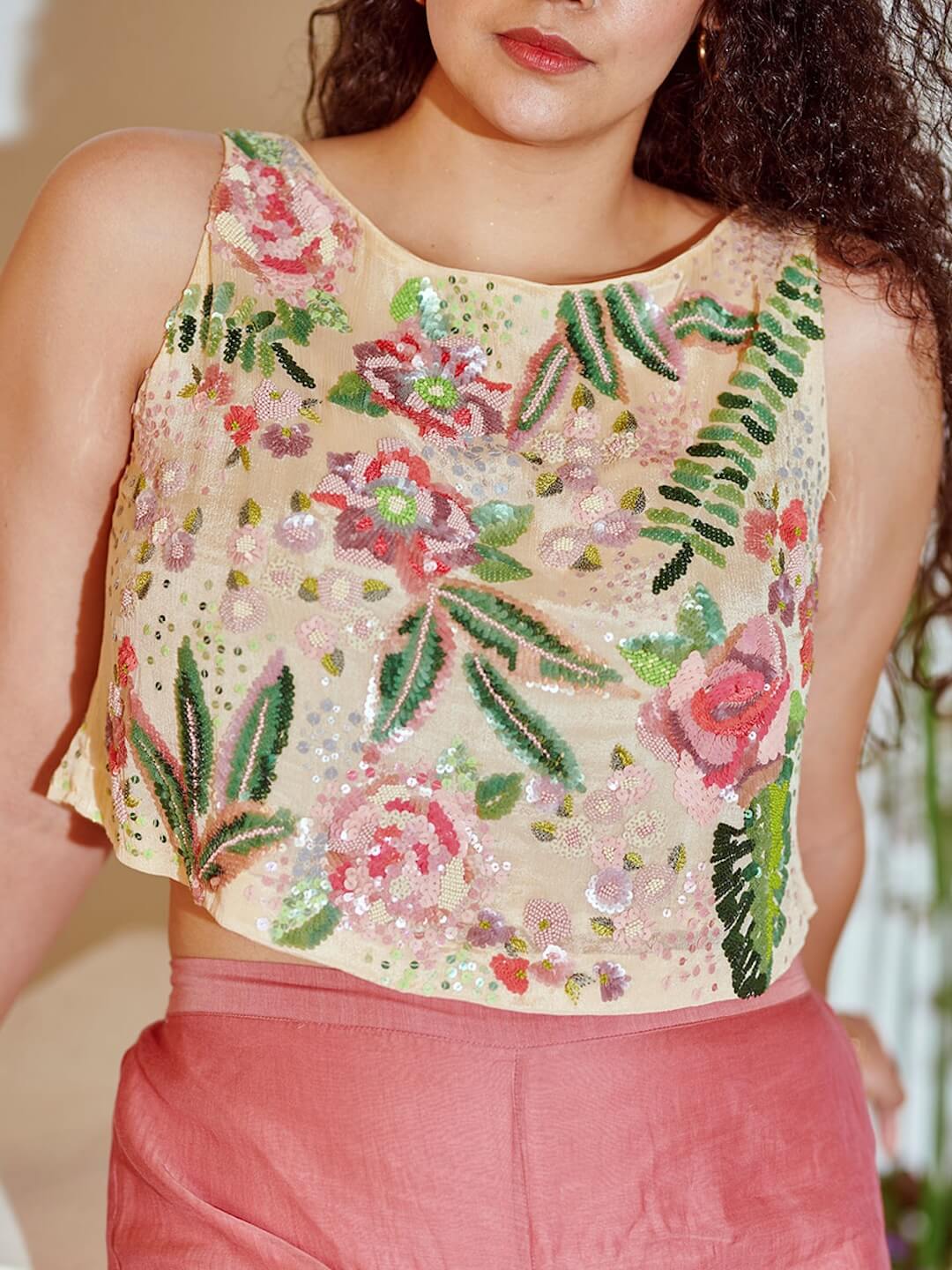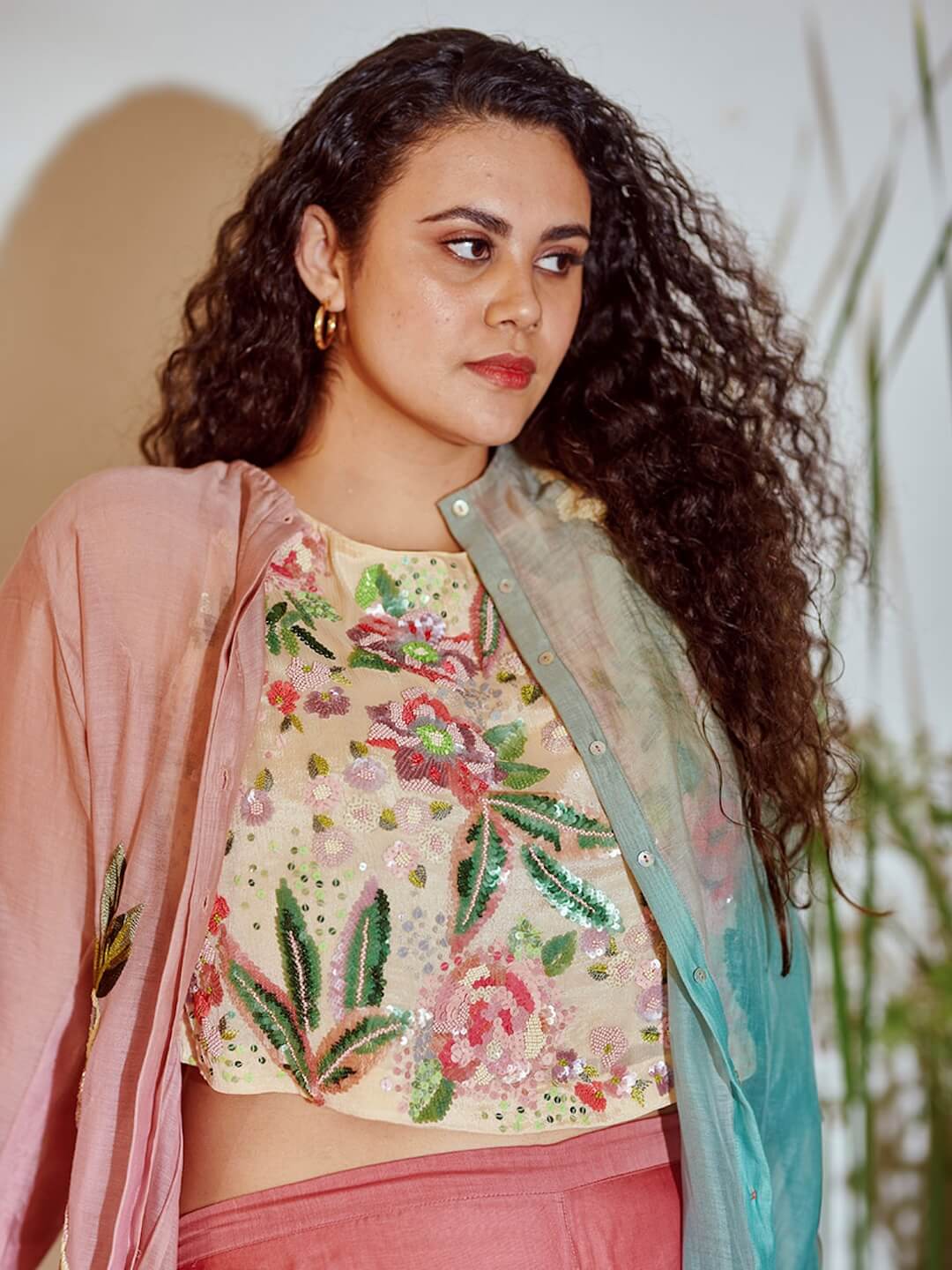 Inspired by a tropical garden, the embroidery is used like art, with pop hues against the subtle ecru background, making it a statement look. Style with a solid hue sari, or with high waist pants, or with a silk lehenga, it will be your most versatile resort wedding look.