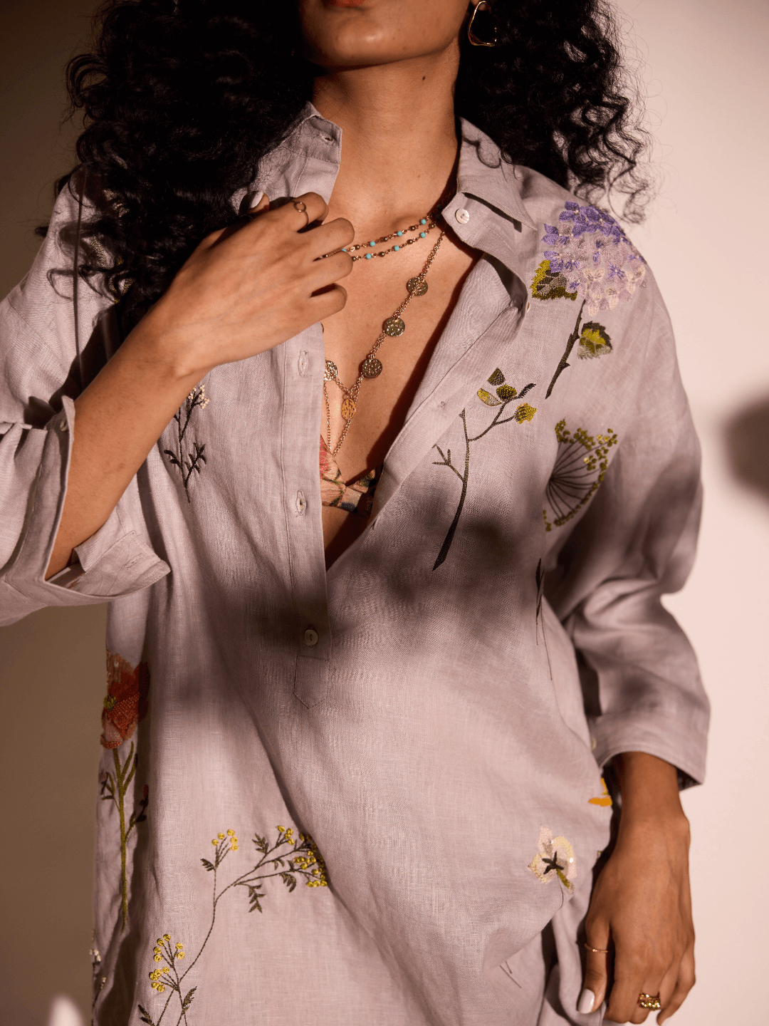 The perfect summer look! Delicate wildflower embroidery with a relaxed shirt silhouette makes this such a versatile look.