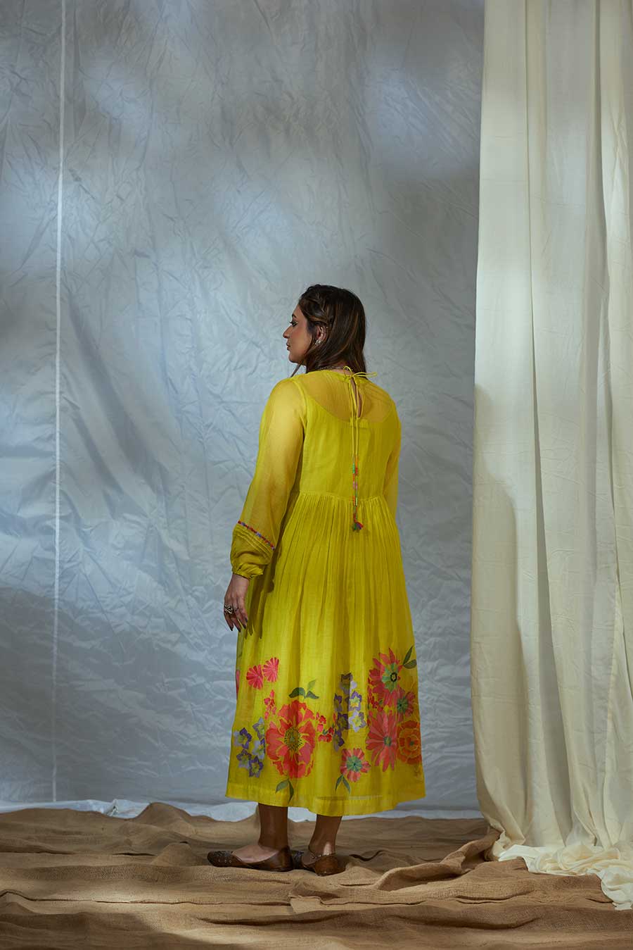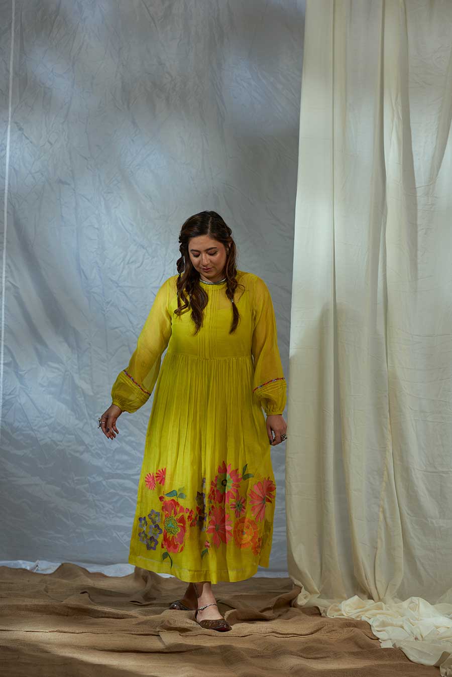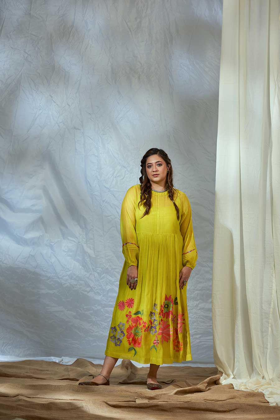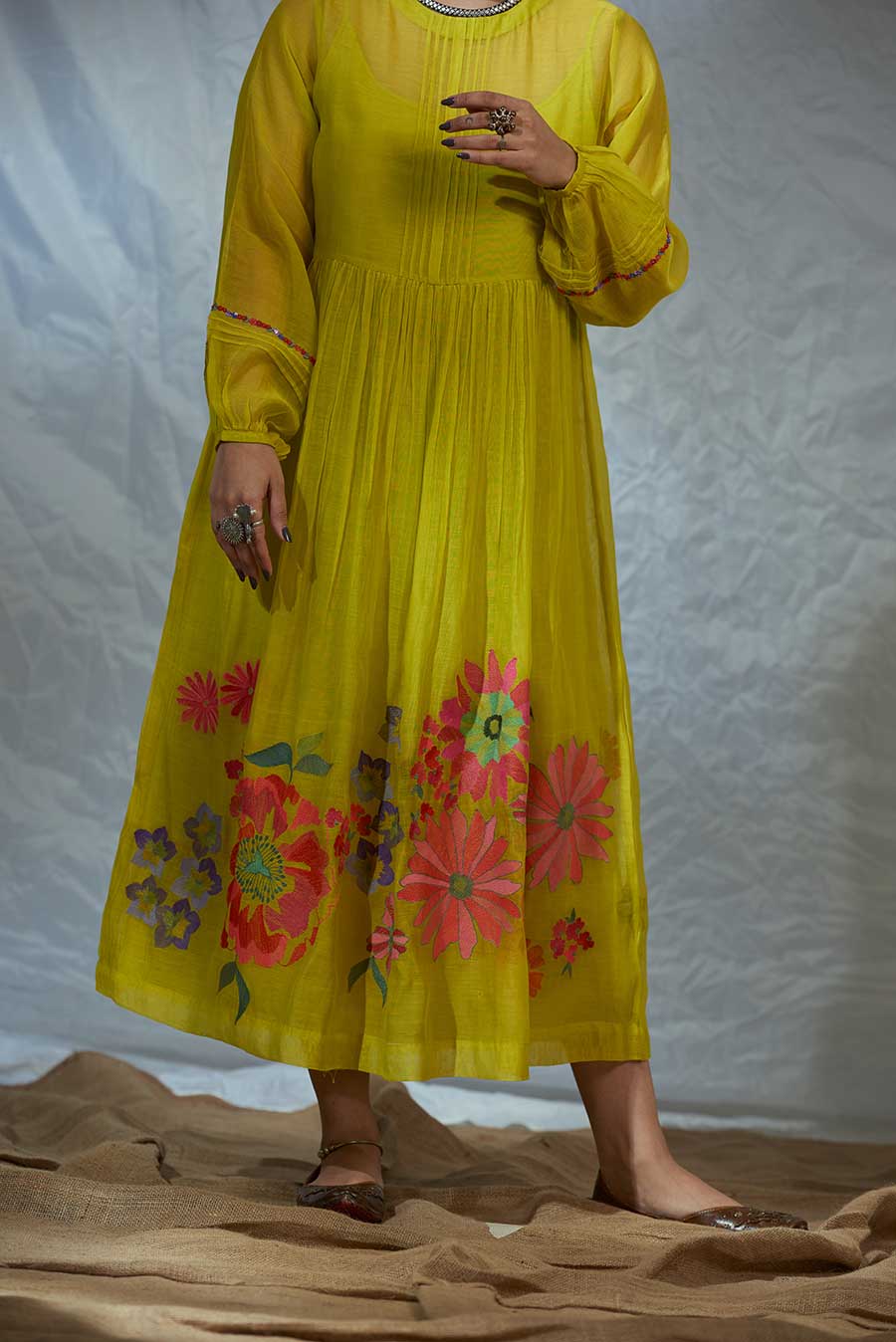 A versatile dress, it takes you from brunch to an evening out. The Indian flowers, rose & marigold embroidered delicately in pop hues, all around the bottom hem of the dress. A fun & relaxed silhouette, styled with jewelled flats, gold hoops, and a side braid.